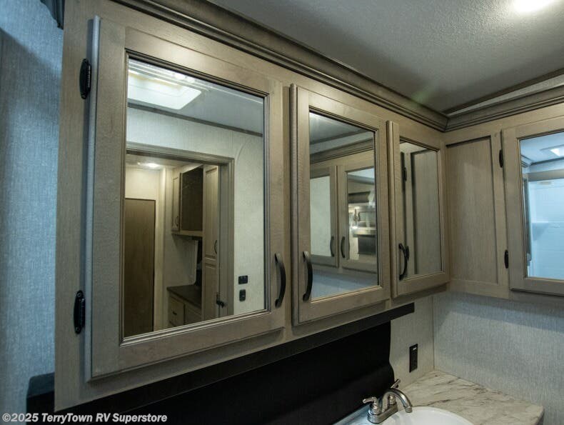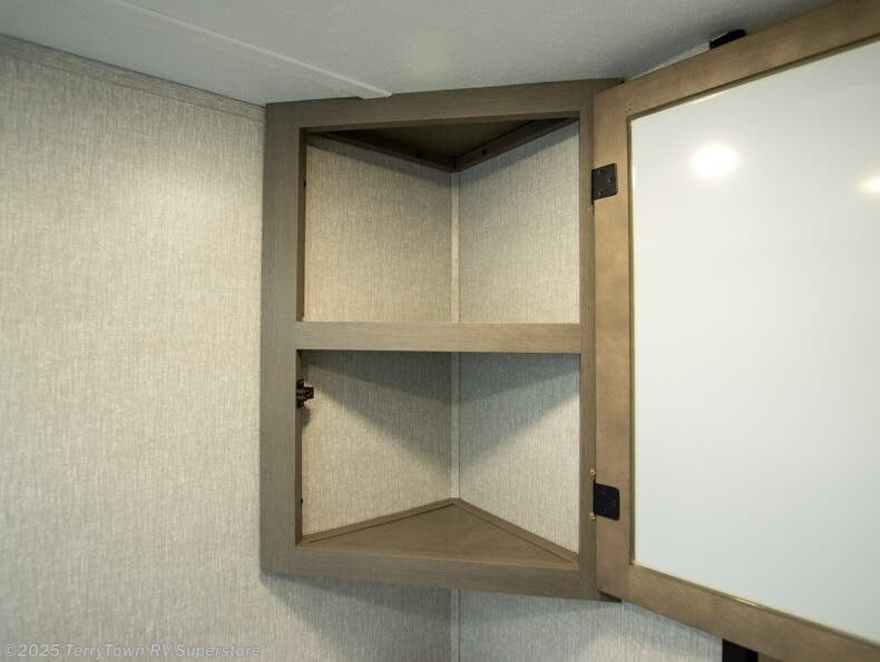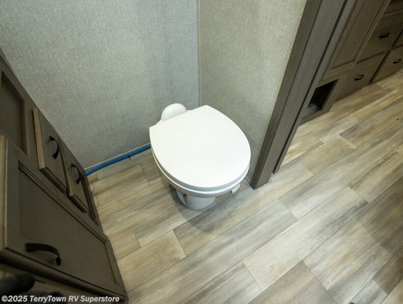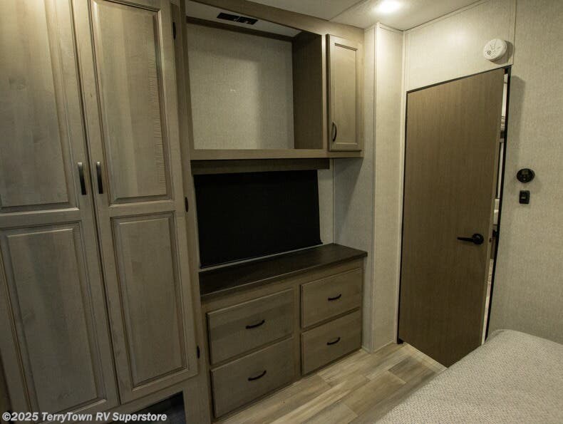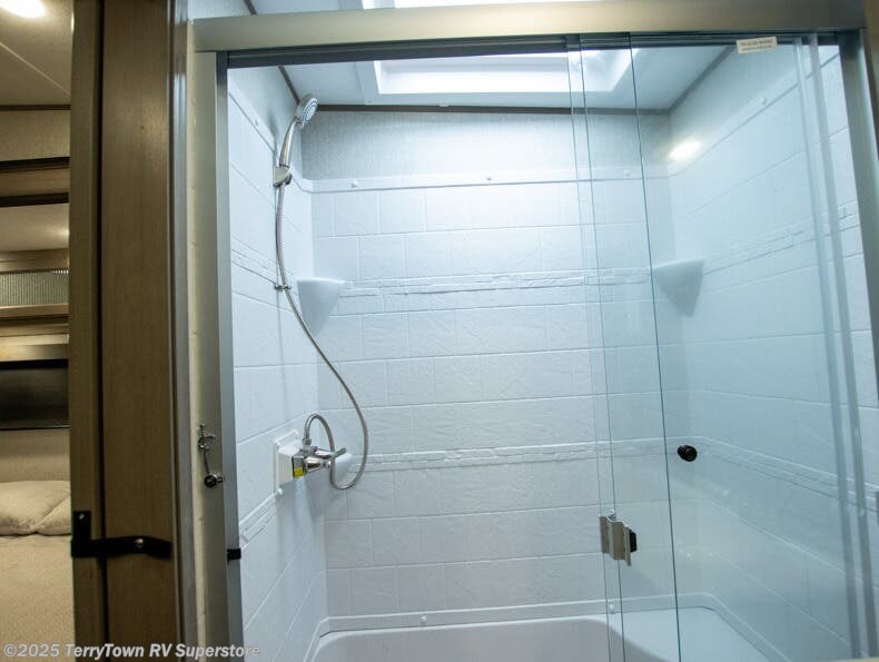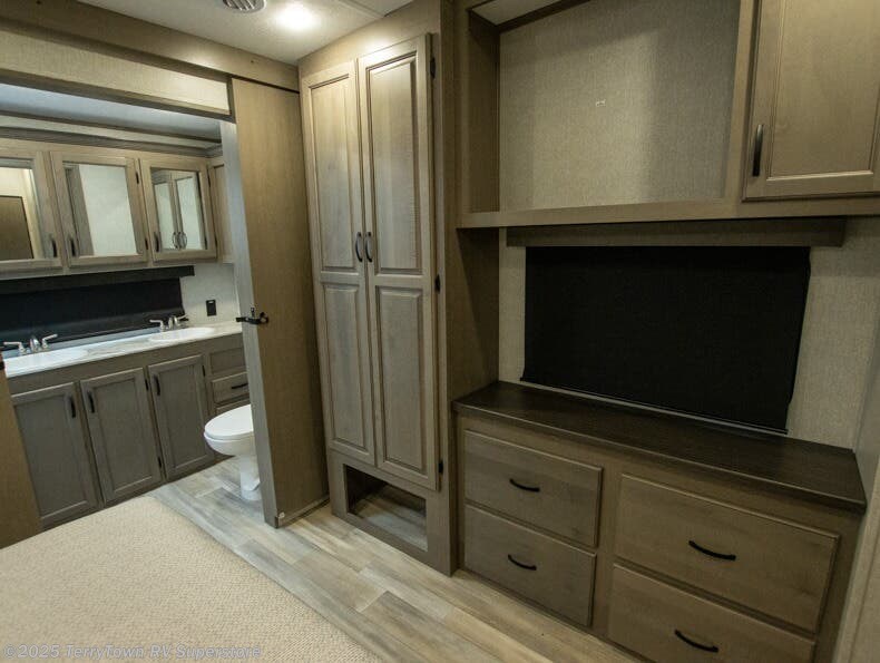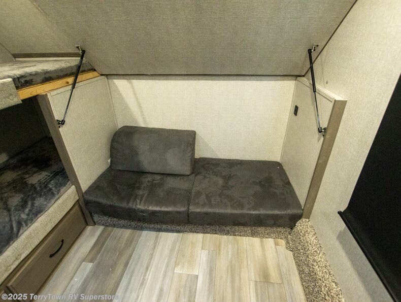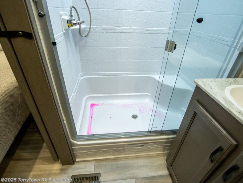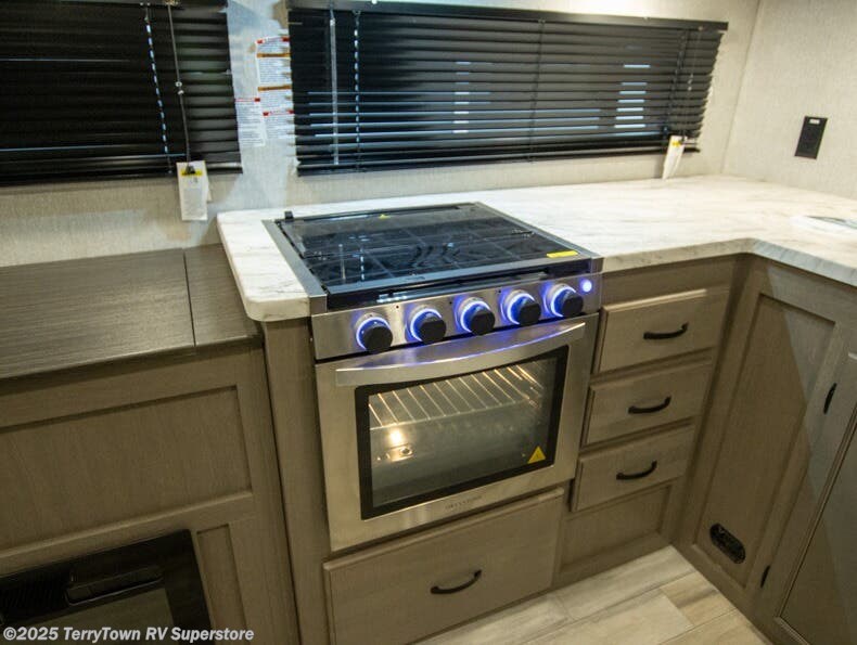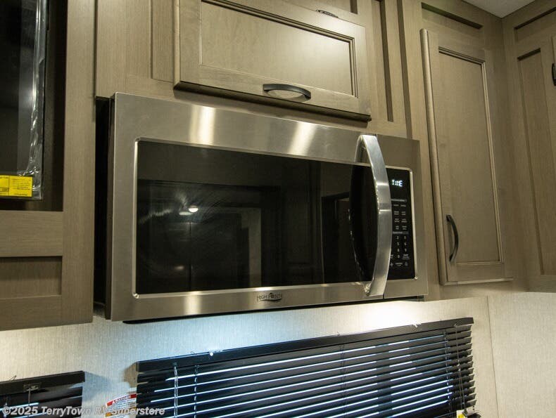 Two full baths, double slides, and sleeping space for ten make this the perfect fifth wheel for families or larger groups. The front bunkhouse includes triple bunks, a hide-a-bed cube sofa, plus a wardrobe for clothes. You will love having the master suite all to yourselves with a queen bed slide out, a wardrobe, plus dual bath sinks in the rear bath. Everyone can meet in the main living area in the evening to dine around the U-shaped dinette or relax on the tri-fold hide-a-bed sofa. You can add an optional 50" TV to the entertainment center if you enjoy movies while you camp. Some of your favorite features in the kitchen will be the extra deep farm style single basin sink, the stainless steel appliances, and the large transom window at the cooktop for a great view outdoors!