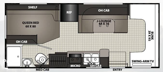Additionally, the camper has an overhead cab bunk and a convertible dinette for sleeping.