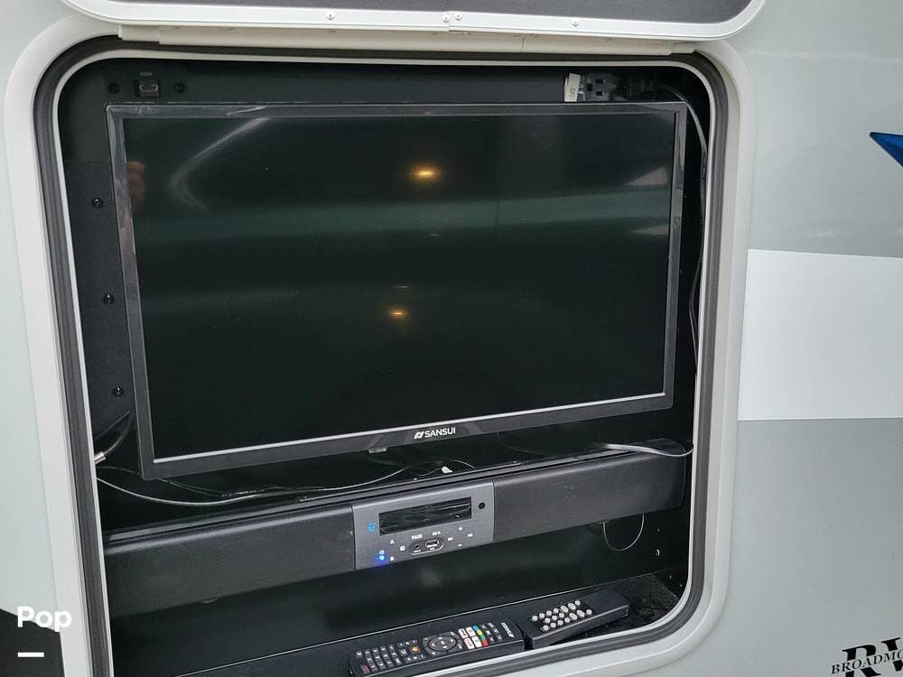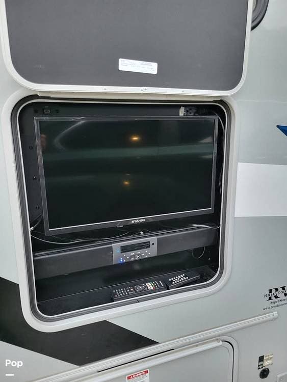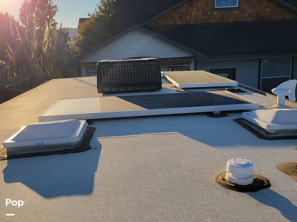 Entertainment includes a 32-inch TV on a swing arm, Bluetooth radio, and exterior speakers under the 16-foot awning. A solar panel on the roof keeps the upgraded Lithium batteries topped off.