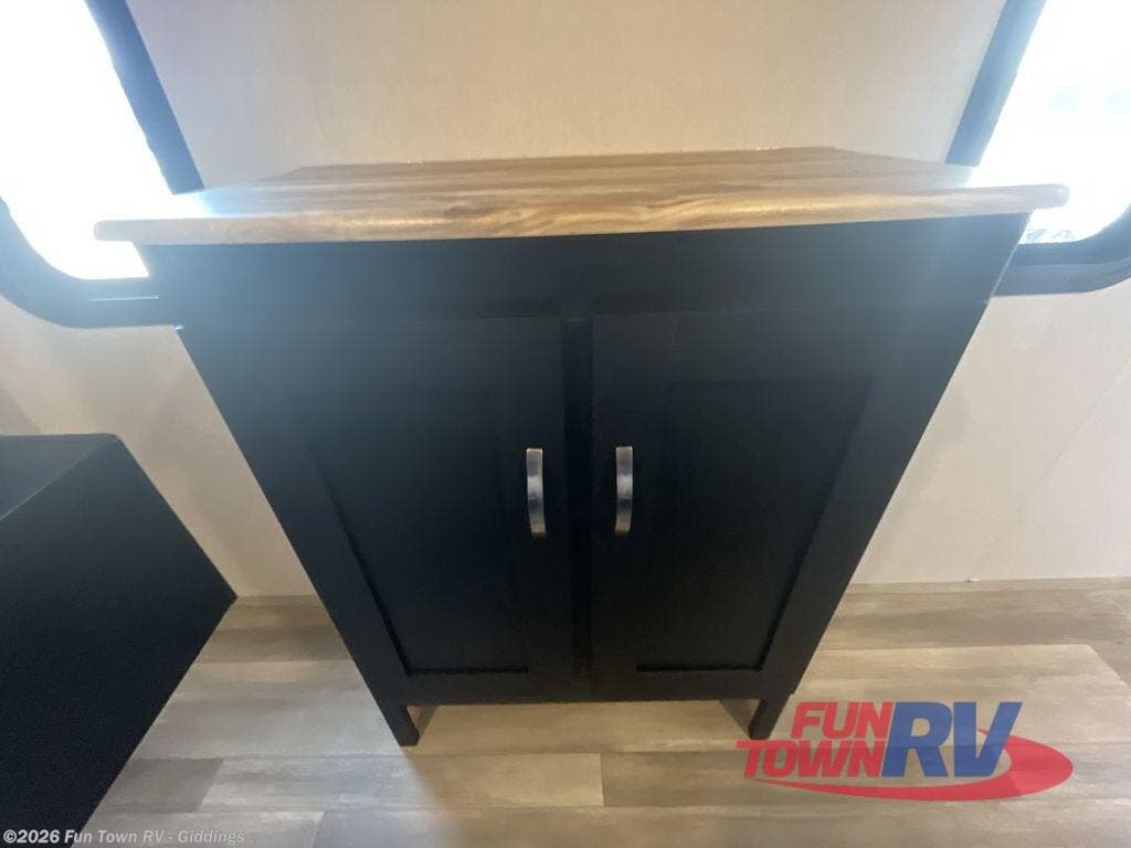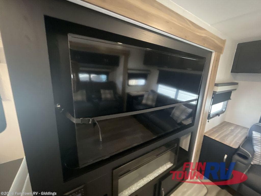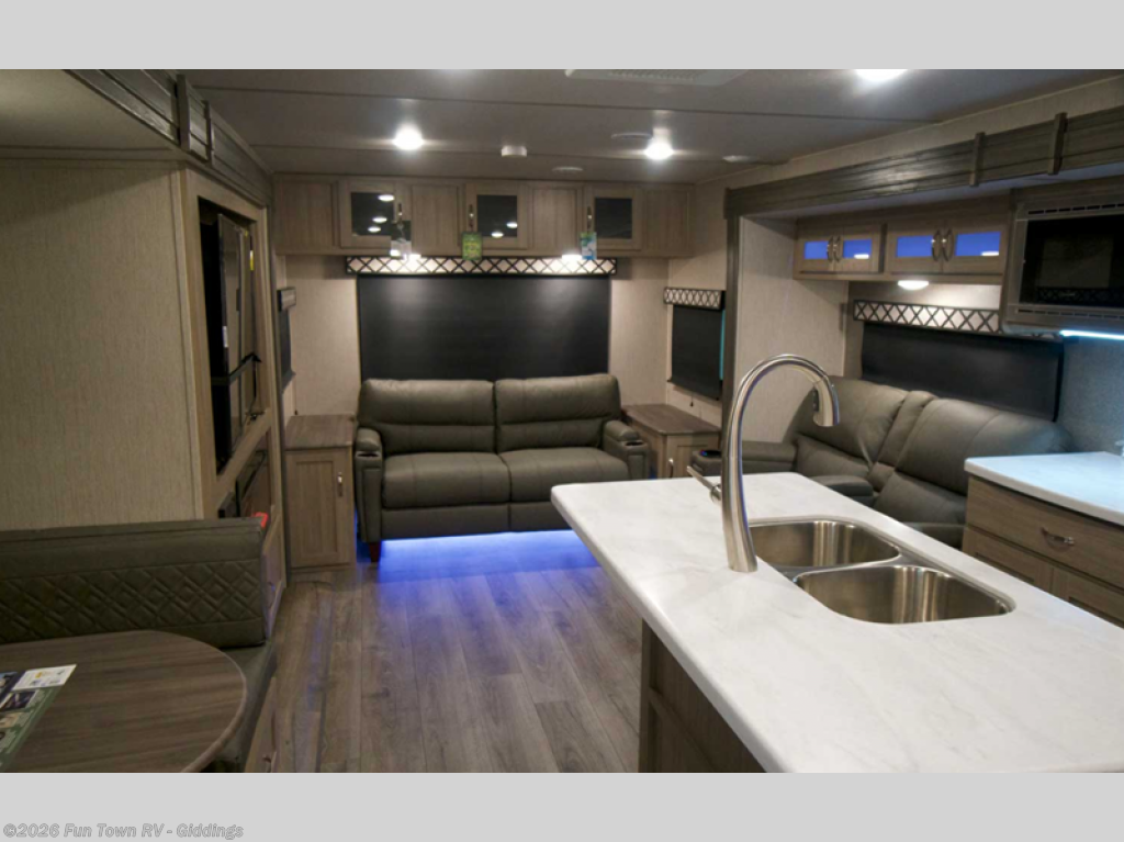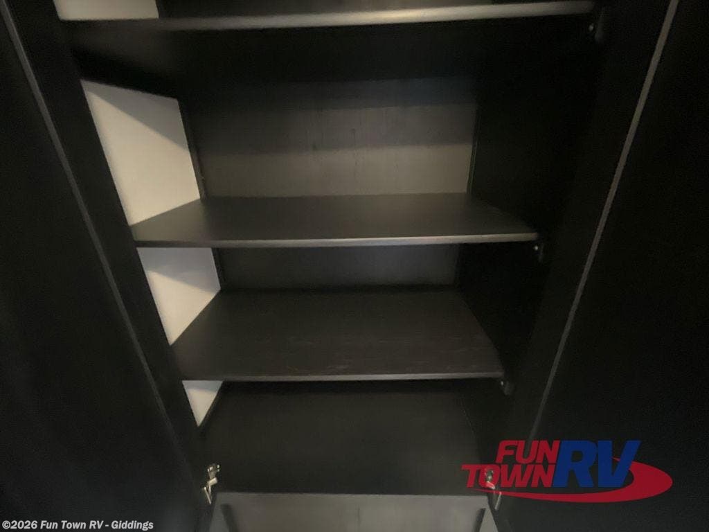 This spacious trailer offers dual opposing slides in the main living and kitchen area and a queen bed slide in the bedroom giving you lots of floor space in both areas! The kitchen offers full amenities including a large pantry, extra counter space, a center island, and a booth dinette. And the cook will be able to enjoy the LED TV and fireplace while making meals. Everyone can relax on the theater seats and the hide-a-bed sofa with end tables when visiting, and the furniture can double as sleeping space if needed. You will have your own bedroom to unwind with plenty of storage in the dressers and wardrobes. And the full bathroom offers a shower, linen storage and laundry bag, plus extra counter space for your toiletries.