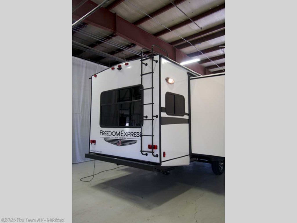 With any Coachmen Freedom Express Liberty Edition travel trailer, there is aluminum cage construction, vacuum bonded interior and exterior walls with Azdel composite, a heated and enclosed underbelly for four seasons of travel, and Tufflex PVC roofing. Some other features include hidden hinge cabinetry, Carefree flooring, a porcelain toilet, and the AIR 360+ amplified omnidirectional VHF/UHF, FM and WiFi antenna with optional 4G LTE Gateway add-on. And the required Express Pack includes an exterior griddle with side table, 50 AMP service, frameless windows and a ladder to reach the roof.