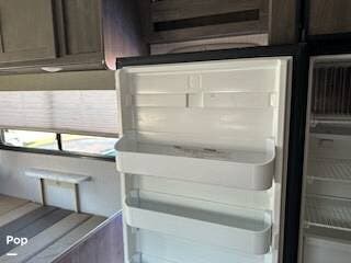 The kitchen includes a three-burner cooktop, microwave, and a 10 cu ft 12-volt double-door refrigerator, so you're not sacrificing everyday comforts.