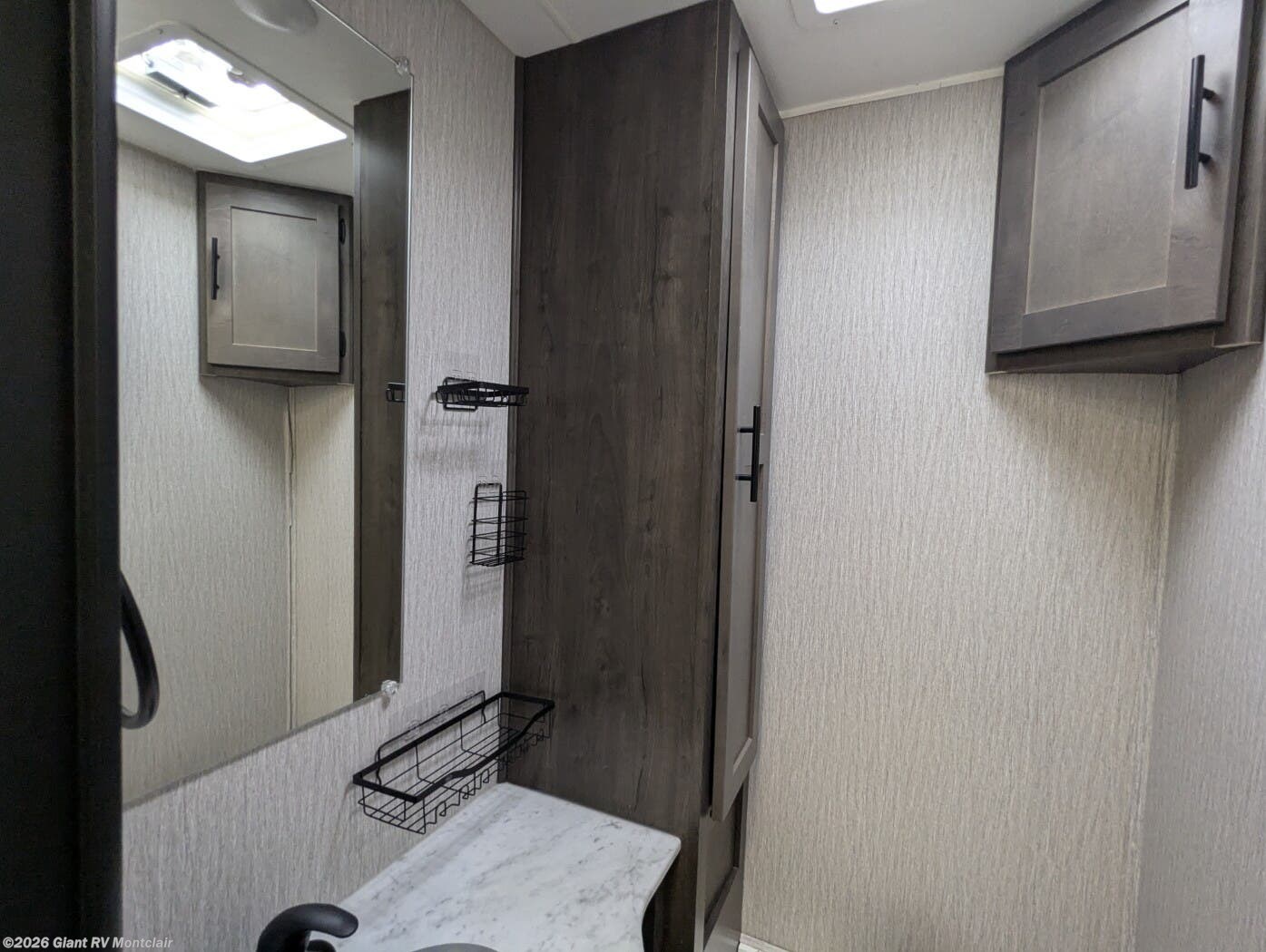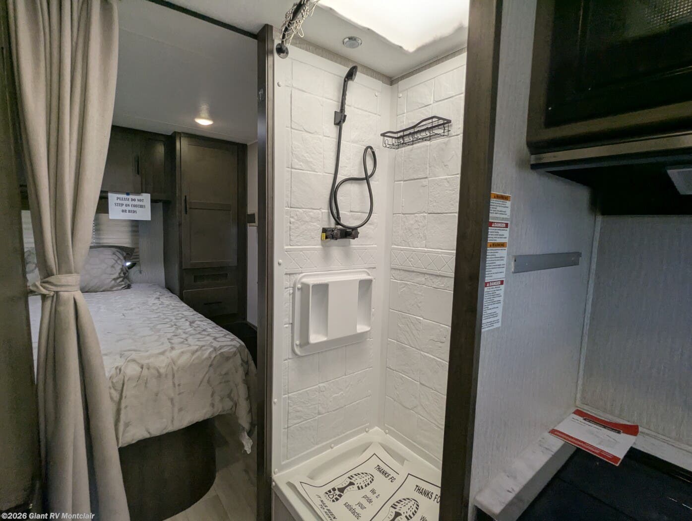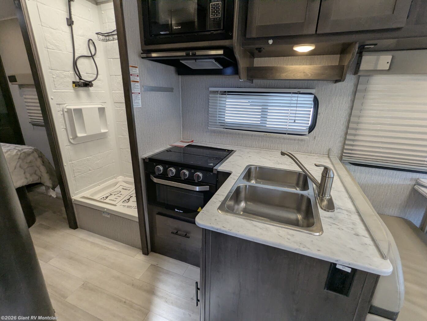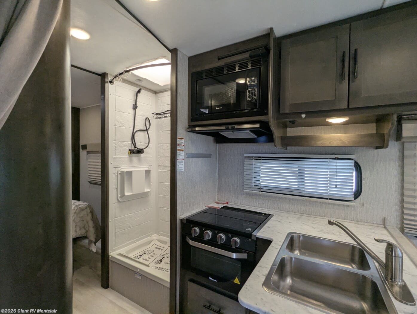 - Functional Galley & Full Bath featuring a cooktop, microwave, refrigerator, solid-surface countertops, ample cabinetry, and a full bathroom with shower — all designed for convenience on the road.