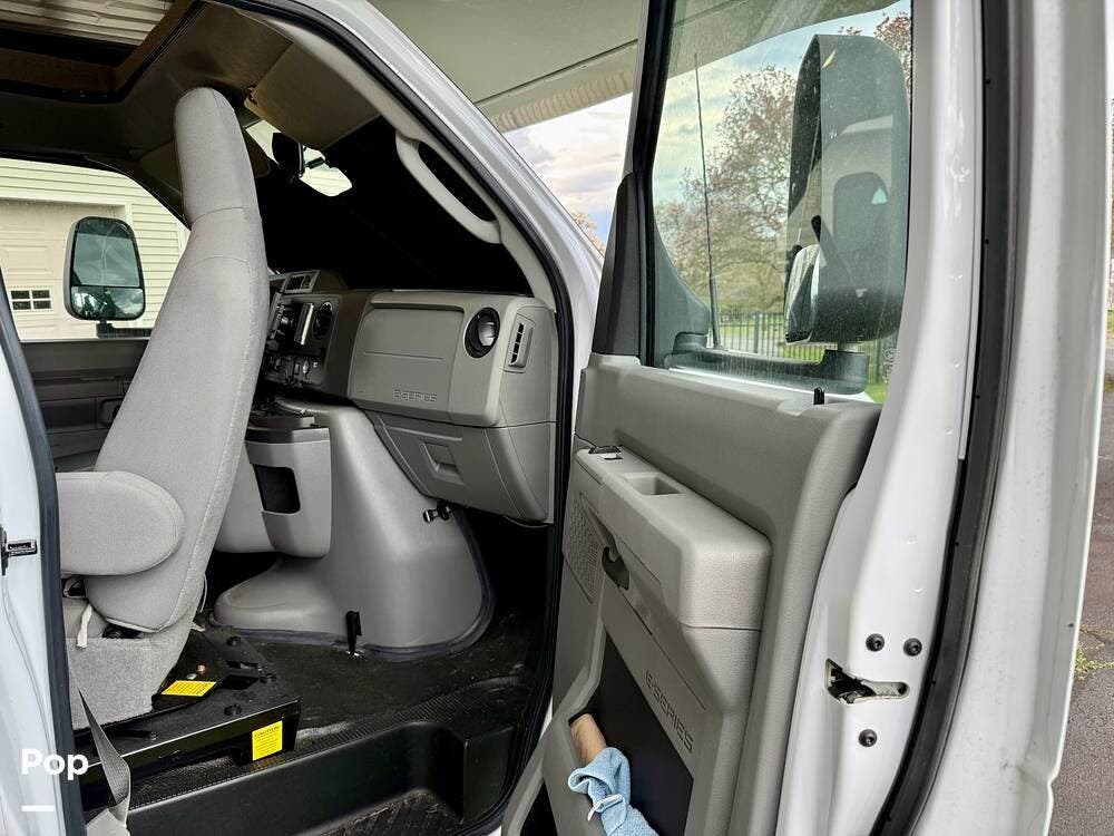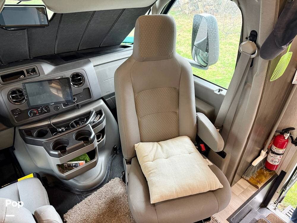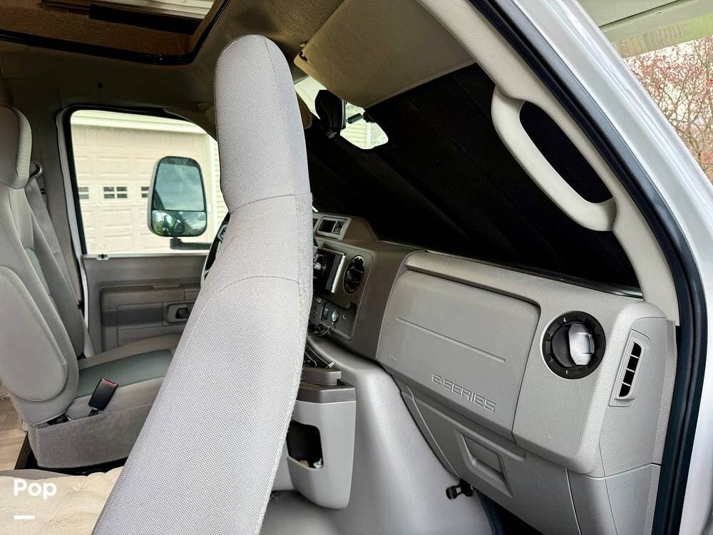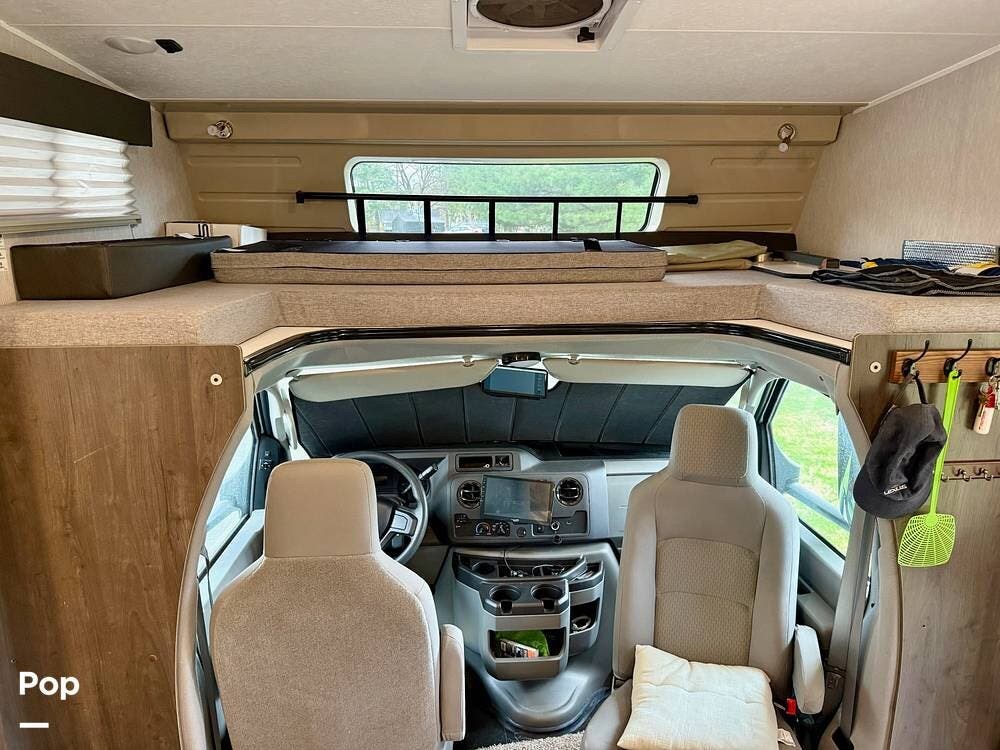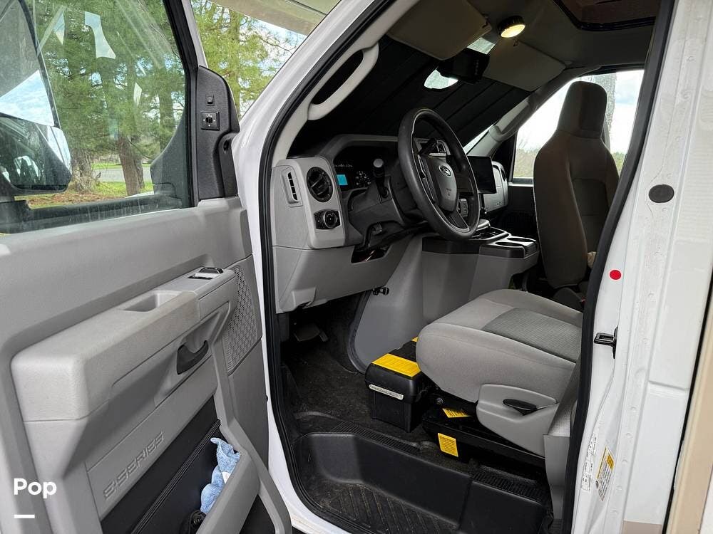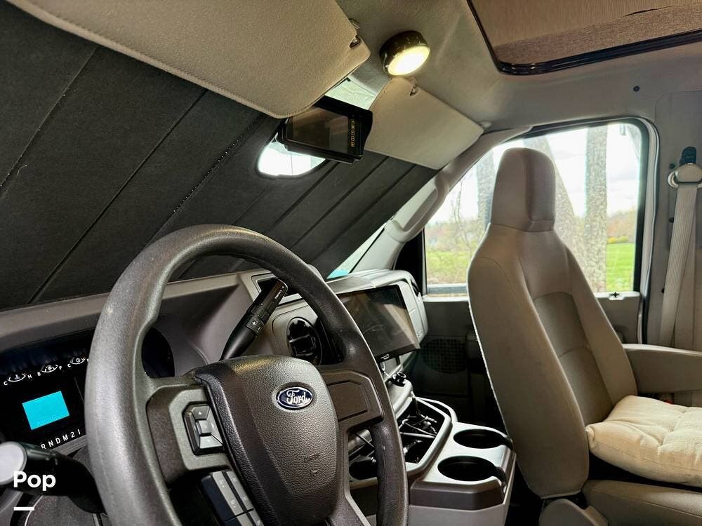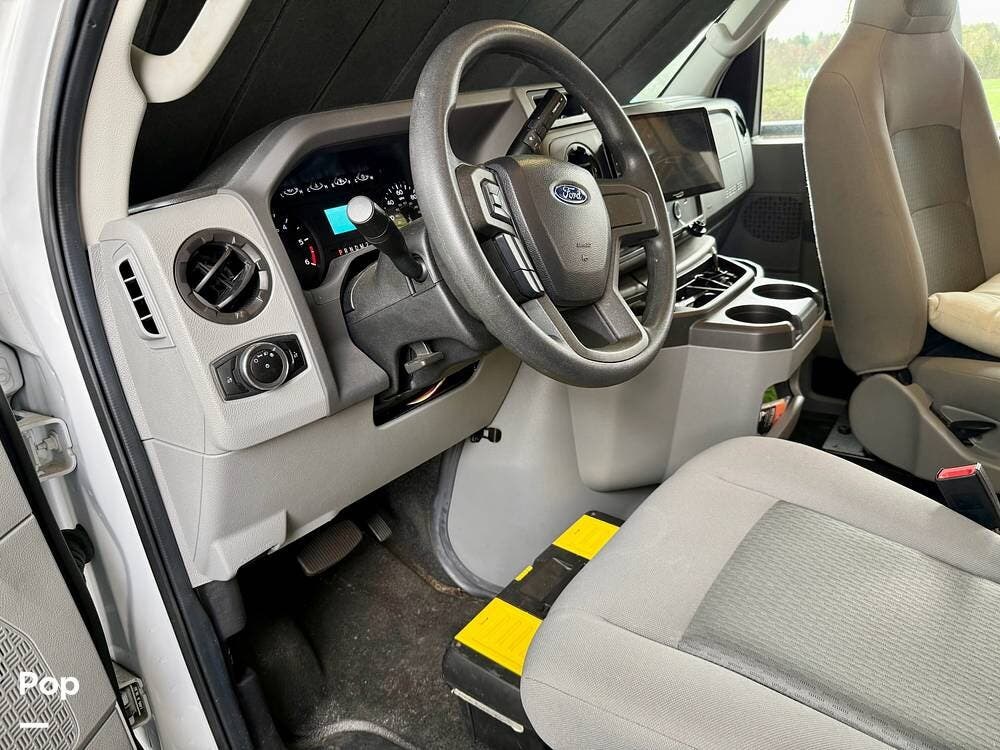 The Ford E-450 cockpit features Apple CarPlay/Android Auto, rear- and side-view cameras, and offers an easy-to-drive experience with the added sleeping capacity of an overhead bunk.