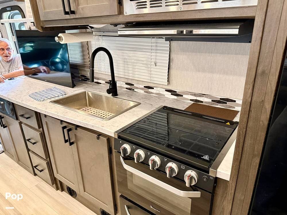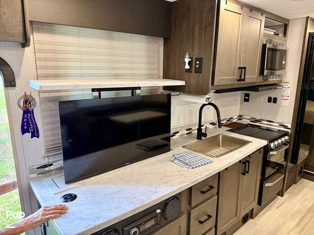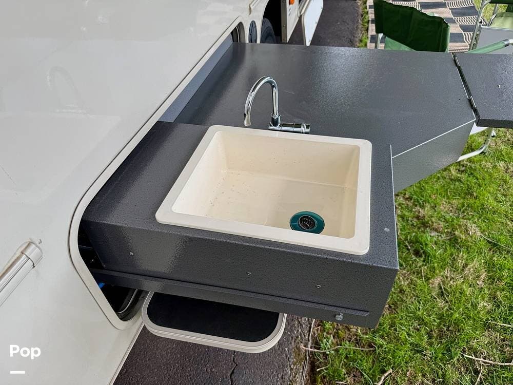 Outside, stay cool under the large 21' awning, cook in the outdoor kitchen with LPG grill, and relax in front of the outdoor entertainment center.