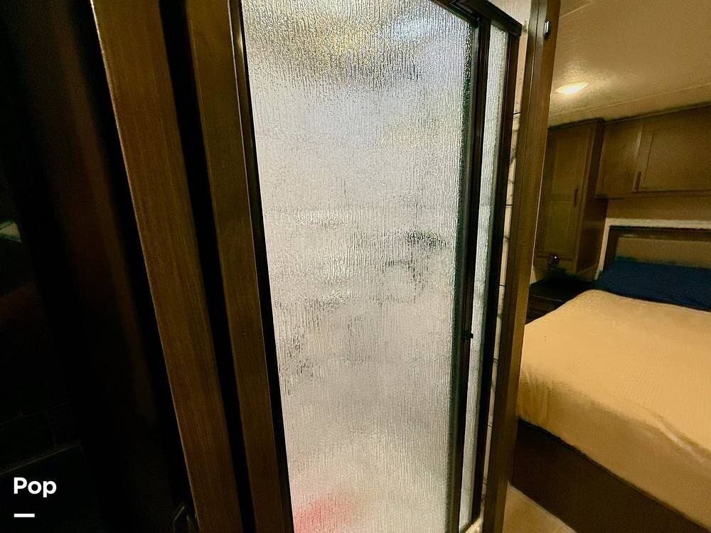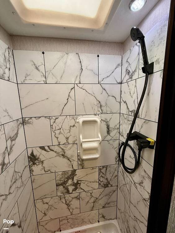 Mid-coach, a half-bath with an opposing shower can be closed off from the front of the coach, creating a full-sized, private, master bath.