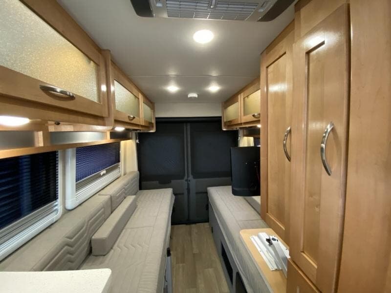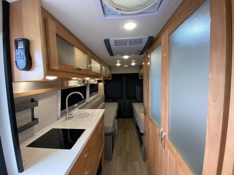 Hit the road and enjoy each journey in this Nova Class B coach. Once you park for the day, you can swivel the captain's seats around and enjoy coffee at the removable cockpit table. Lunch can be made on the induction cooktop, and the cold ingredients can go back in the 7.3 cu. ft. refrigerator. The convenient wet bath allows you to freshen up after a day exploring, and when you're ready to turn in for the night you can choose from either two 75" x 26" beds, or combine them to create a 75" x 73" bed instead. You will find ample storage in overhead cabinets along each side, beneath the bed, plus there is an extra wardrobe on the roadside as well.