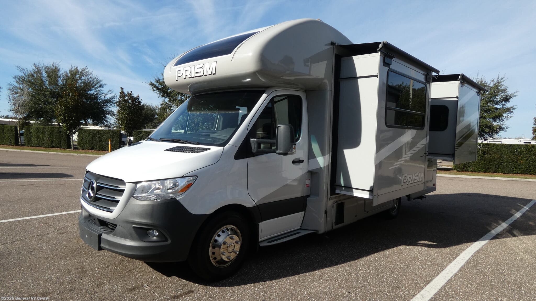 Experience the freedom of the open road with the 2023 Coachmen Prism Select 24DS, where luxury meets practicality in a compact yet spacious design. This elegant RV, built on the reliable Mercedes-Benz Sprinter 3500 chassis, combines the power of a V6 engine with 188 horsepower and 325 torque, ensuring a smooth journey wherever your adventures take you. At just under 25 feet in length, this motorhome is designed for maneuverability without sacrificing comfort. The interior layout features a center kitchen equipped with a mid-size electric refrigerator and a three-burner cooktop, perfect for crafting delicious meals on the go. The Prism Select 24DS offers versatile sleeping arrangements for up to five people, with a cozy queen bed nestled in the rear, a convertible dinette, and an additional bunk. The thoughtfully designed floorplan includes two slides that expand your living space, creating a welcoming environment for relaxation and entertainment. Enjoy the convenience of a rear bath with a shower curtain for privacy. Outside, unwind under the 14-foot powered retractable awning, perfect for enjoying the great outdoors. With its diesel engine and 24-gallon fuel capacity, this RV is ready to take you further. For more details or to explore this model in person, visit your nearest General RV dealership.