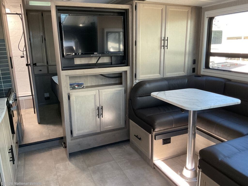 The well-appointed galley features solid-surface countertops, ample storage, and quality appliances designed for efficiency on the road. Whether you?re preparing a quick lunch or a full evening meal, the space is both functional and elegant. The comfortable living area easily converts for dining, relaxing, or entertaining, making this coach equally suited for solo travelers or couples.