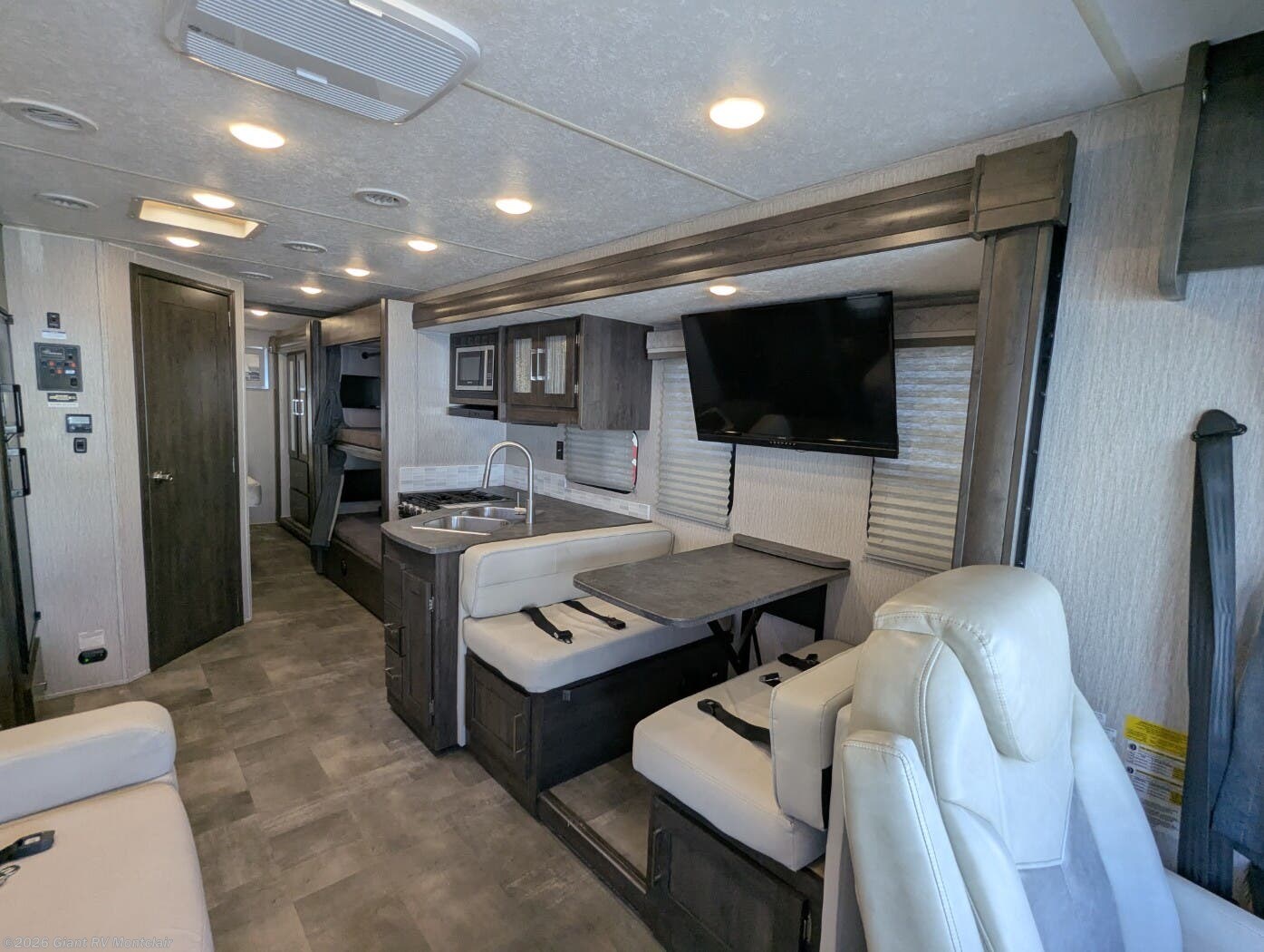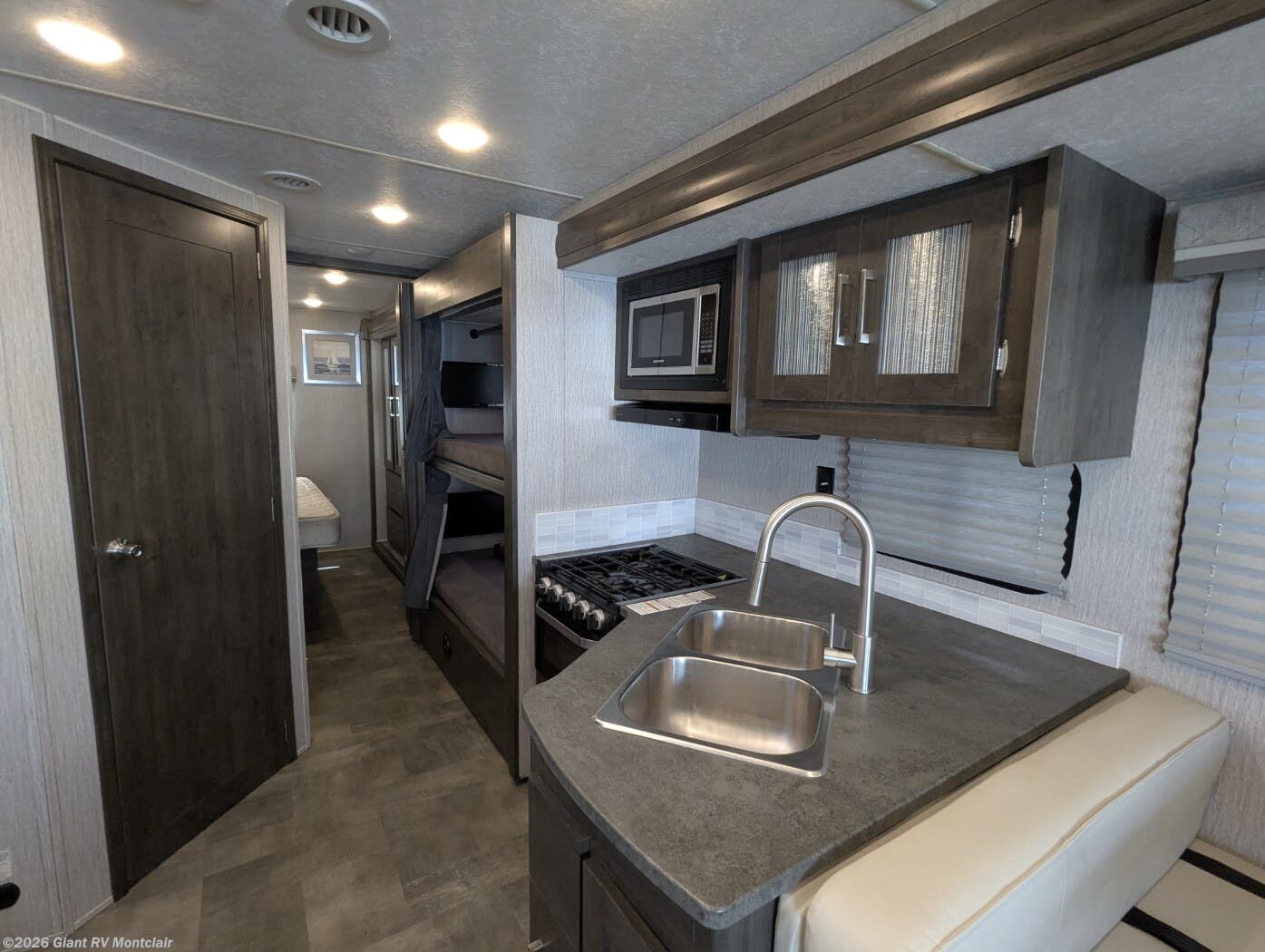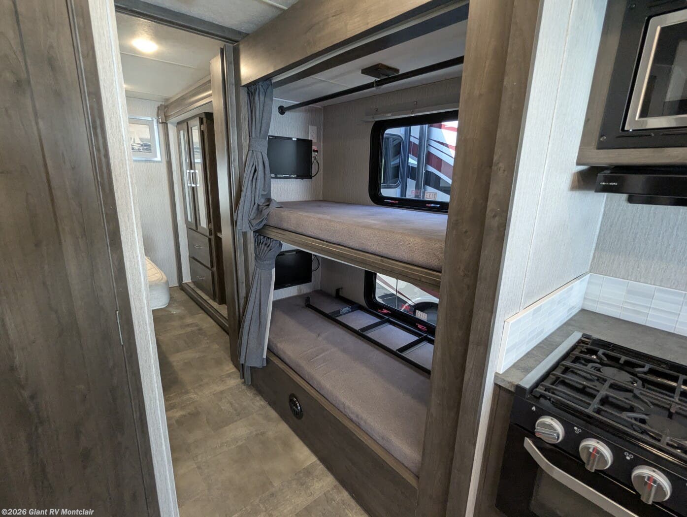 - Family-Friendly Bunkhouse: Sleeps up to 8 with bunk over cab, rear bunk beds/wardrobe, rear private queen bedroom, and one slideout for open living space.