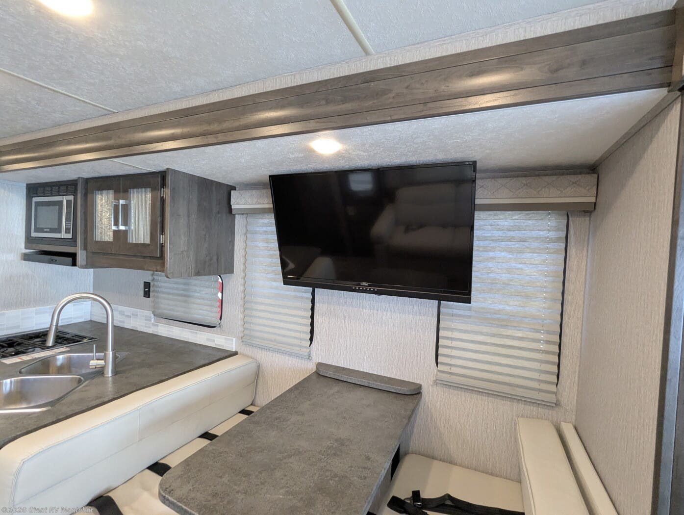 - Modern Amenities: Features dual A/C units, a kitchen with 10 cu ft 12V refrigerator, three-burner cooktop, convection microwave, and exterior LED TV for easy family living.