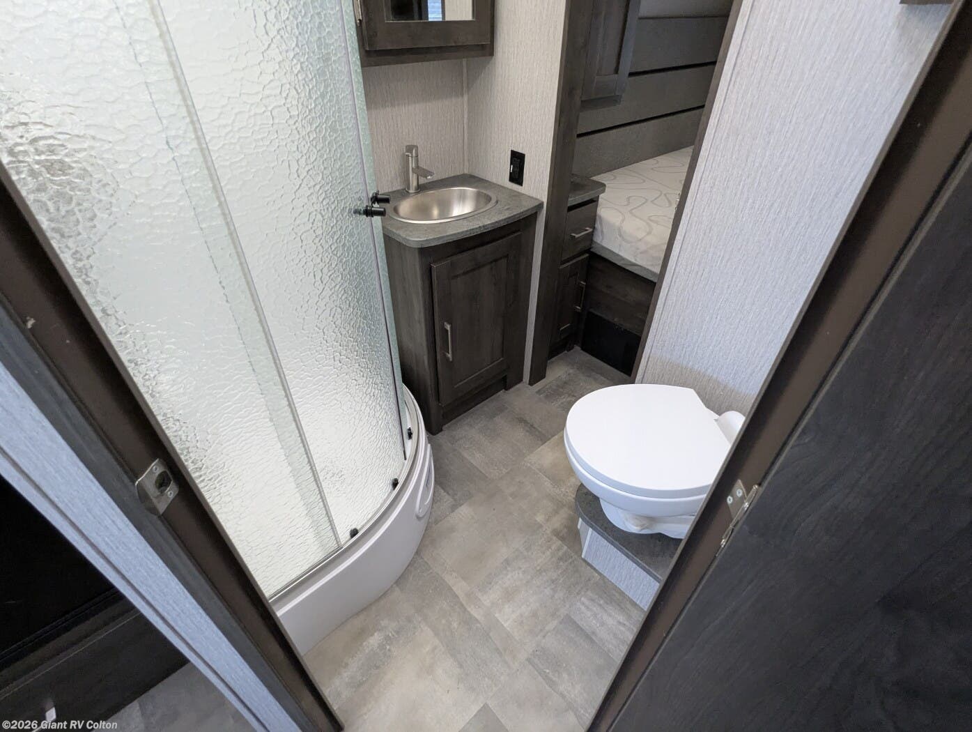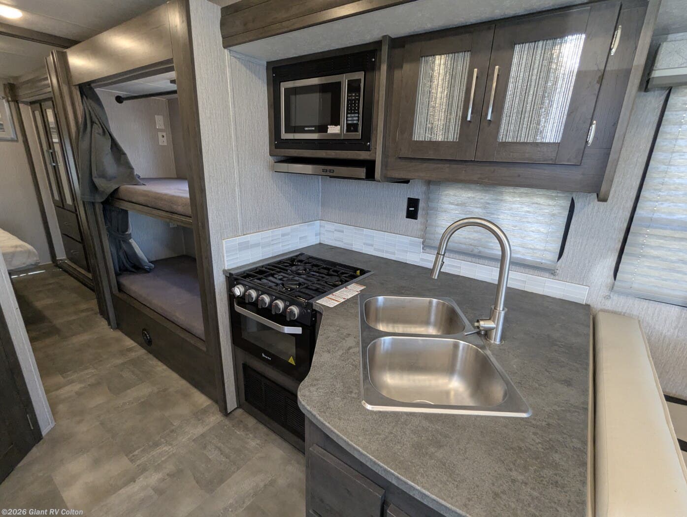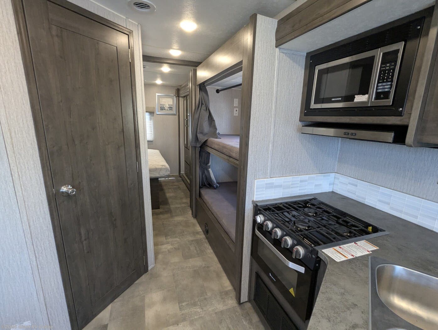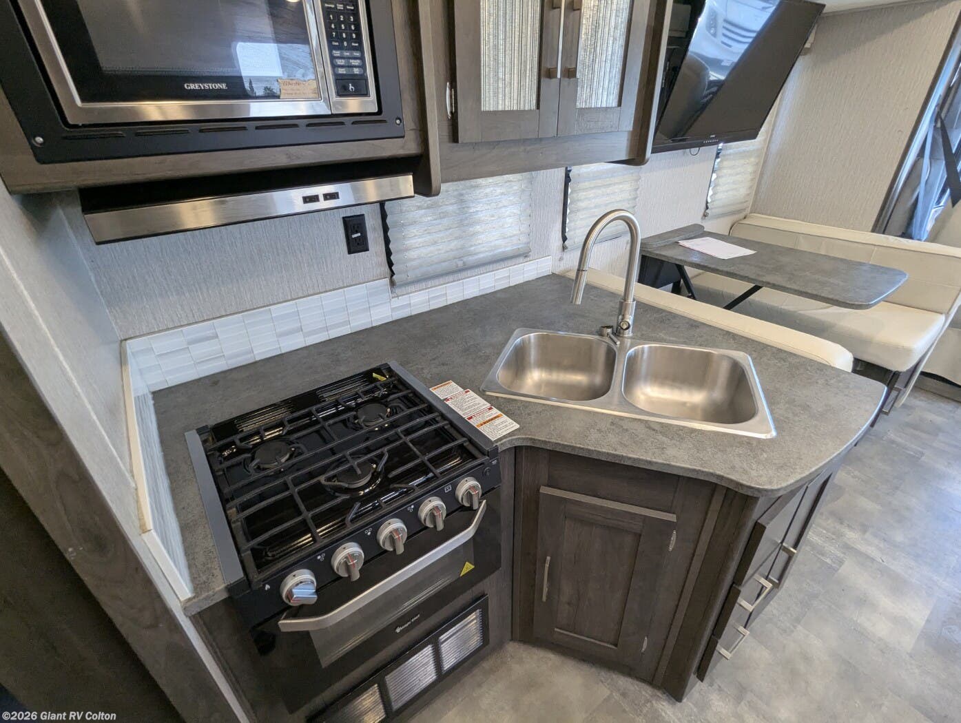 - Modern Kitchen: 10 cu. ft. 12V stainless steel refrigerator, three-burner cooktop, and convection microwave for easy meal prep.