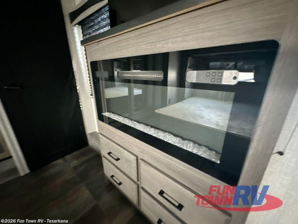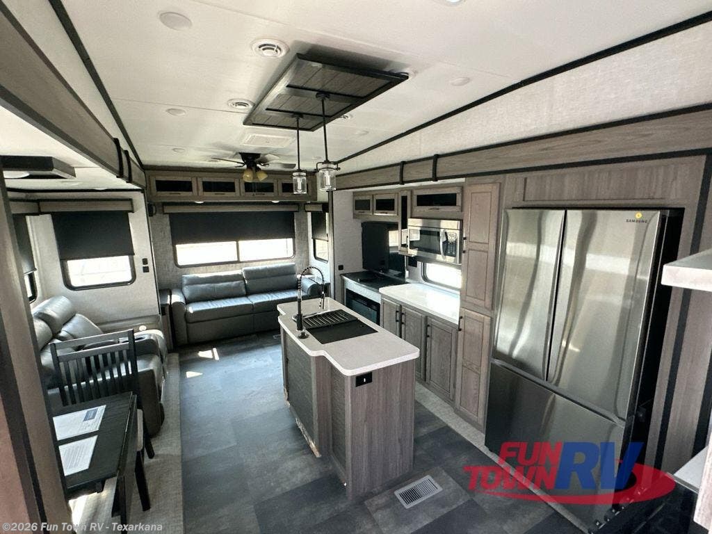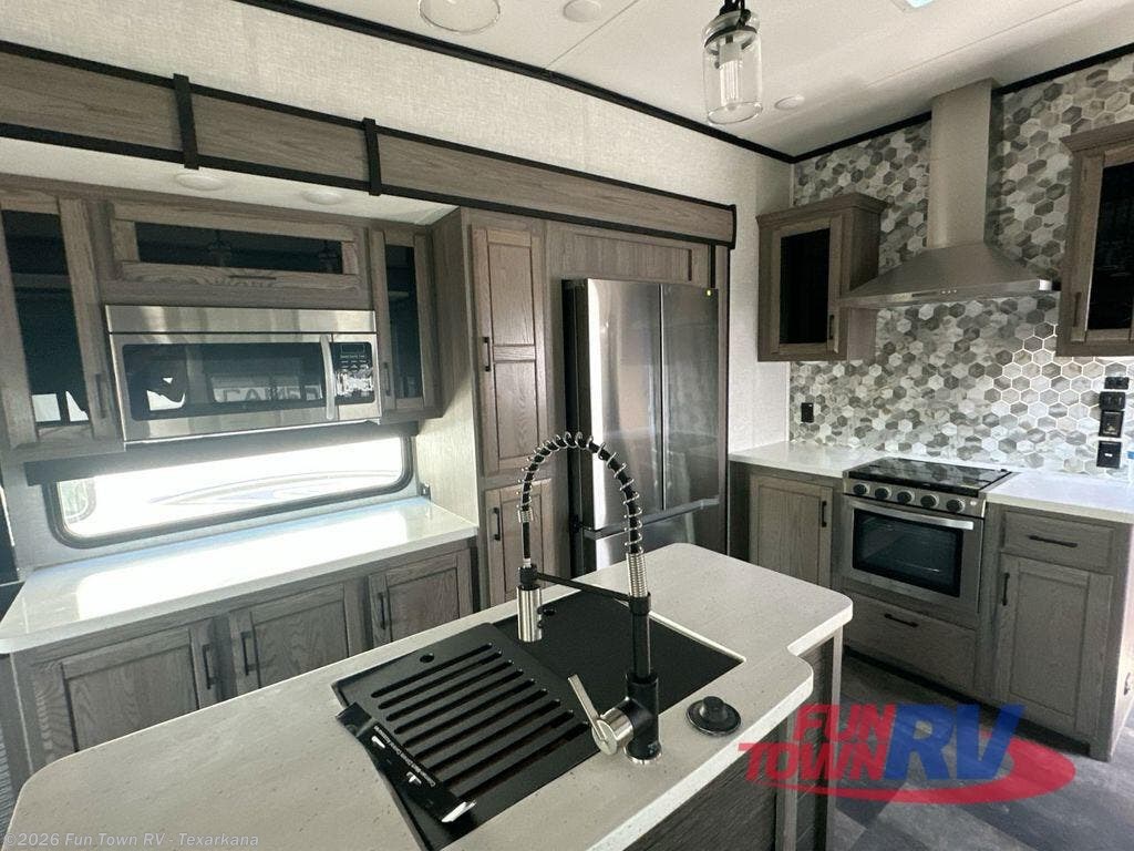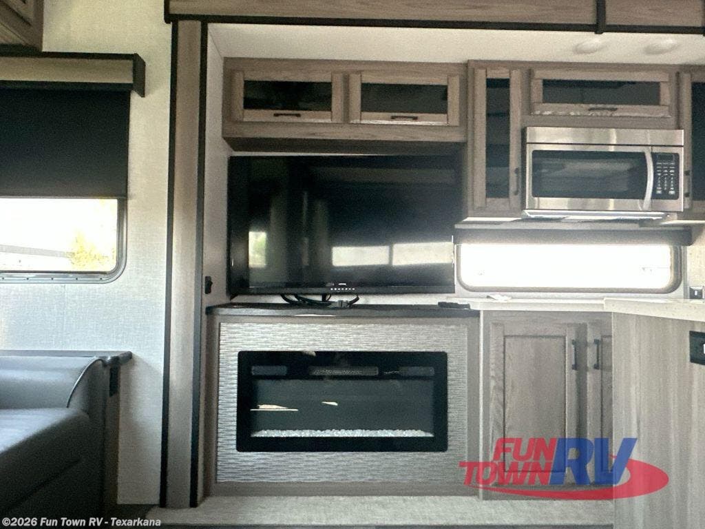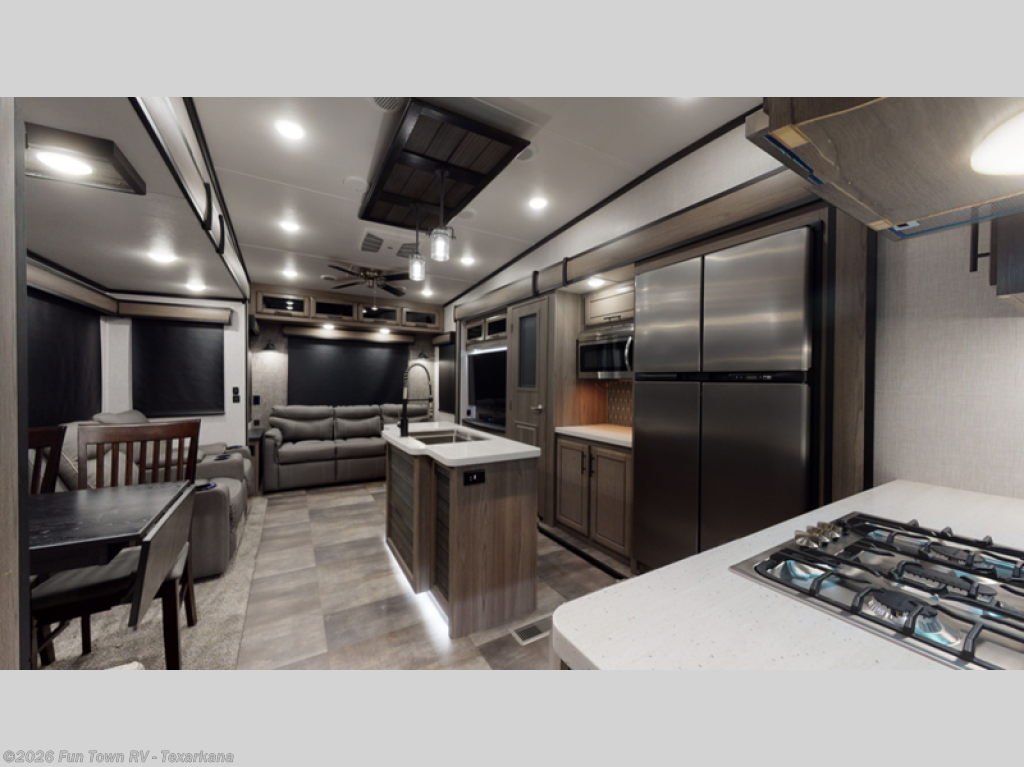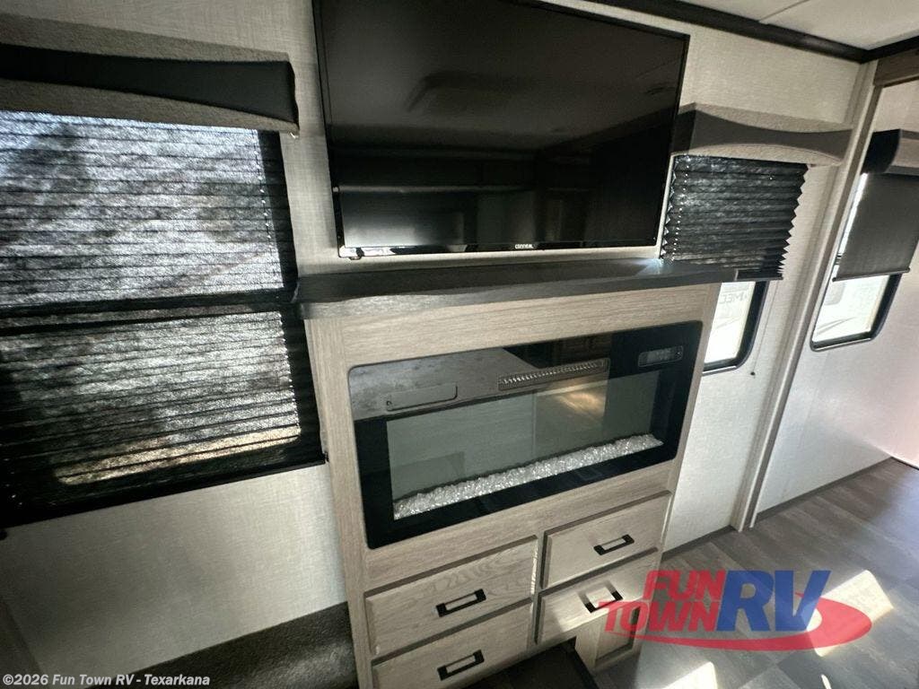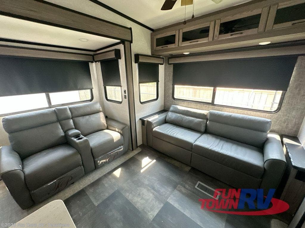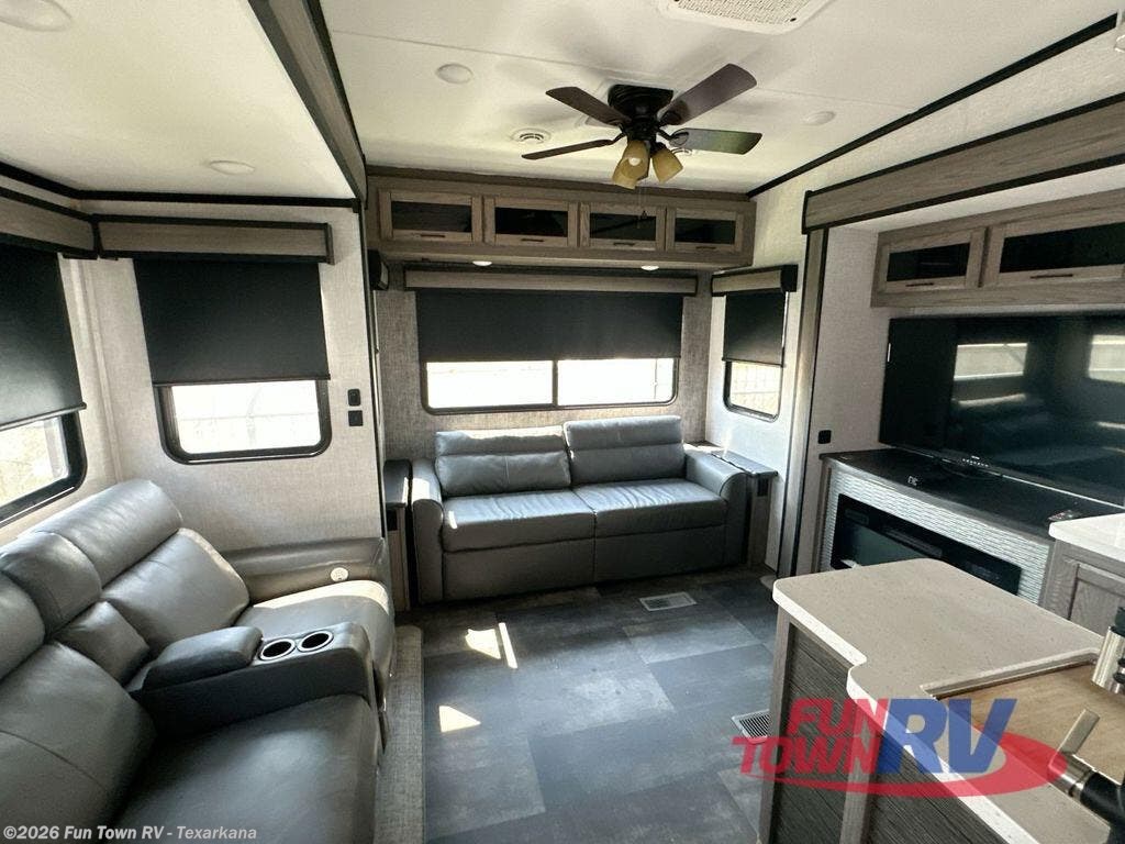 Comfort and luxury abounds throughout this fifth wheel! Starting with the dual entry bathroom which has a dual sink vanity for two to get ready at once, a 48" shower with a seat, and leads directly into the front private bedroom. Inside the bedroom is a comfortable king bed slide across from a 39" TV with a fireplace below, a dresser, and a front closet with a shoe shelf and prepped to add an optional washer and dryer. The chef can prepare their best home cooked meals with the Furrion kitchen collection and the kitchen island will make clean up easier with the stainless steel sink basin and high rise faucet with a pull out spray hose. Eat your meals and play card games a the dinette then relax on either the rear tri-fold sofa or the power theater seating across from the entertainment center with a fireplace and a 50" TV to watch your favorite movies!
