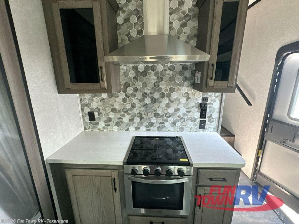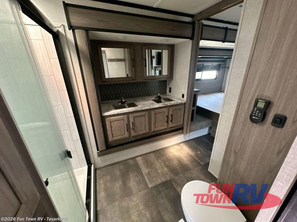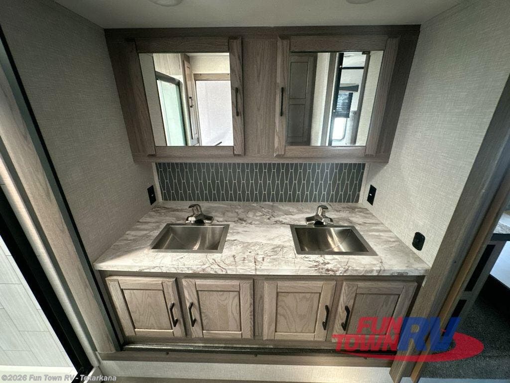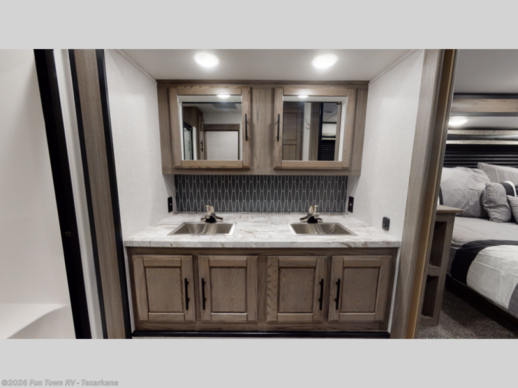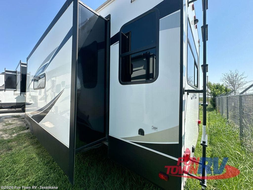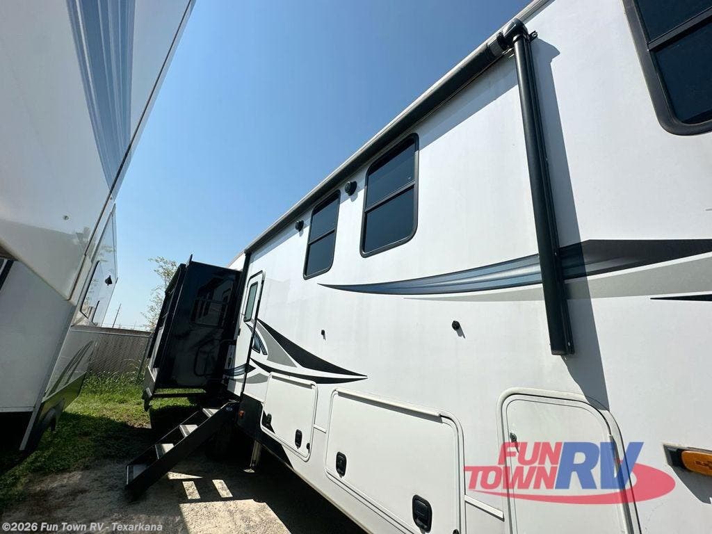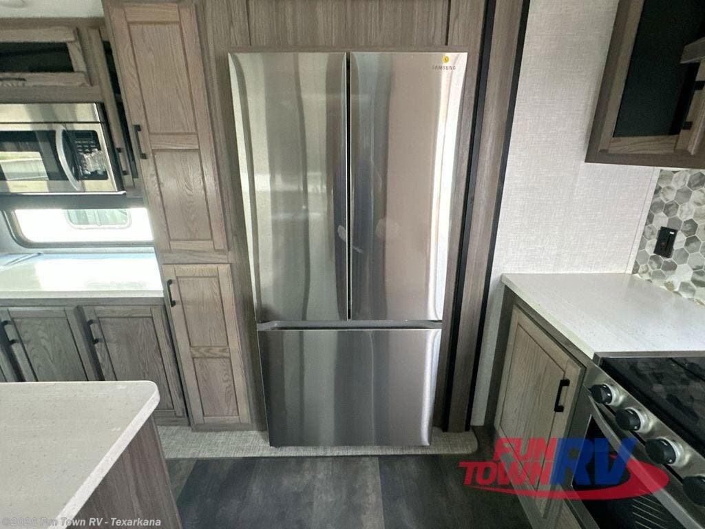 Comfort and luxury abounds throughout this fifth wheel! Starting with the dual entry bathroom which has a dual sink vanity for two to get ready at once, a 48" shower with a seat, and leads directly into the front private bedroom. Inside the bedroom is a comfortable king bed slide across from a 39" TV with a fireplace below, a dresser, and a front closet with a shoe shelf and prepped to add an optional washer and dryer. The chef can prepare their best home cooked meals with the Furrion kitchen collection and the kitchen island will make clean up easier with the stainless steel sink basin and high rise faucet with a pull out spray hose. Eat your meals and play card games a the dinette then relax on either the rear tri-fold sofa or the power theater seating across from the entertainment center with a fireplace and a 50" TV to watch your favorite movies!