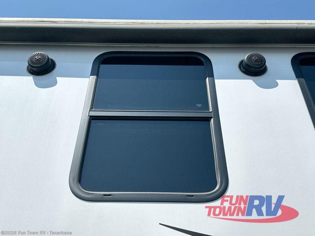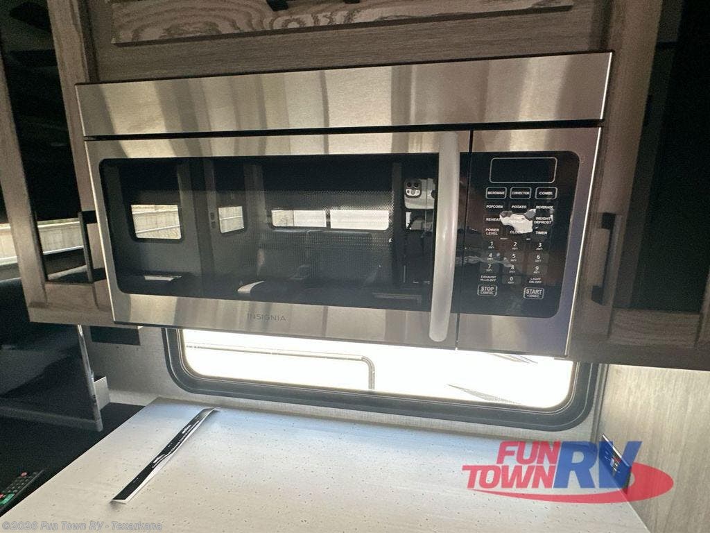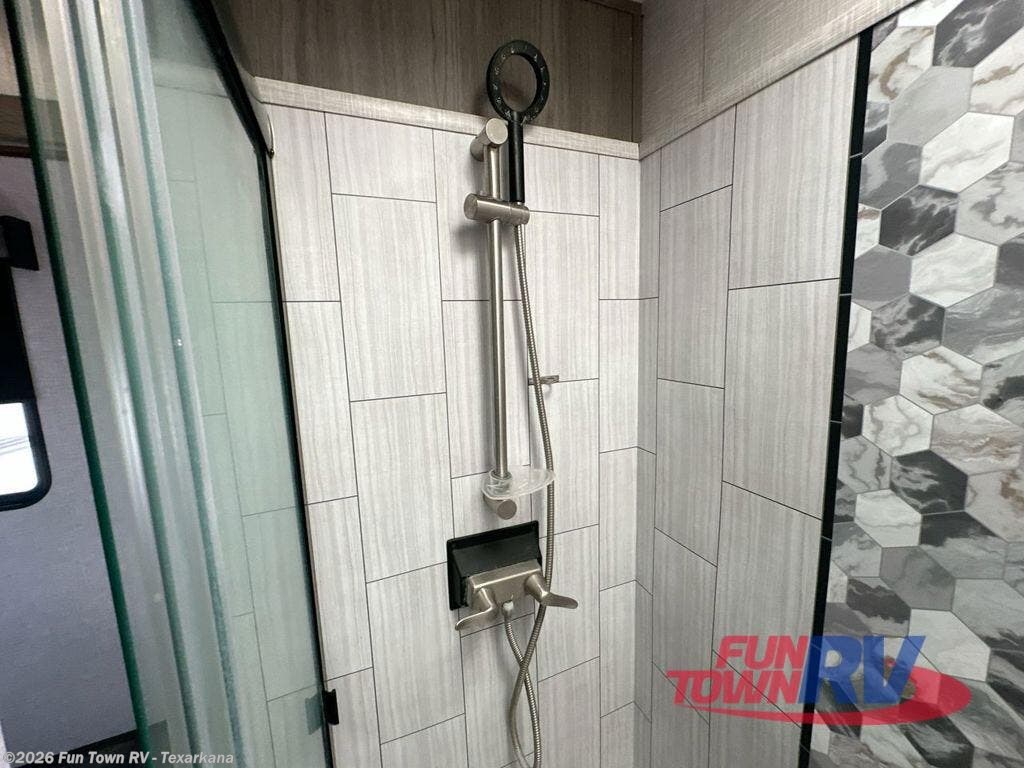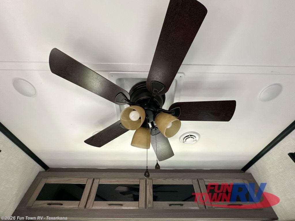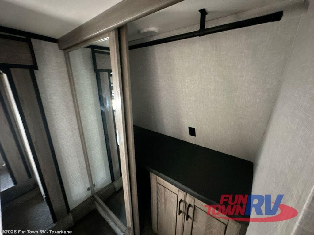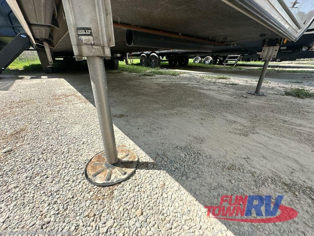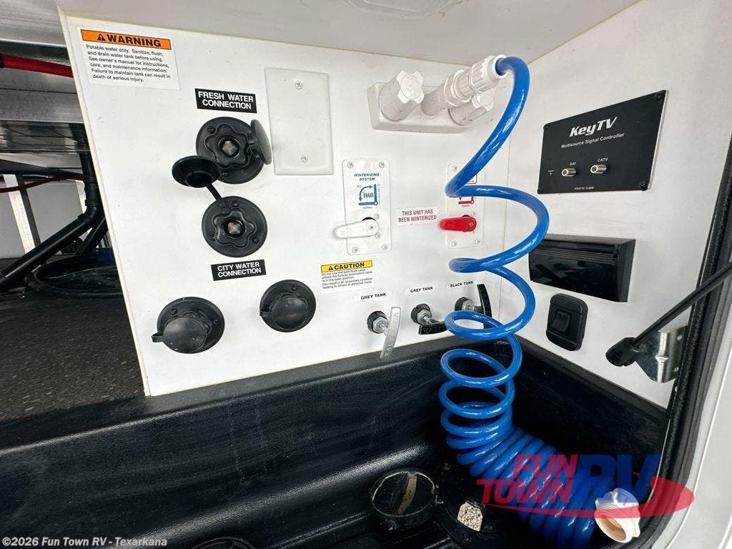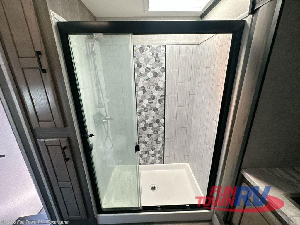 Comfort and luxury abounds throughout this fifth wheel! Starting with the dual entry bathroom which has a dual sink vanity for two to get ready at once, a 48" shower with a seat, and leads directly into the front private bedroom. Inside the bedroom is a comfortable king bed slide across from a 39" TV with a fireplace below, a dresser, and a front closet with a shoe shelf and prepped to add an optional washer and dryer. The chef can prepare their best home cooked meals with the Furrion kitchen collection and the kitchen island will make clean up easier with the stainless steel sink basin and high rise faucet with a pull out spray hose. Eat your meals and play card games a the dinette then relax on either the rear tri-fold sofa or the power theater seating across from the entertainment center with a fireplace and a 50" TV to watch your favorite movies!