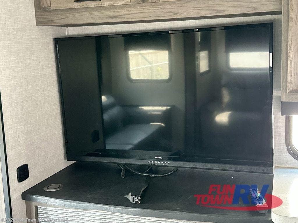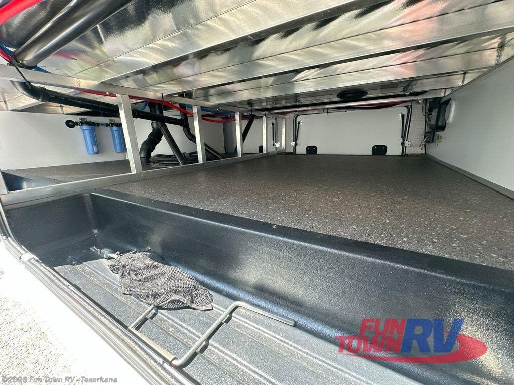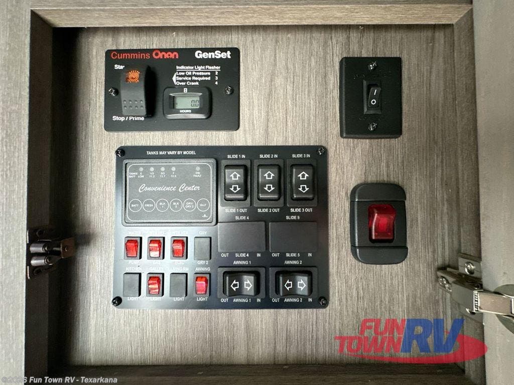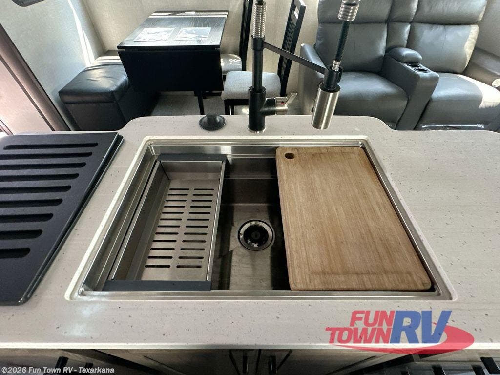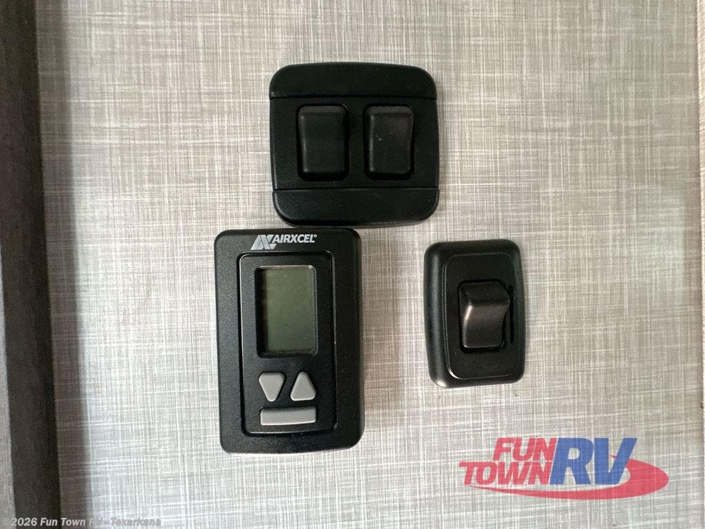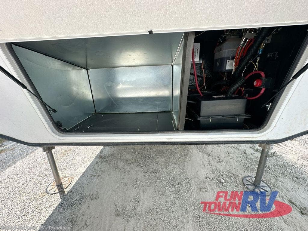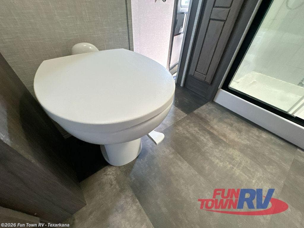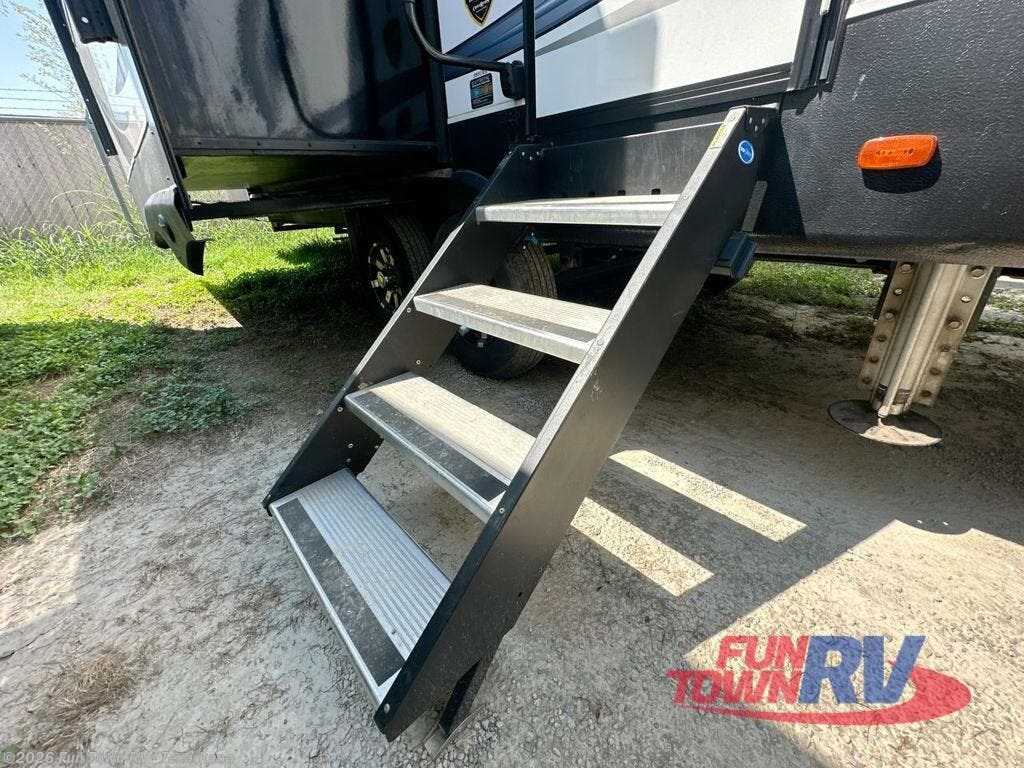 Comfort and luxury abounds throughout this fifth wheel! Starting with the dual entry bathroom which has a dual sink vanity for two to get ready at once, a 48" shower with a seat, and leads directly into the front private bedroom. Inside the bedroom is a comfortable king bed slide across from a 39" TV with a fireplace below, a dresser, and a front closet with a shoe shelf and prepped to add an optional washer and dryer. The chef can prepare their best home cooked meals with the Furrion kitchen collection and the kitchen island will make clean up easier with the stainless steel sink basin and high rise faucet with a pull out spray hose. Eat your meals and play card games a the dinette then relax on either the rear tri-fold sofa or the power theater seating across from the entertainment center with a fireplace and a 50" TV to watch your favorite movies!
