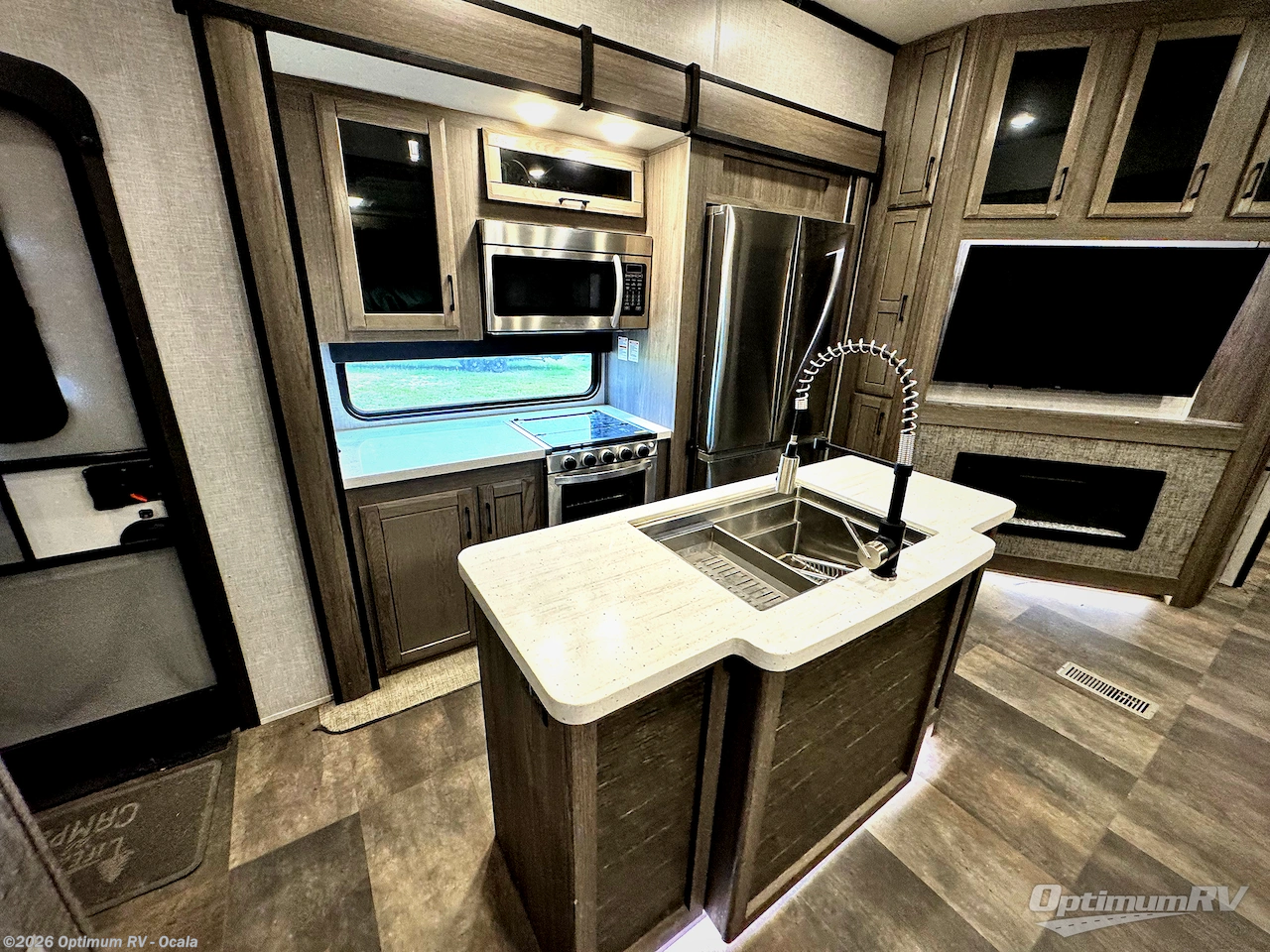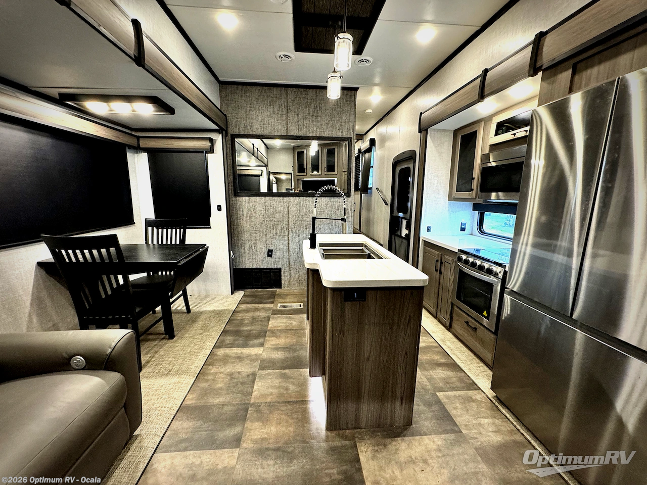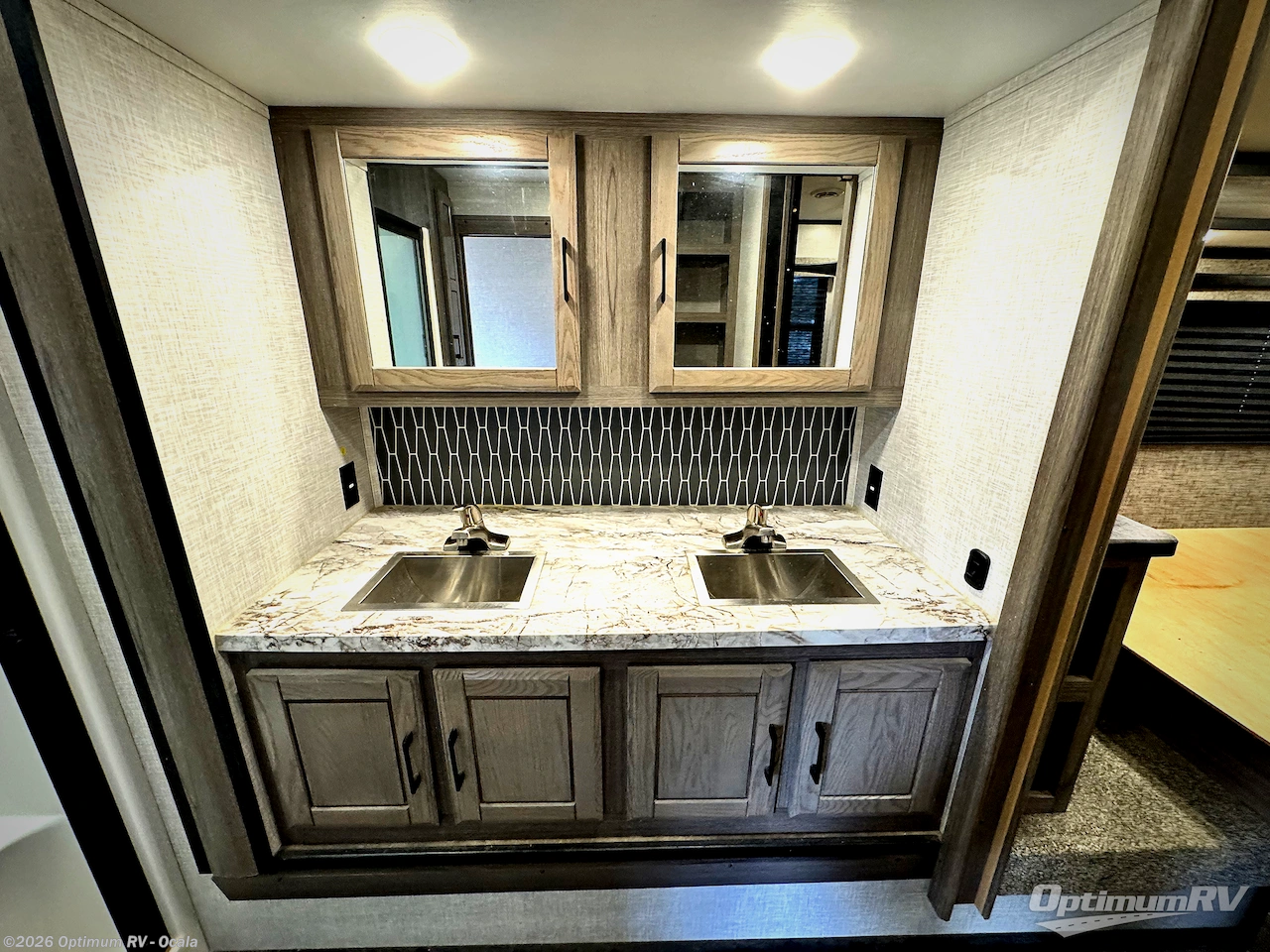 With dual entry doors, everyone can easily access this fifth wheel! One of the entrances leads directly into the half bathroom attached to the rear bedroom which has a tri-fold sofa slide and wardrobe below a 54" x 74" loft bunk mat. The chef can prepare their best home cooked meals either indoors with the Furrion kitchen collection and the kitchen island or at the outside kitchen with a refrigerator and griddle. Enjoy your meals together at the dinette with two chairs on one side and bench seating on the other side. The dual entry bathroom has a 48" shower with a seat to freshen up in each morning and a dual sink vanity for two to get ready at once, plus it enters into the front private bedroom. You will feel right at home in the bedroom with the king bed slide across from the dresser with a fireplace and 39" TV, and the front closet with a shoe shelf and an area prepped to add an optional washer and dryer!