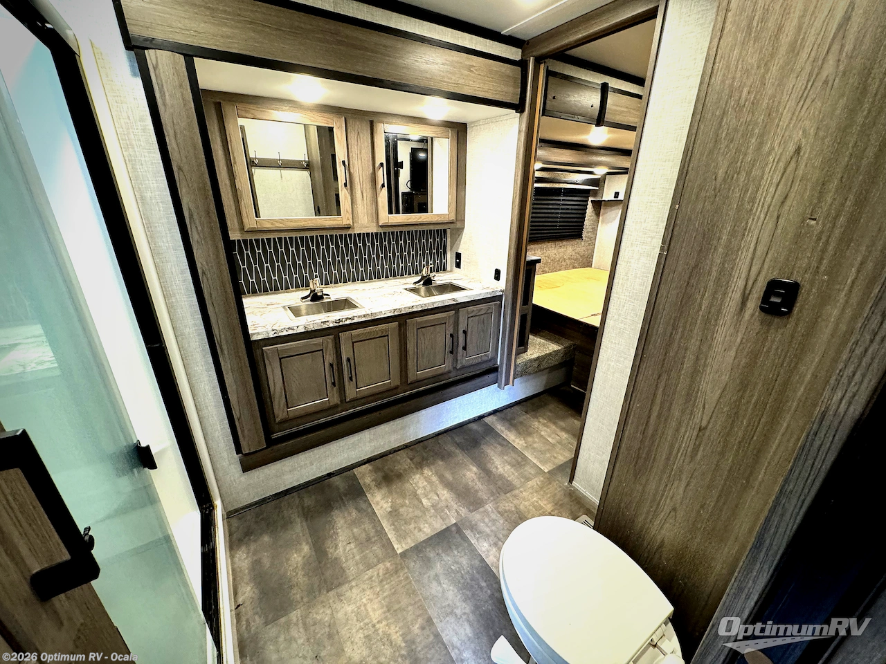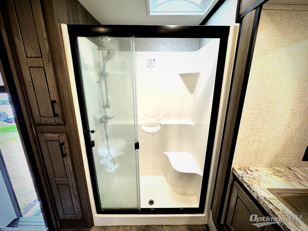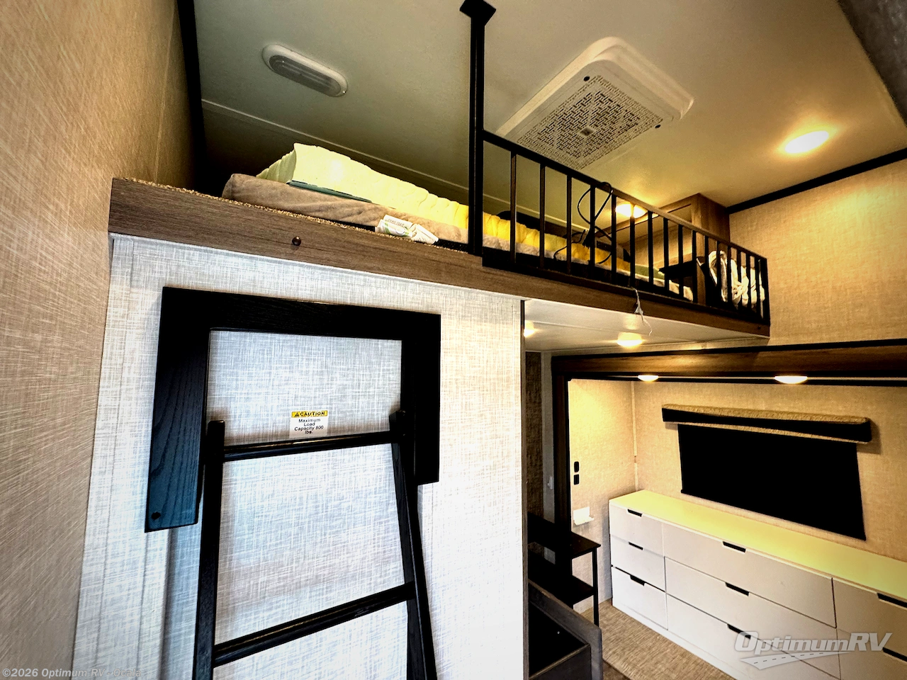 With dual entry doors, everyone can easily access this fifth wheel! One of the entrances leads directly into the half bathroom attached to the rear bedroom which has a tri-fold sofa slide and wardrobe below a 54" x 74" loft bunk mat. The chef can prepare their best home cooked meals either indoors with the Furrion kitchen collection and the kitchen island or at the outside kitchen with a refrigerator and griddle. Enjoy your meals together at the dinette with two chairs on one side and bench seating on the other side. The dual entry bathroom has a 48" shower with a seat to freshen up in each morning and a dual sink vanity for two to get ready at once, plus it enters into the front private bedroom. You will feel right at home in the bedroom with the king bed slide across from the dresser with a fireplace and 39" TV, and the front closet with a shoe shelf and an area prepped to add an optional washer and dryer!