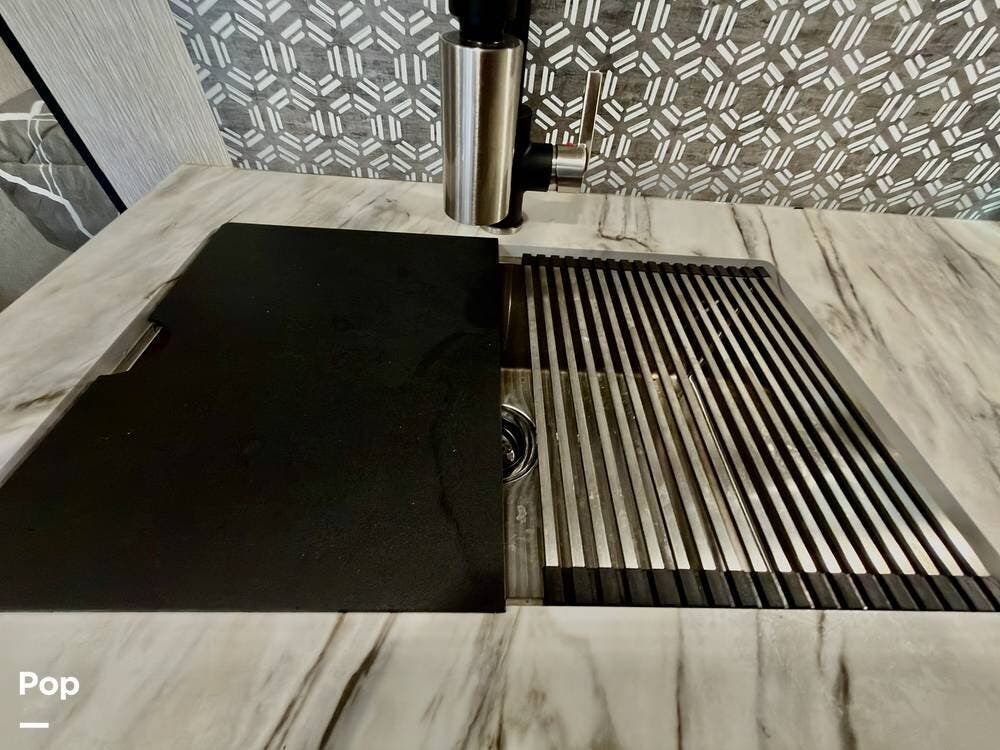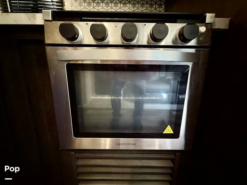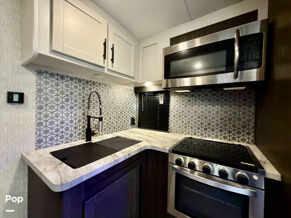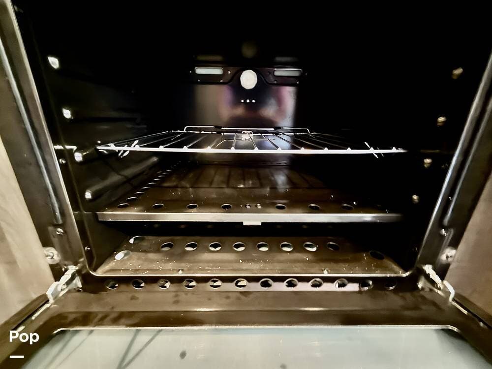 The kitchen area is equipped with a three-burner cooktop with oven, microwave, stainless steel sink, and a 12-volt refrigerator. Cabinets and drawers throughout provide storage for cookware, pantry items, and travel supplies.
