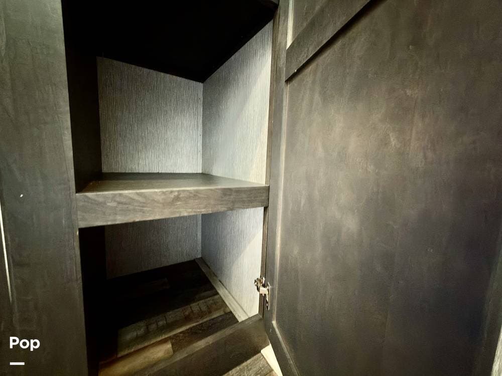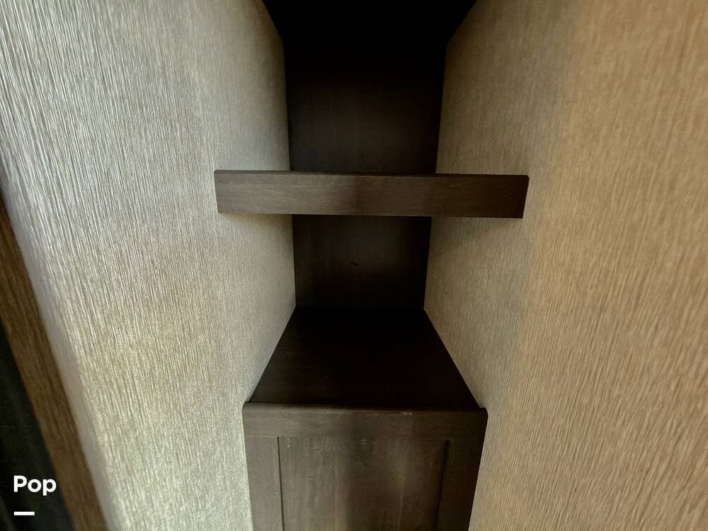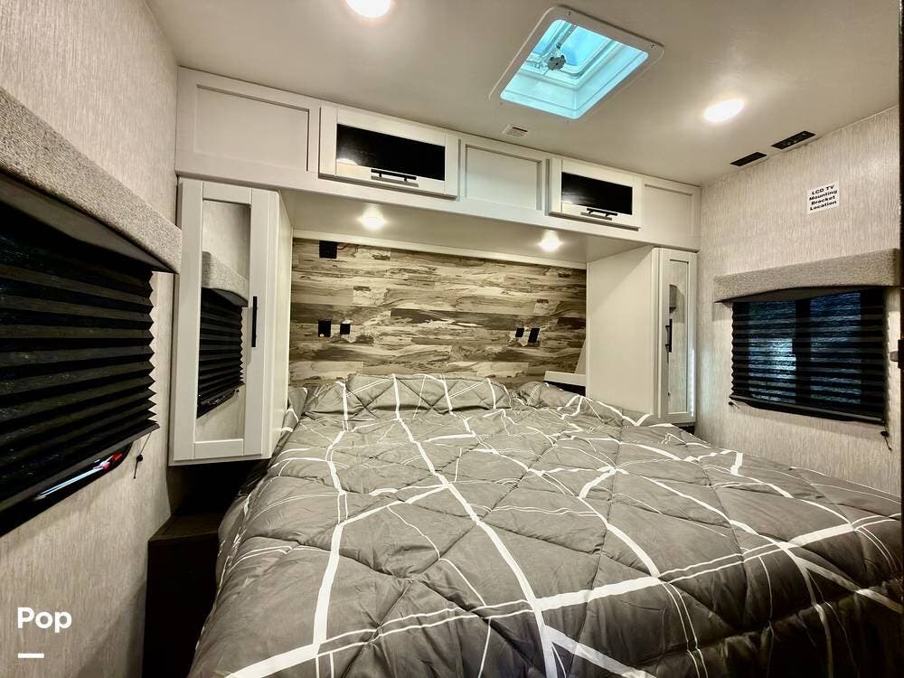 Toward the front of the trailer is the bedroom area featuring a king bed with overhead cabinets and wardrobe storage.