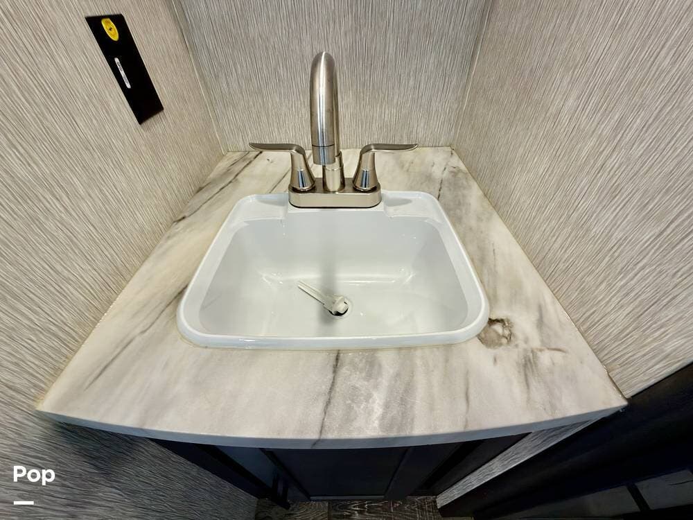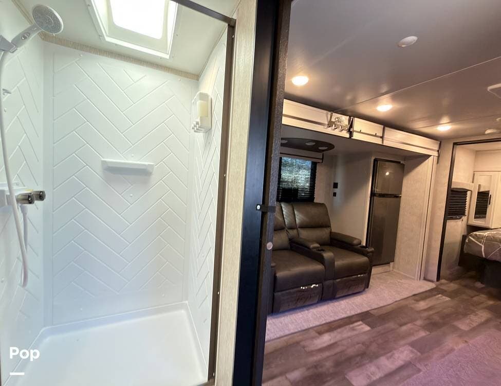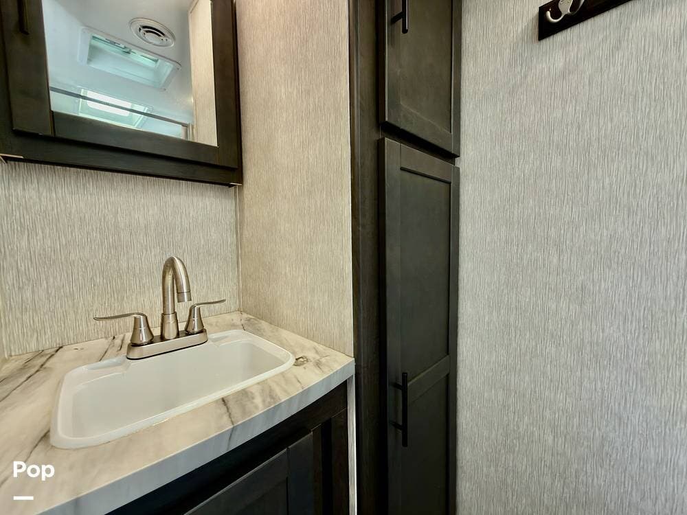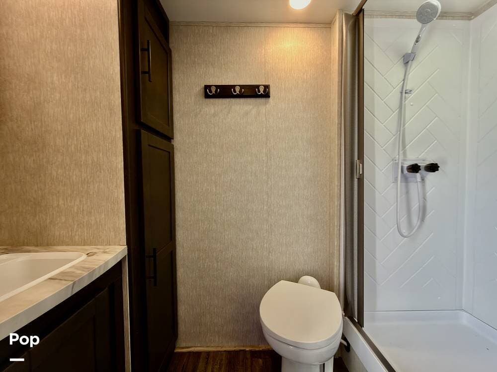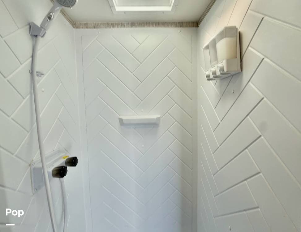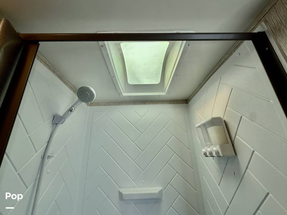 At the rear of the trailer is a full-width bathroom that provides more usable space than many trailers in this size range. It includes a shower with skylight, vanity with sink and storage, and a porcelain foot-flush toilet.