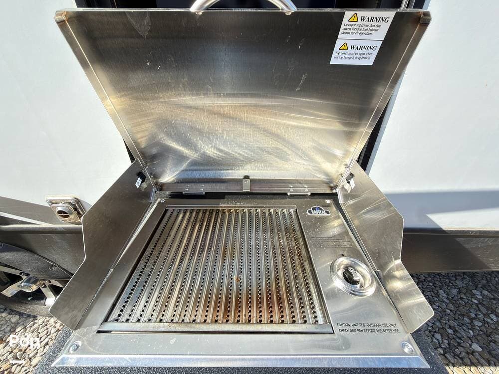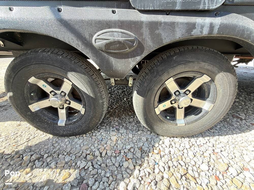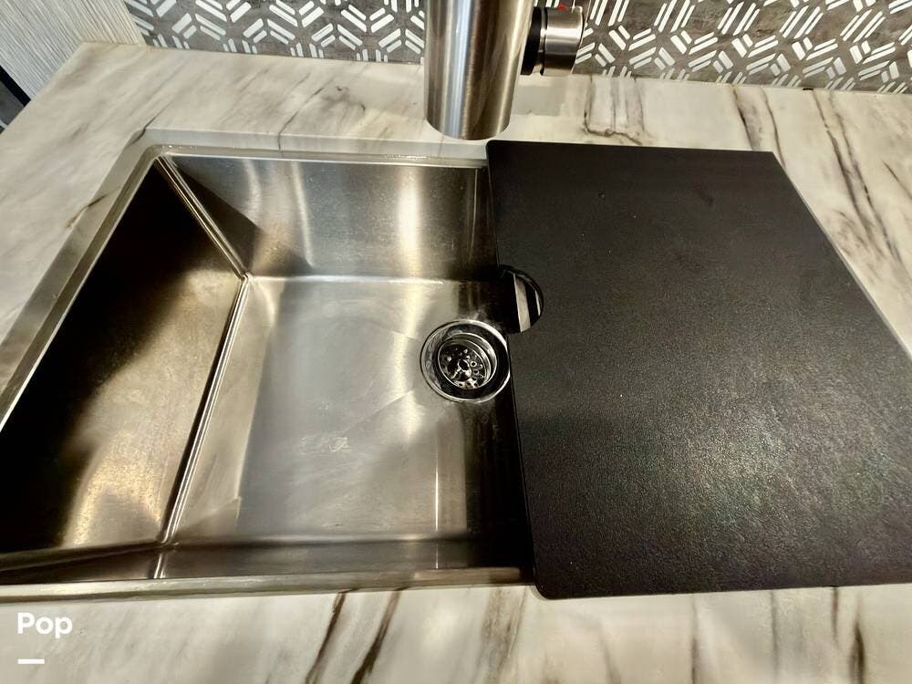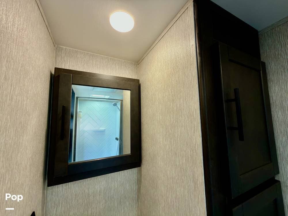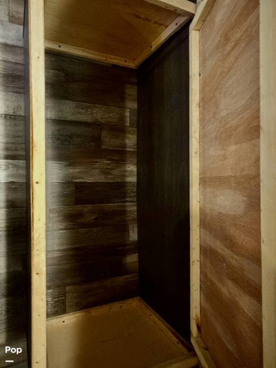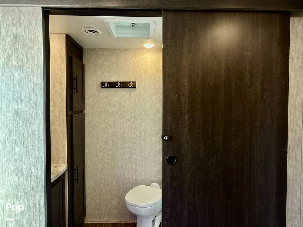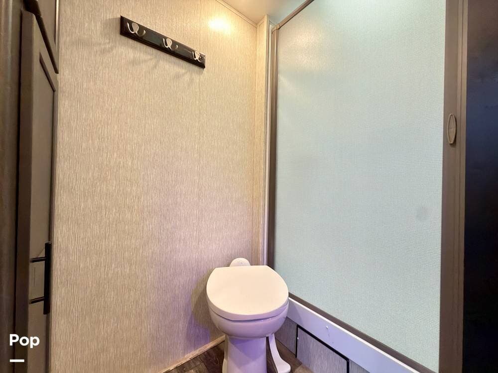 At the rear of the trailer is a full-width bathroom that provides more usable space than many trailers in this size range. It includes a shower with skylight, vanity with sink and storage, and a porcelain foot-flush toilet.
