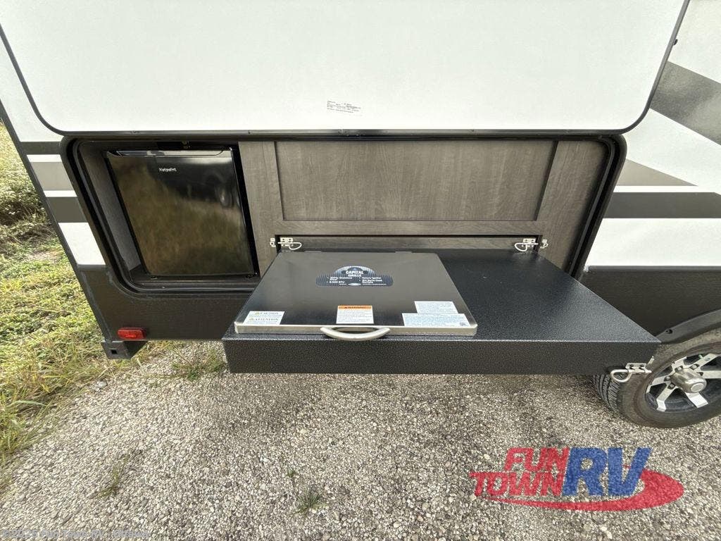 A spacious rear kitchen, plus an outdoor kitchen make this a fun fifth wheel to take to the campground. Make a cold drink from the wine fridge once you arrive at your destination, then head outside to relax under the power awning with LED lights. If the weather isn't coopering, you will find comfortable seating space inside on the tri-fold sofa and the U-Dinette. You will appreciate the front private bedroom with a king bed, dual nightstands, and a wardrobe for your clothes!
