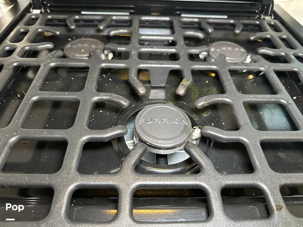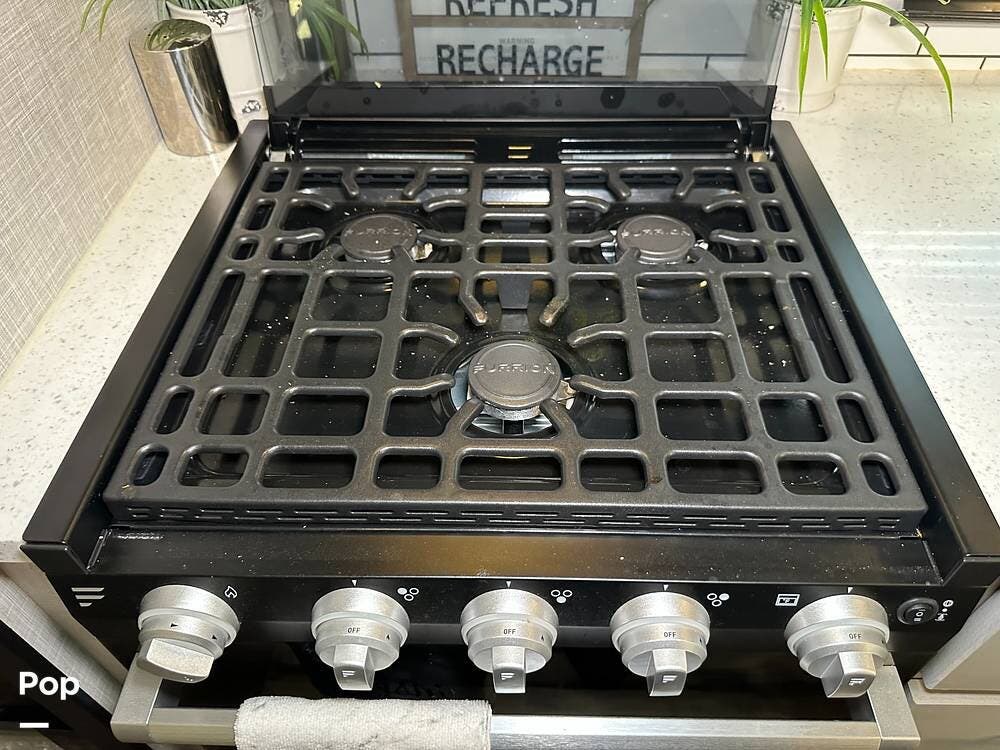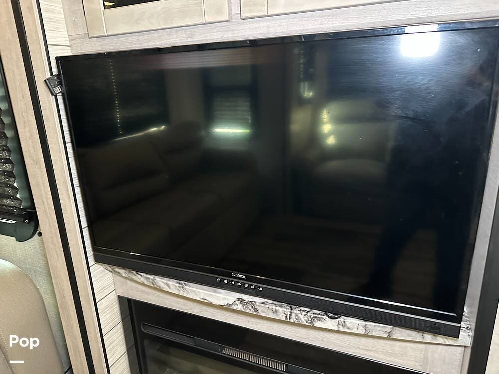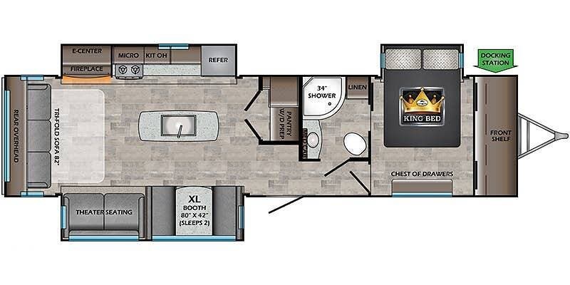 Inside, the floor plan is spacious and comfortable, featuring opposing slide-outs in the living area that accommodate theater-style recliners and a hide-a-bed sofa. All of this overlooks the built-in entertainment center, featuring a large flat-screen TV and fireplace.