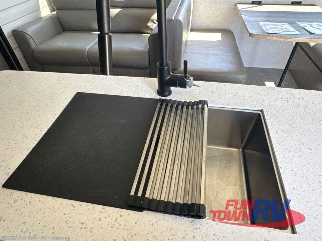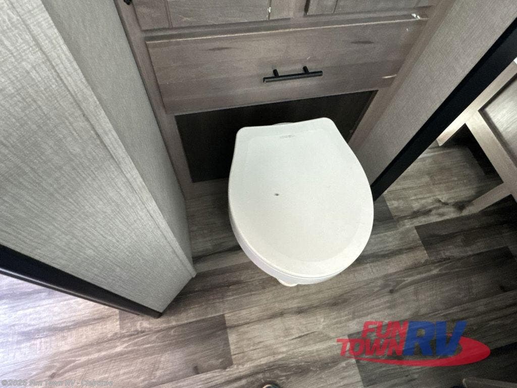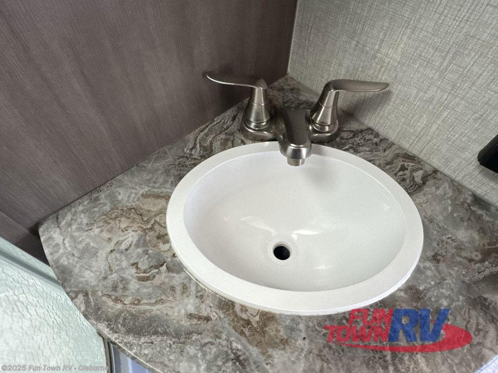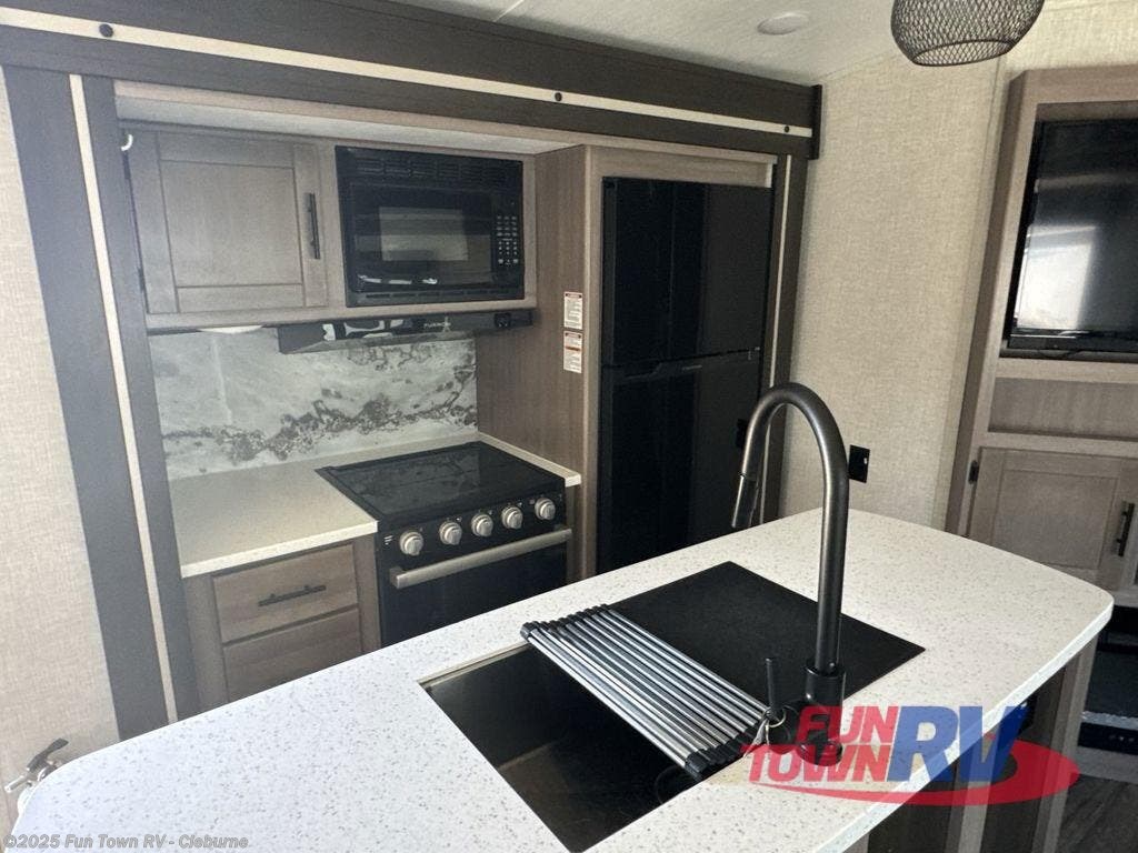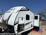 With any Sunset Trail travel trailer by CrossRoads RV, the interior offers a stainless steel farmhouse sink with a cover, solid surface kitchen countertops, and a docking station with 12 Volt, USB Port, and 110 Outlets. Also included is a 13,500 BTU air conditioner plus upgraded insulation with roof and floor reflective foil for added comfort, plus sturdy construction elements like a plywood bed board with strut assist, residential wood window trim, and hardwood cabinet doors. Make your lightweight and comfortable RV decision today!