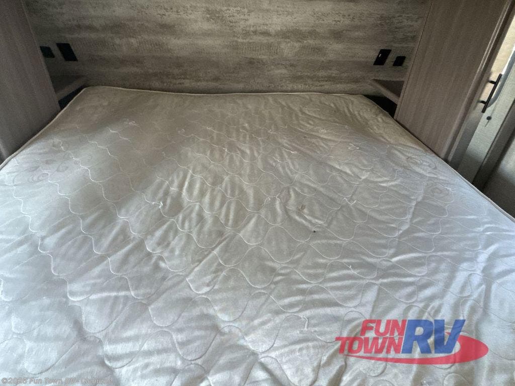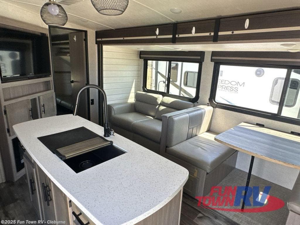 This travel trailer is packed with convenient features and luxury comforts for a camping trip you won't soon forget. Once you arrive at the campground, put out the electric awning and make a quick lunch on the exterior camp kitchen. The kitchen island inside will be the perfect place to cut up all the fixings for the burgers and you can grab the chips from the pantry. The kids will love the private bunkhouse that includes two bunks, a jackknife sofa with a kick, plus a dual entry half bath for convenience. The full walk-through bath will create a front master bedroom you are sure to love. Here, the king bed will provide a great night's rest and there are dual wardrobes for all your clothes. Plus there is a convenient shoe storage and pet station for your trusted loyal friends!
