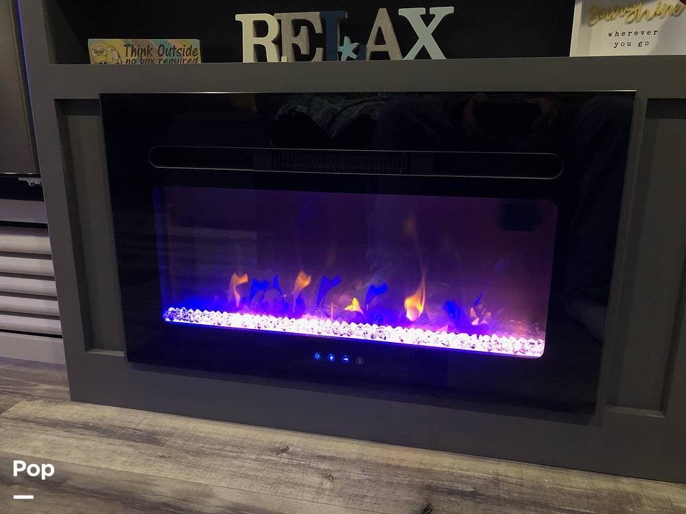 The living area has a sleeper sofa, as well as a convertible booth-style dinette, an entertainment center with a Bluetooth stereo, soundbar, and a flat-panel TV over an electric fireplace.