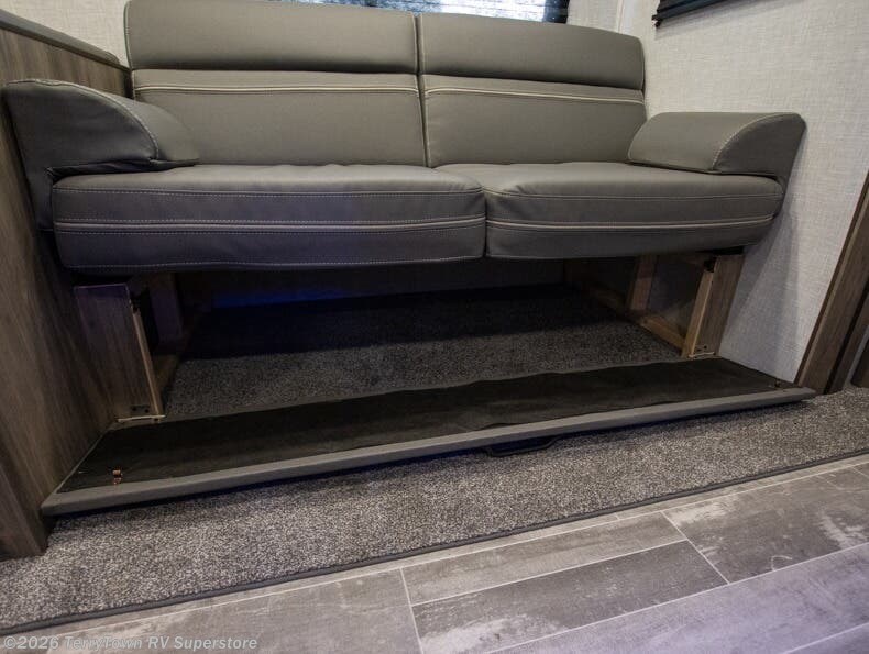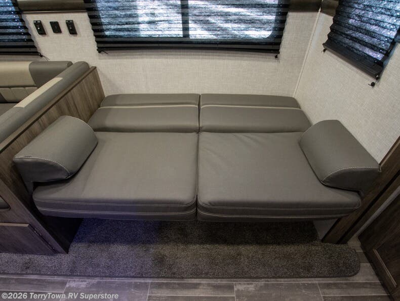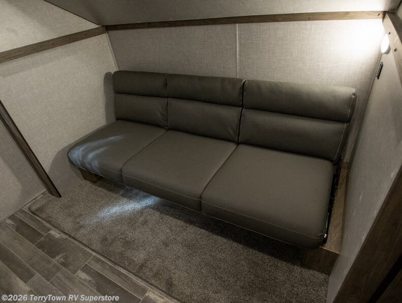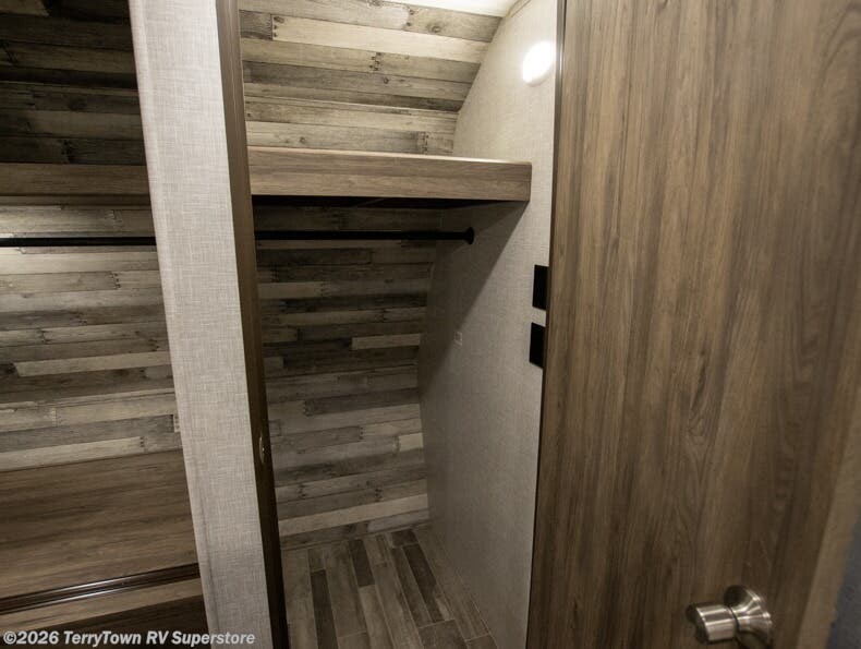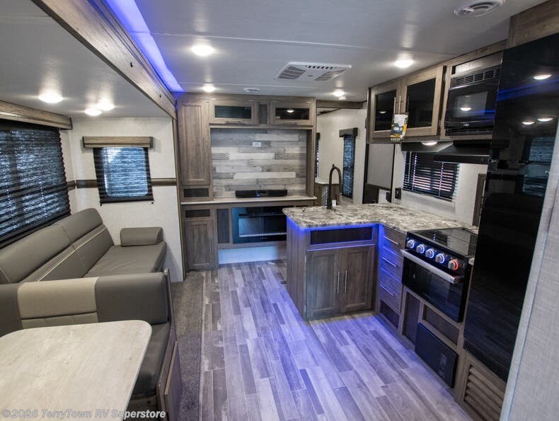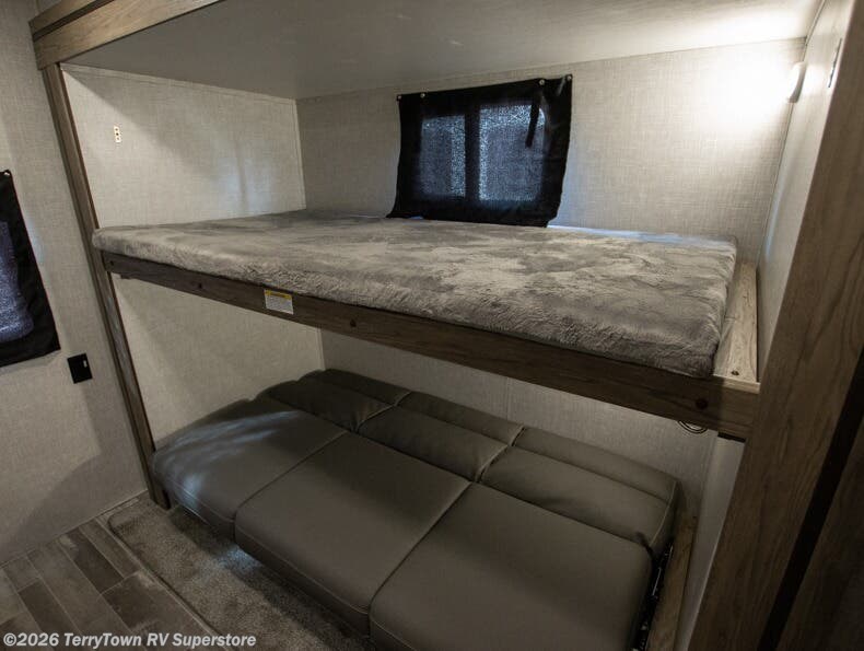 Camp like royalty in this travel trailer! The front private bedroom features a king bed across from a dresser and next to a large wardrobe with overhead cabinets, plus there is a closet that is prepped to add the optional washer and dryer so that you can enjoy clean clothes throughout your entire trip. The living area has a 60" jackknife sofa that can be pulled out for a comfortable place to lie down and watch a movie on the HDTV while a fire is roaring in the electric fireplace. The rear private bunkhouse is big enough to house all of the kiddos with the 38" x 74" flip-up bunk above the 72" jackknife sofa and the 38" x 74" bunk above the wardrobe/entertainment center. You can even cook dinner while breathing in fresh air at the outdoor kitchen!
