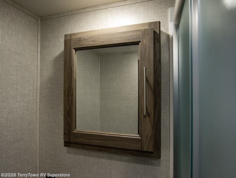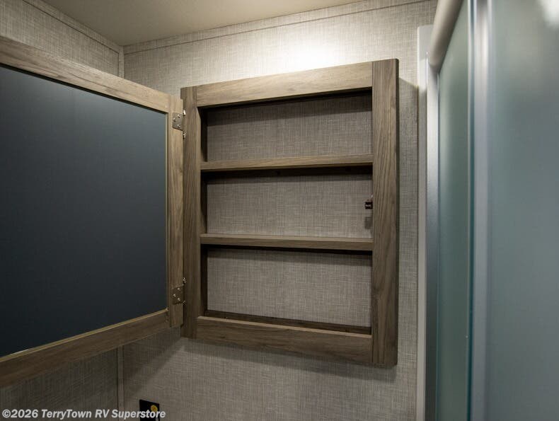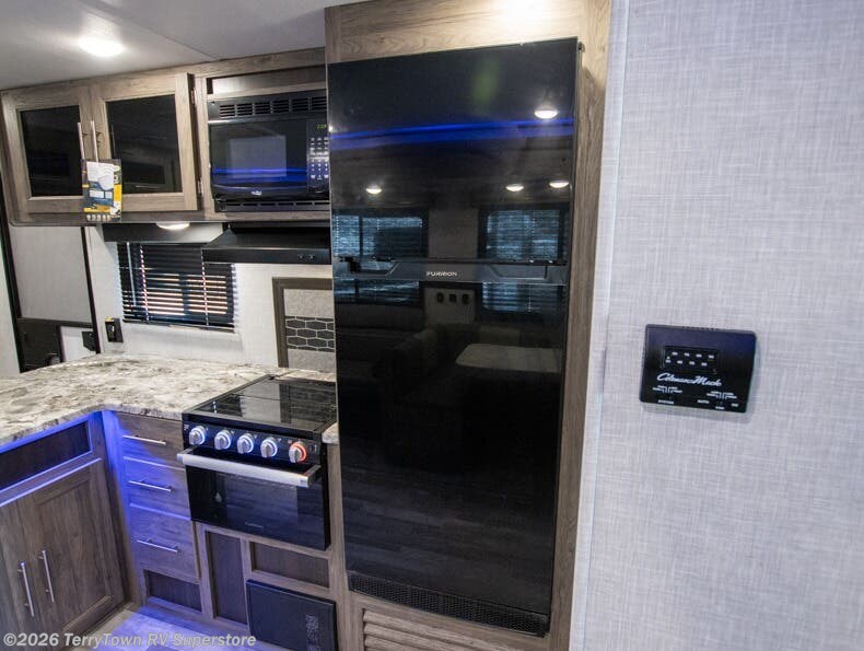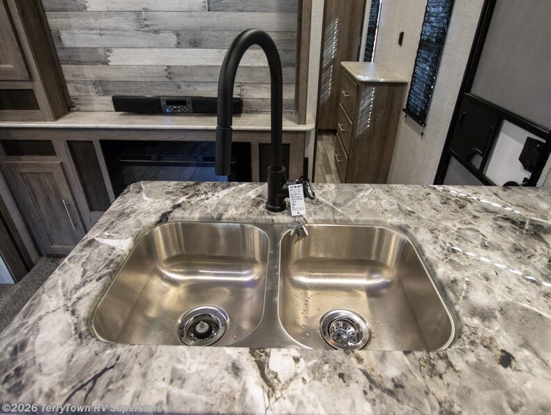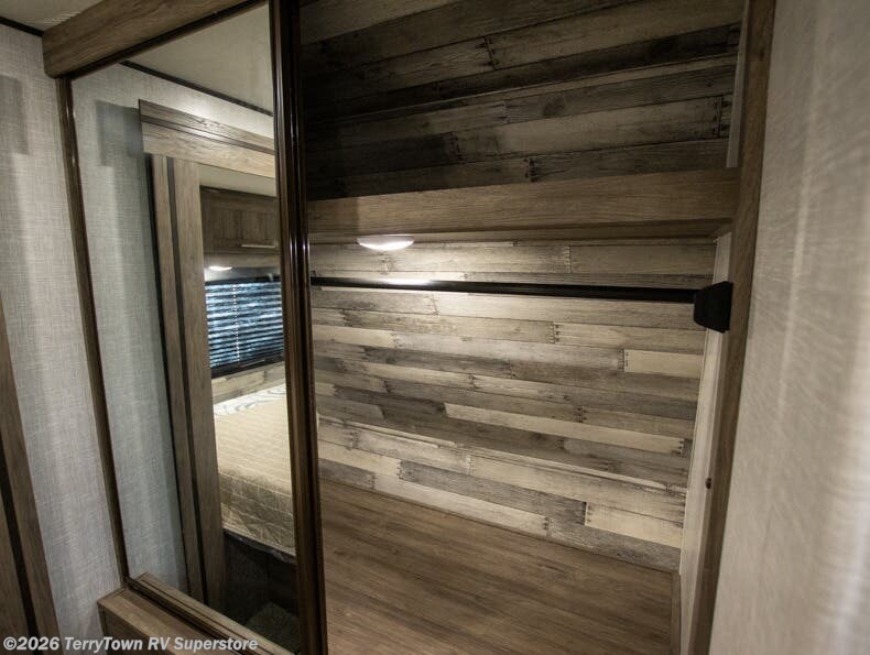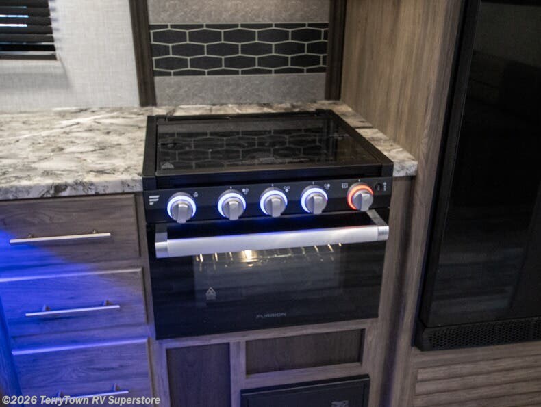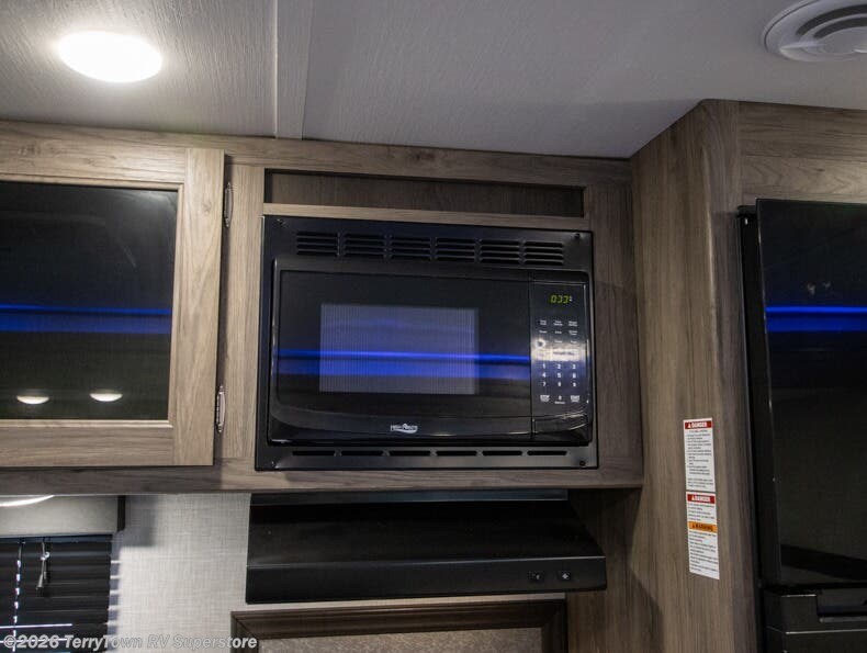 Camp like royalty in this travel trailer! The front private bedroom features a king bed across from a dresser and next to a large wardrobe with overhead cabinets, plus there is a closet that is prepped to add the optional washer and dryer so that you can enjoy clean clothes throughout your entire trip. The living area has a 60" jackknife sofa that can be pulled out for a comfortable place to lie down and watch a movie on the HDTV while a fire is roaring in the electric fireplace. The rear private bunkhouse is big enough to house all of the kiddos with the 38" x 74" flip-up bunk above the 72" jackknife sofa and the 38" x 74" bunk above the wardrobe/entertainment center. You can even cook dinner while breathing in fresh air at the outdoor kitchen!