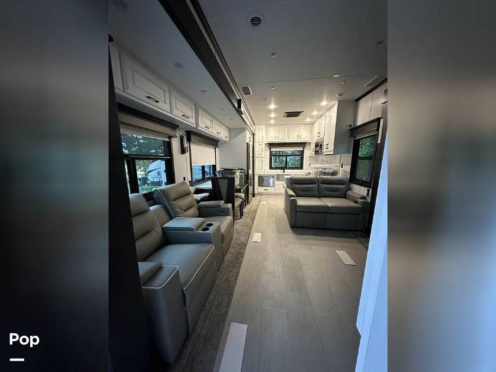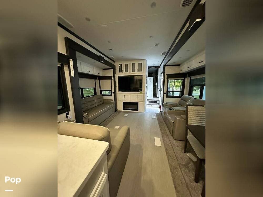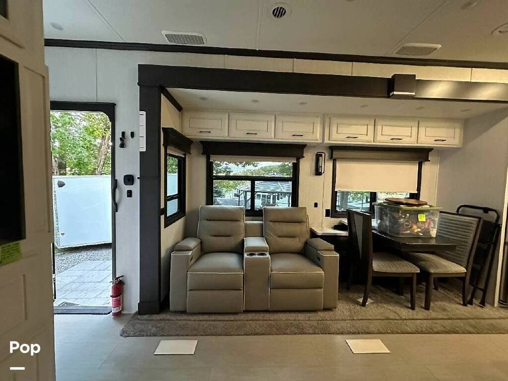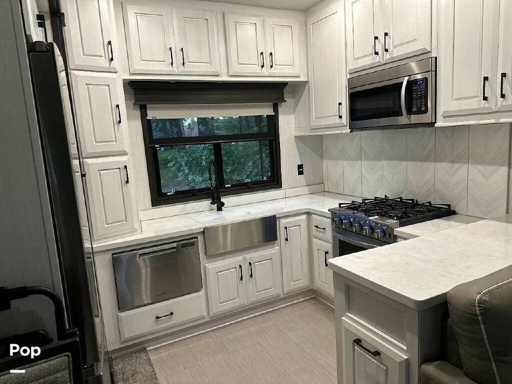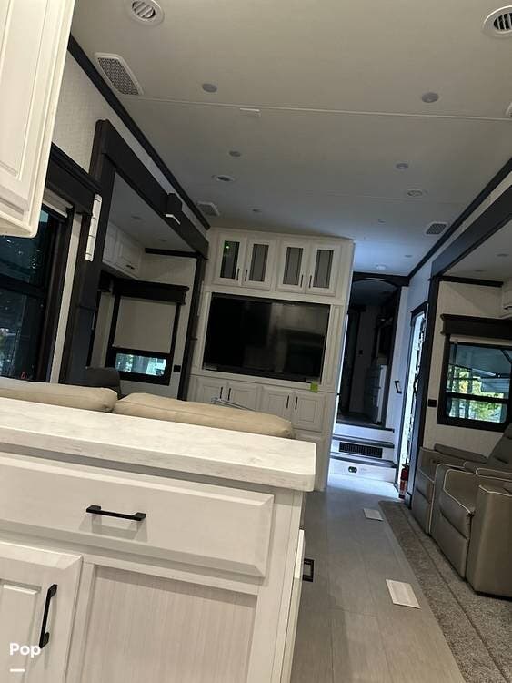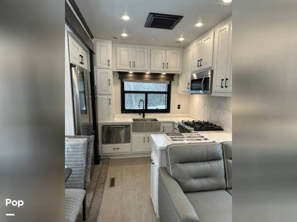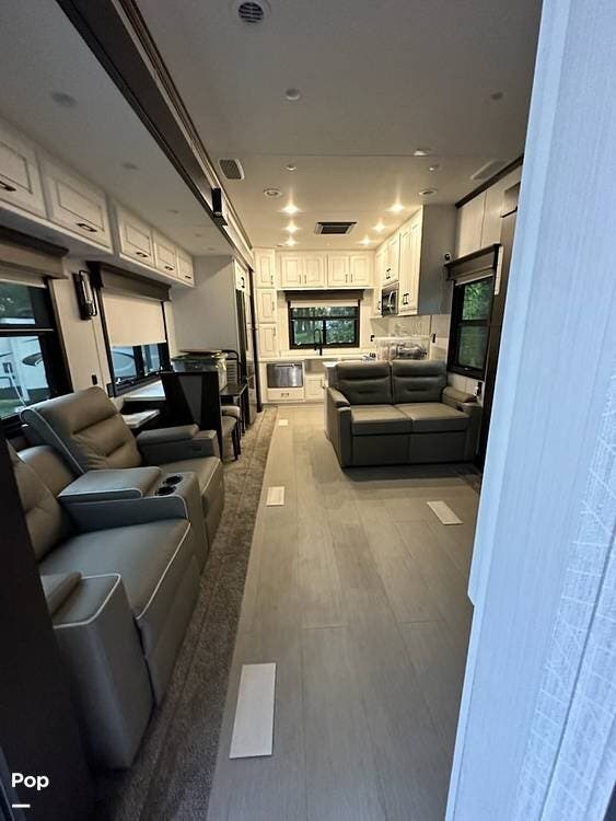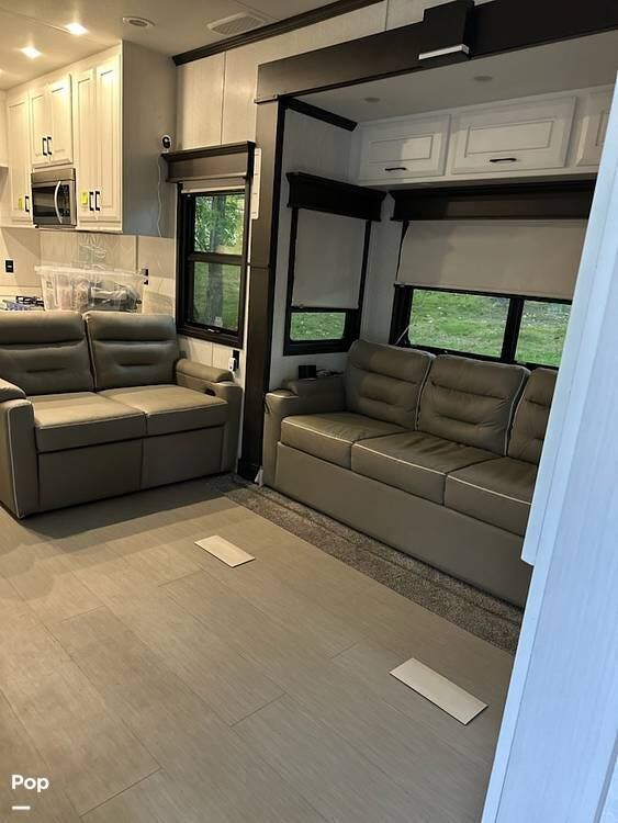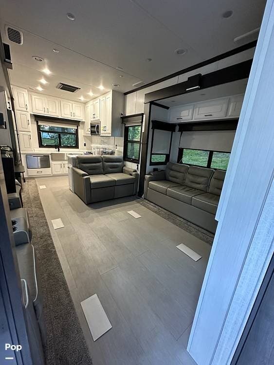 This exquisite residence purchased brand new in April 2023, is now available for those seeking comfort and convenience. Boasting a residential package, this fifth wheel brings the warmth of home to your travels.