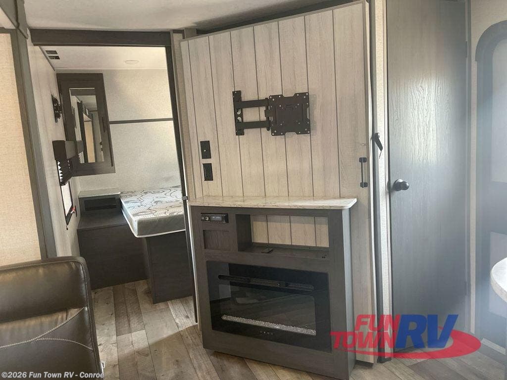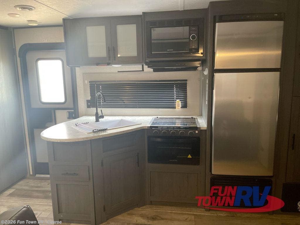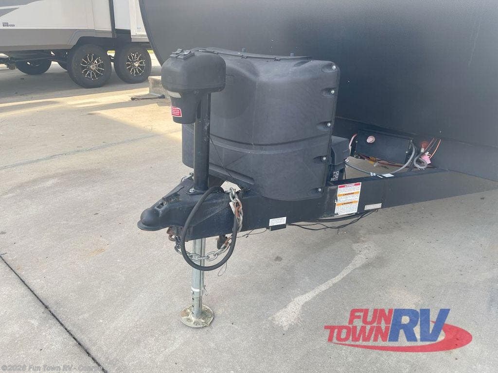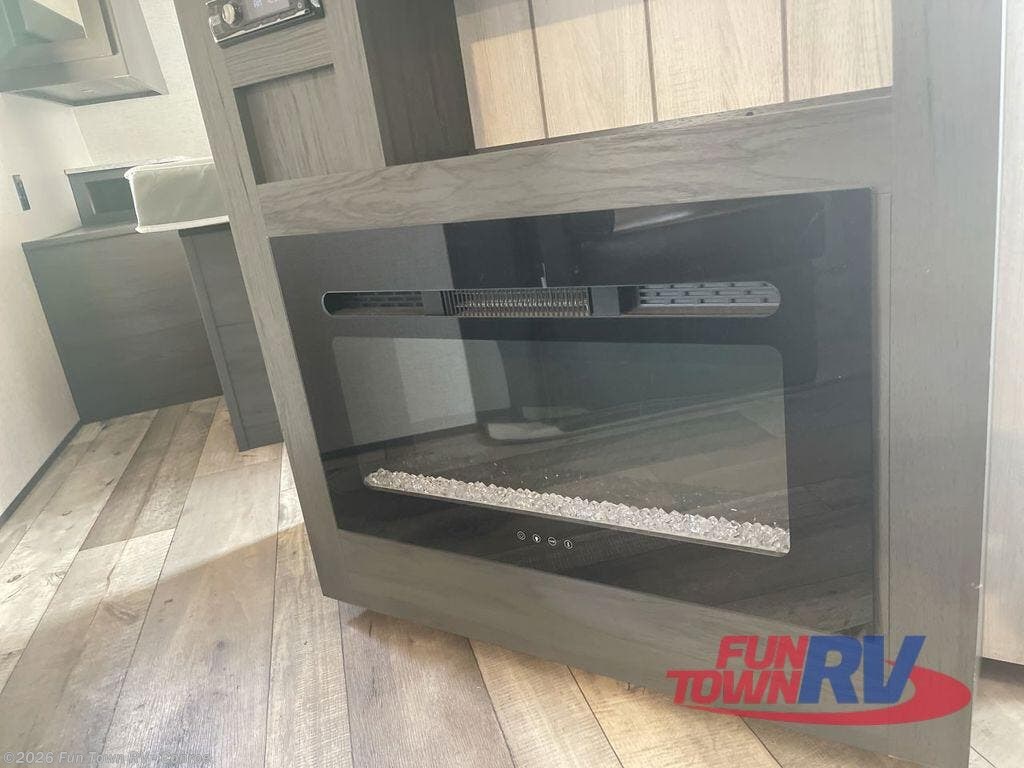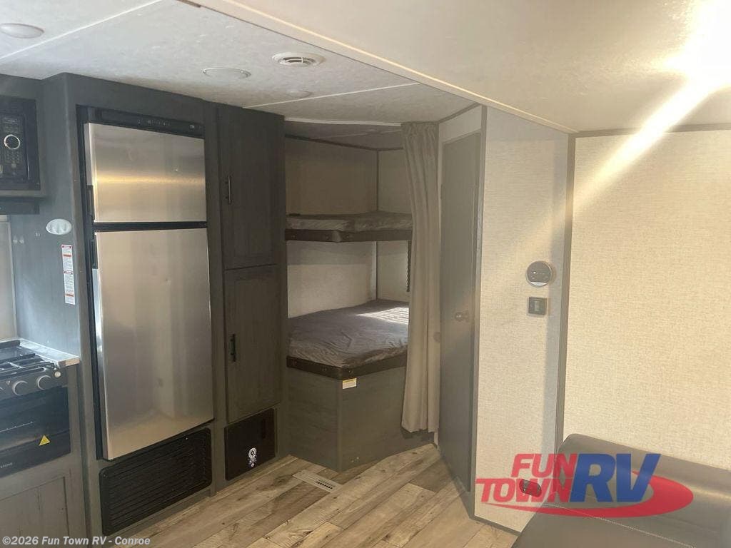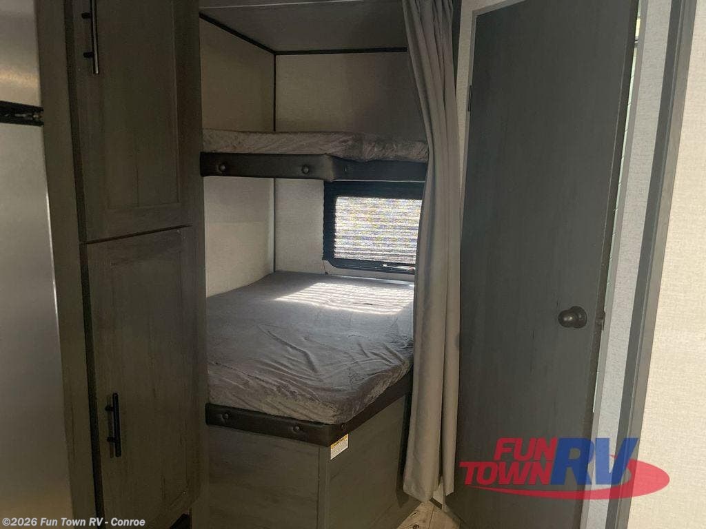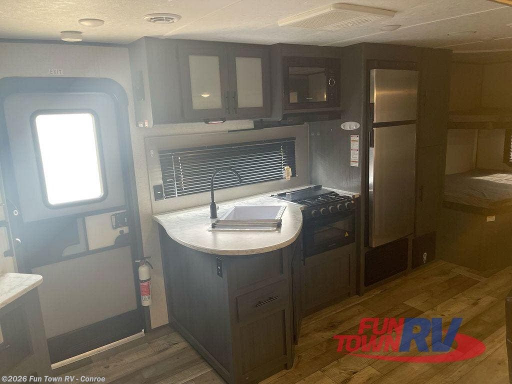 Hitch up and head out to explore a new campground with this trailer! You will be able to sleep eight or nine friends when you utilize the furniture as sleeping space on top of having a residential queen bed in the front bedroom, and double-size bunks next to the rear full bathroom. The slide out booth dinette and sofa offer more interior floor space plus comfortable seating across from the hinged entertainment center and the kitchen amenities. The cook will have a three burner range top, a 7 cu. ft. refrigerator, and storage, plus a galley sink with high rise faucet. And the 16' power awning with LED light provides an outdoor living area once you add your camping chairs taken from the pass-through storage.