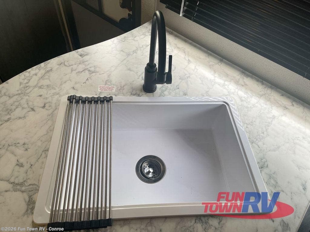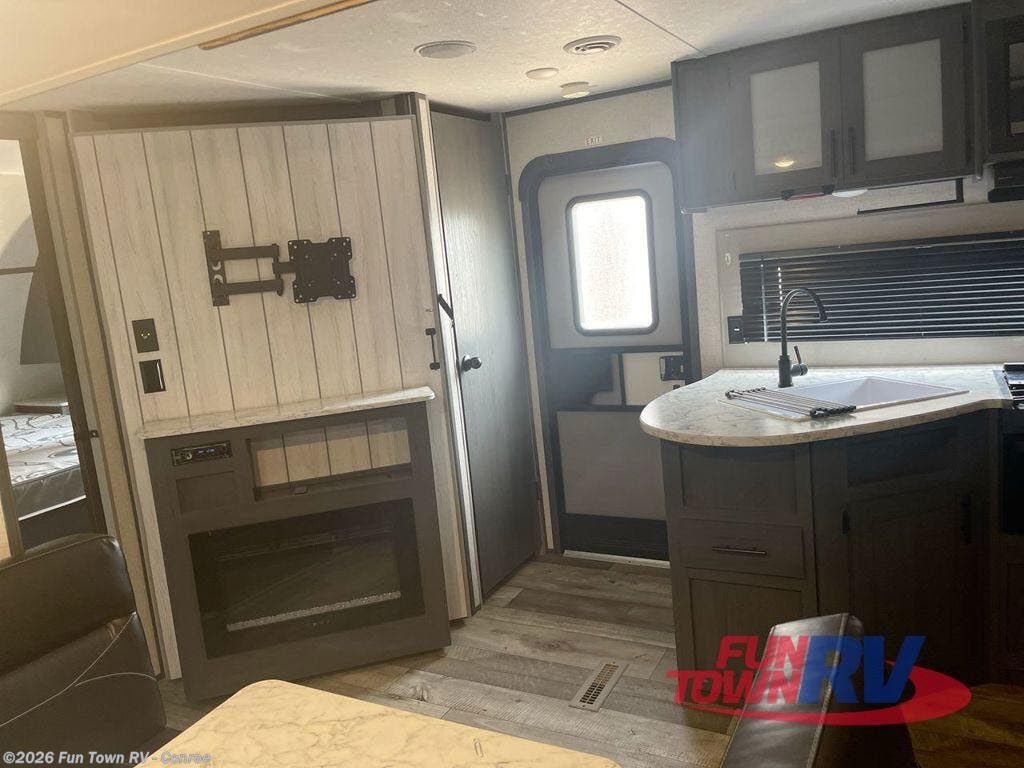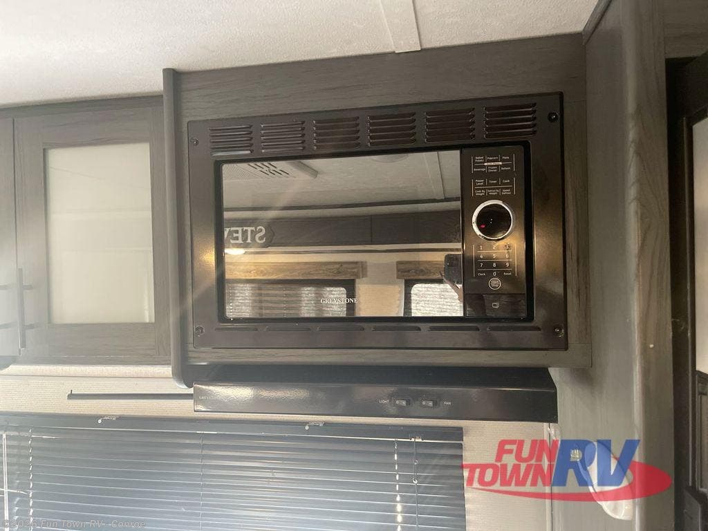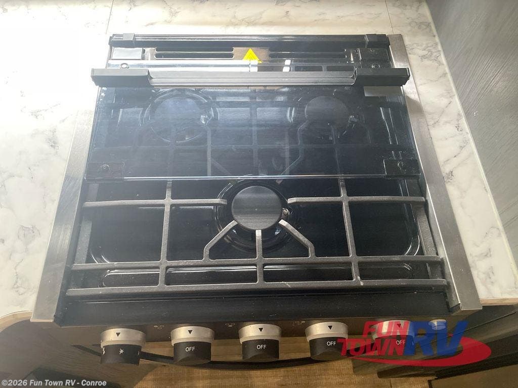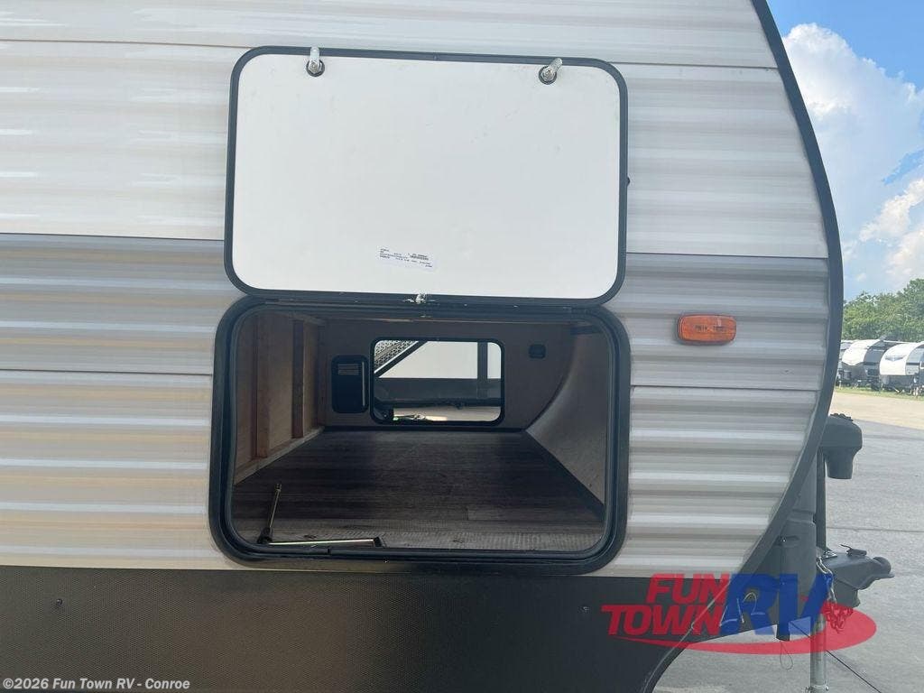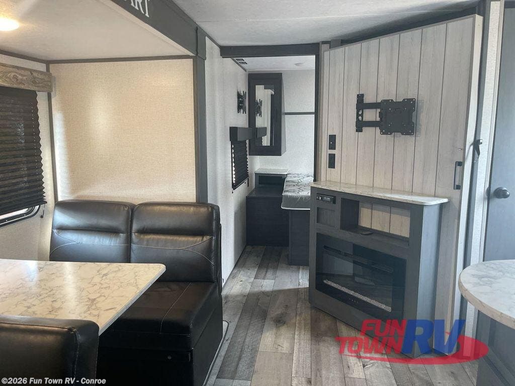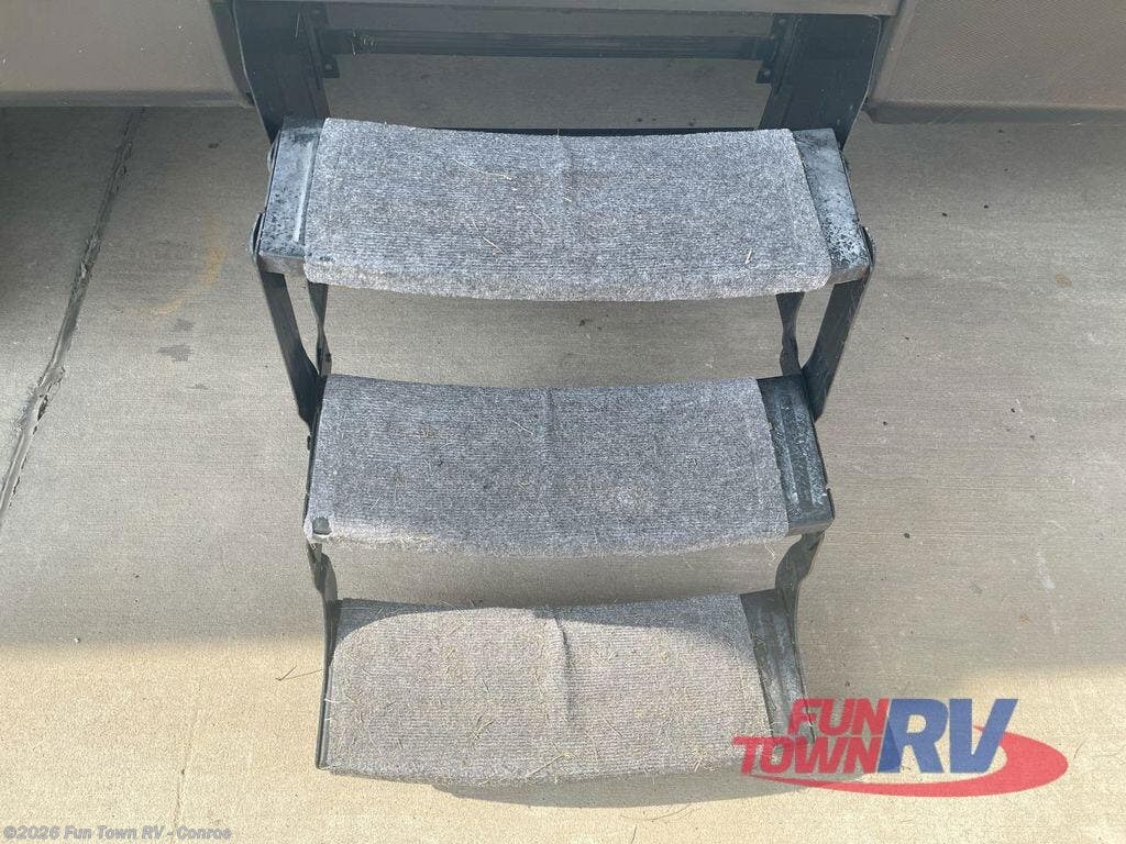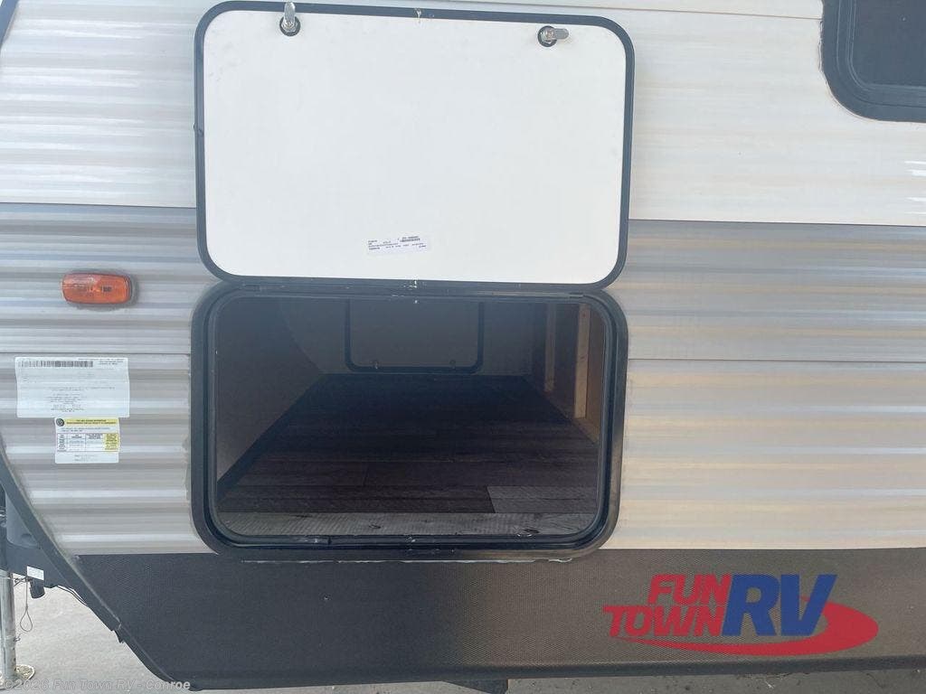 Hitch up and head out to explore a new campground with this trailer! You will be able to sleep eight or nine friends when you utilize the furniture as sleeping space on top of having a residential queen bed in the front bedroom, and double-size bunks next to the rear full bathroom. The slide out booth dinette and sofa offer more interior floor space plus comfortable seating across from the hinged entertainment center and the kitchen amenities. The cook will have a three burner range top, a 7 cu. ft. refrigerator, and storage, plus a galley sink with high rise faucet. And the 16' power awning with LED light provides an outdoor living area once you add your camping chairs taken from the pass-through storage.