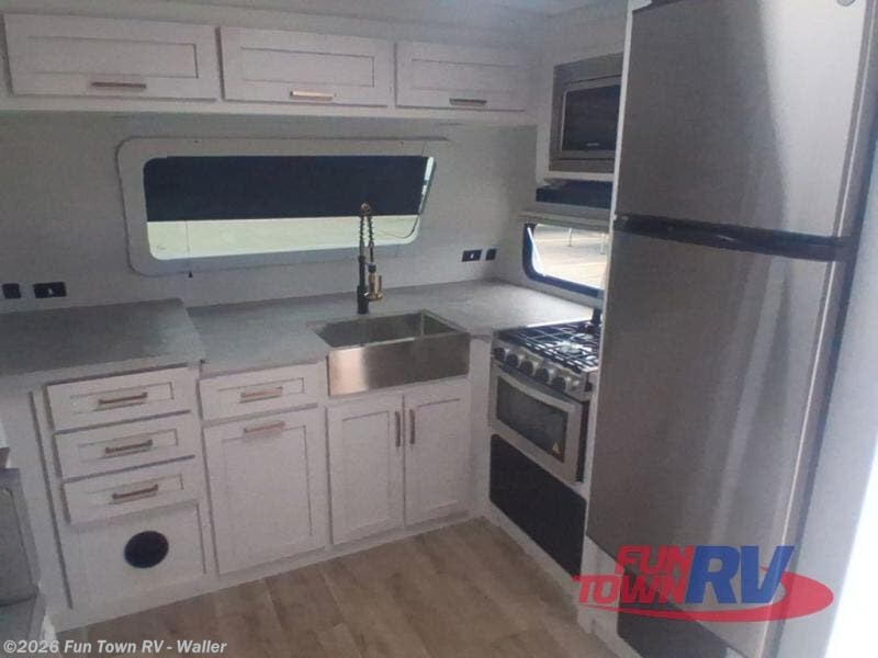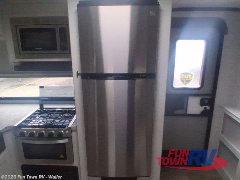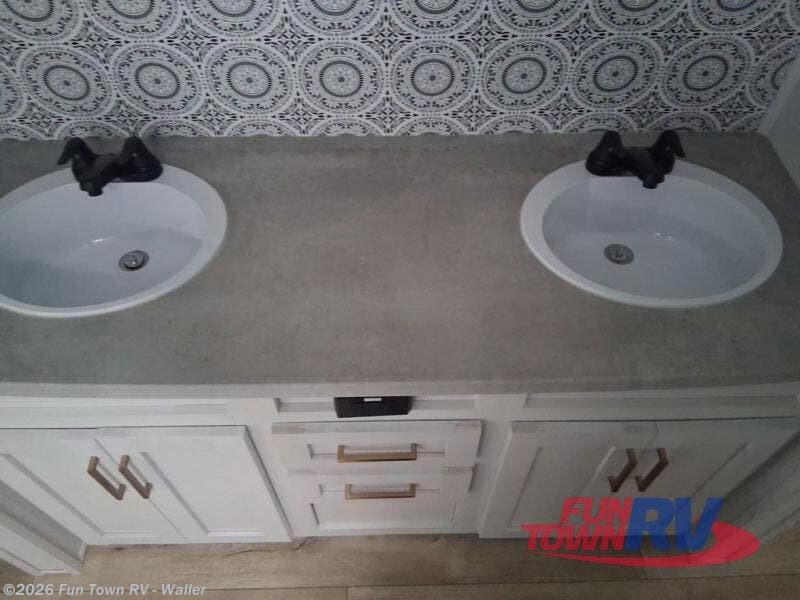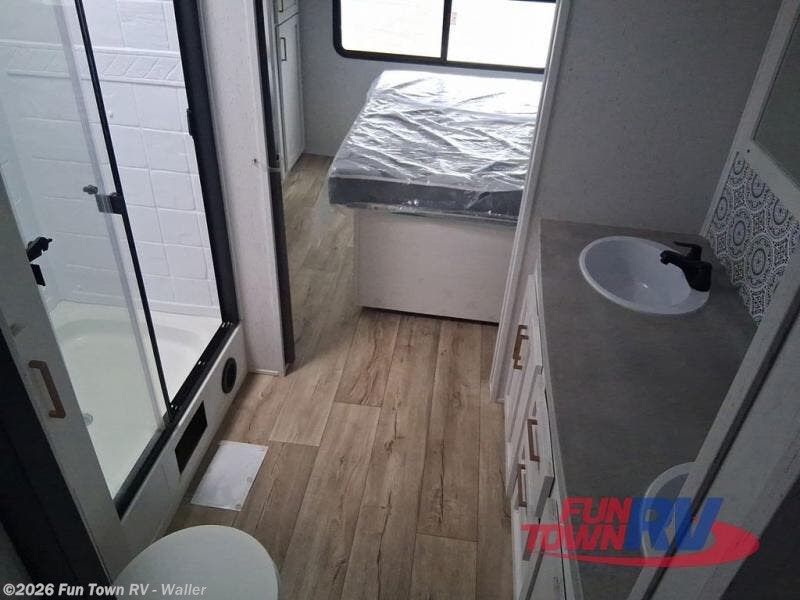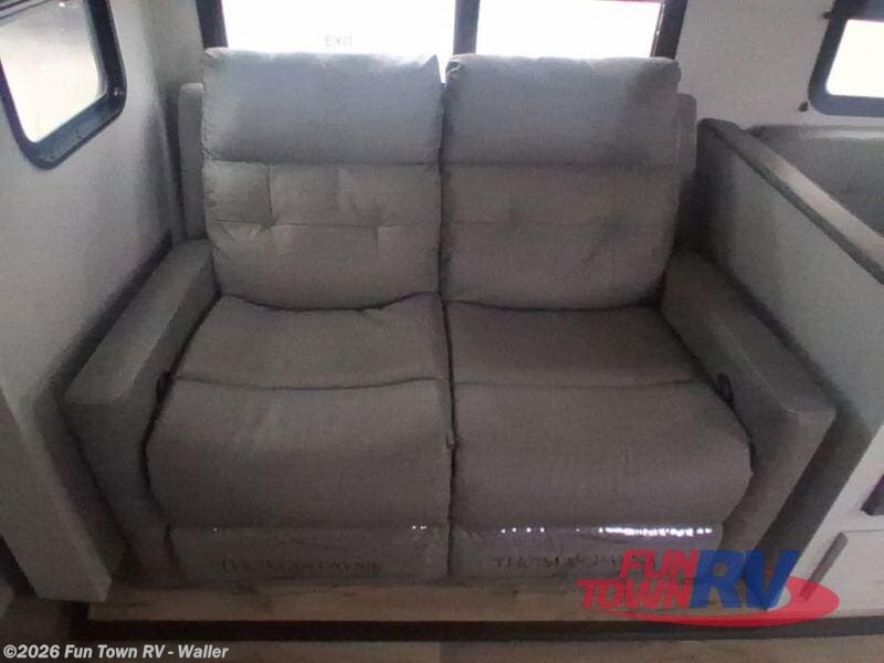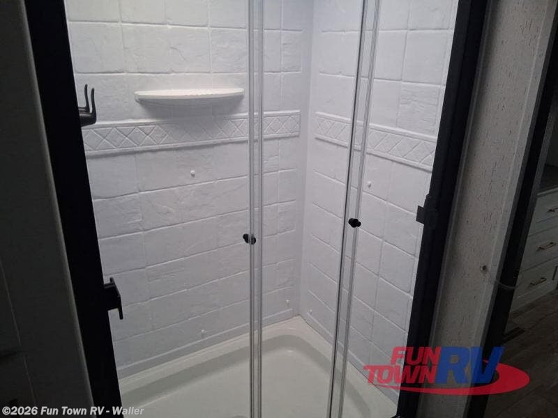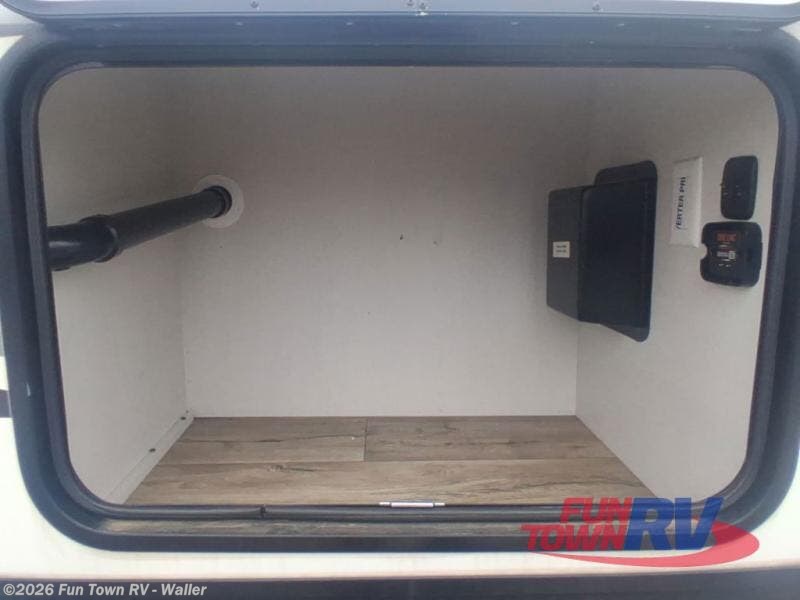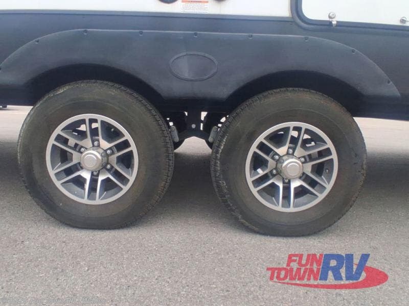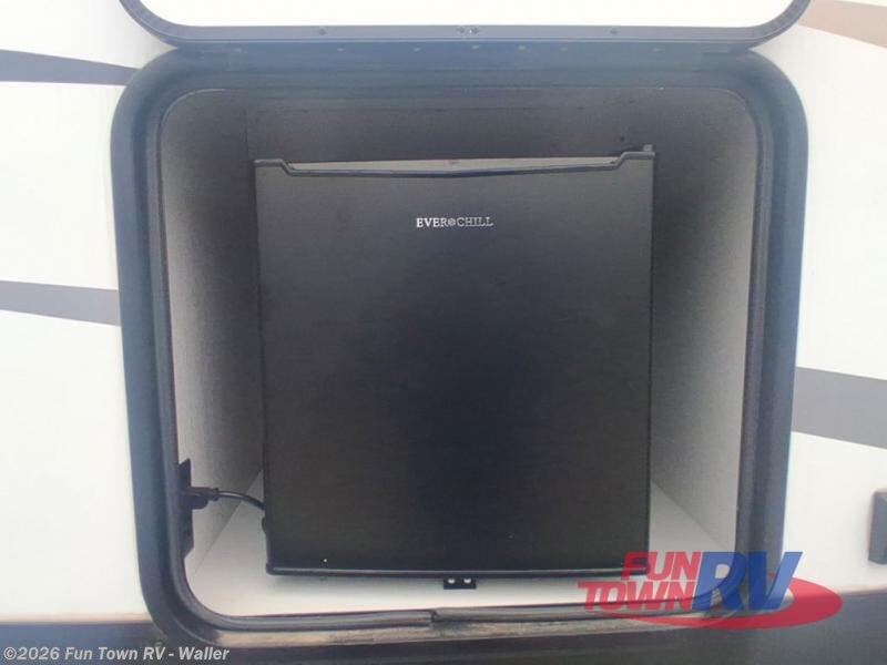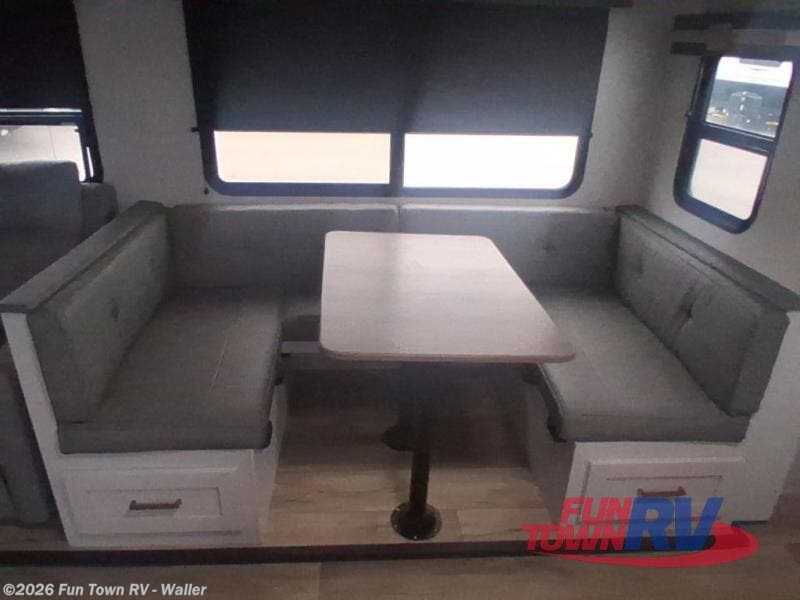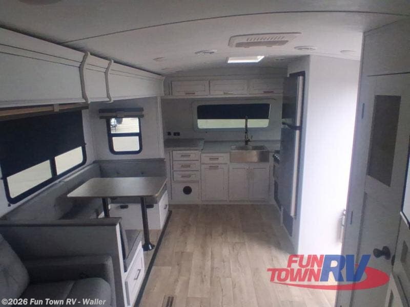 You will have everything you need for a comfortable camping trip with this travel trailer! It features a rear private bedroom with a king bed slide for more walking around space and an entrance into the walk-through bathroom which will come in handy at night. The bathroom also has a dual sink vanity for two to get ready at once in the mornings. The front kitchen has plenty of countertop space to prepare your best meals and even a pull out trash can, and you can comfortably enjoy them at the U-shaped dinette, plus it can transform into an extra sleeping space for a guest or two to tag along. What better way to relax at night than on the tri-fold sofa across from the hinged entertainment center!