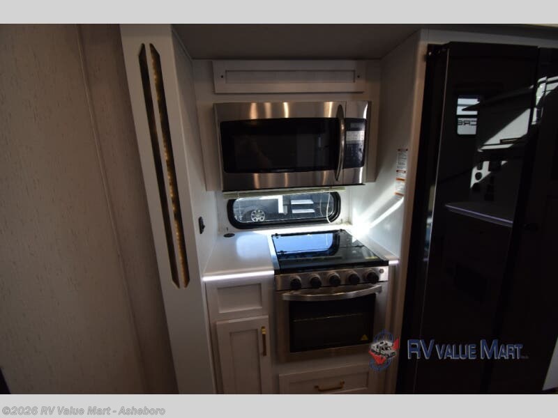 Experience a comfortable camping trip with this fifth wheel! The front living area not only has opposing sofa slides, but also theater seating across from an entertainment center with a 40" glass fireplace and a 50" LED TV. The separate kitchen has everything you will need to prepare delicious home cooked meals including a glass top three burner cooktop with a 21" oven and a kitchen island with a large sink that has a high rise faucet with sprayer for an easy clean up. There is even a half bathroom by the kitchen so you can use it and quickly get back to cooking. The master suite has a king bed slide for more walking around space, an entertainment center for a comfortable movie night, and access to the spacious full rear bathroom with a dual sink vanity, storage and a space prepped for a washer/dryer option.