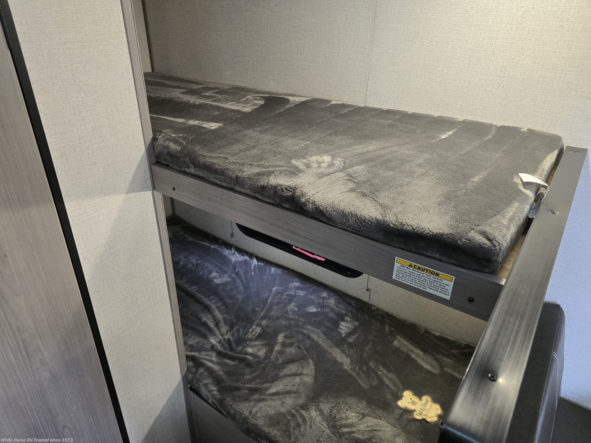 - Bunkhouse layout: Sleeps up to 5 with double bunk beds, a cozy dinette sleeper, and a front queen bed.