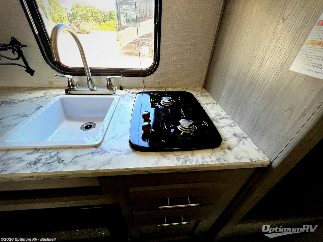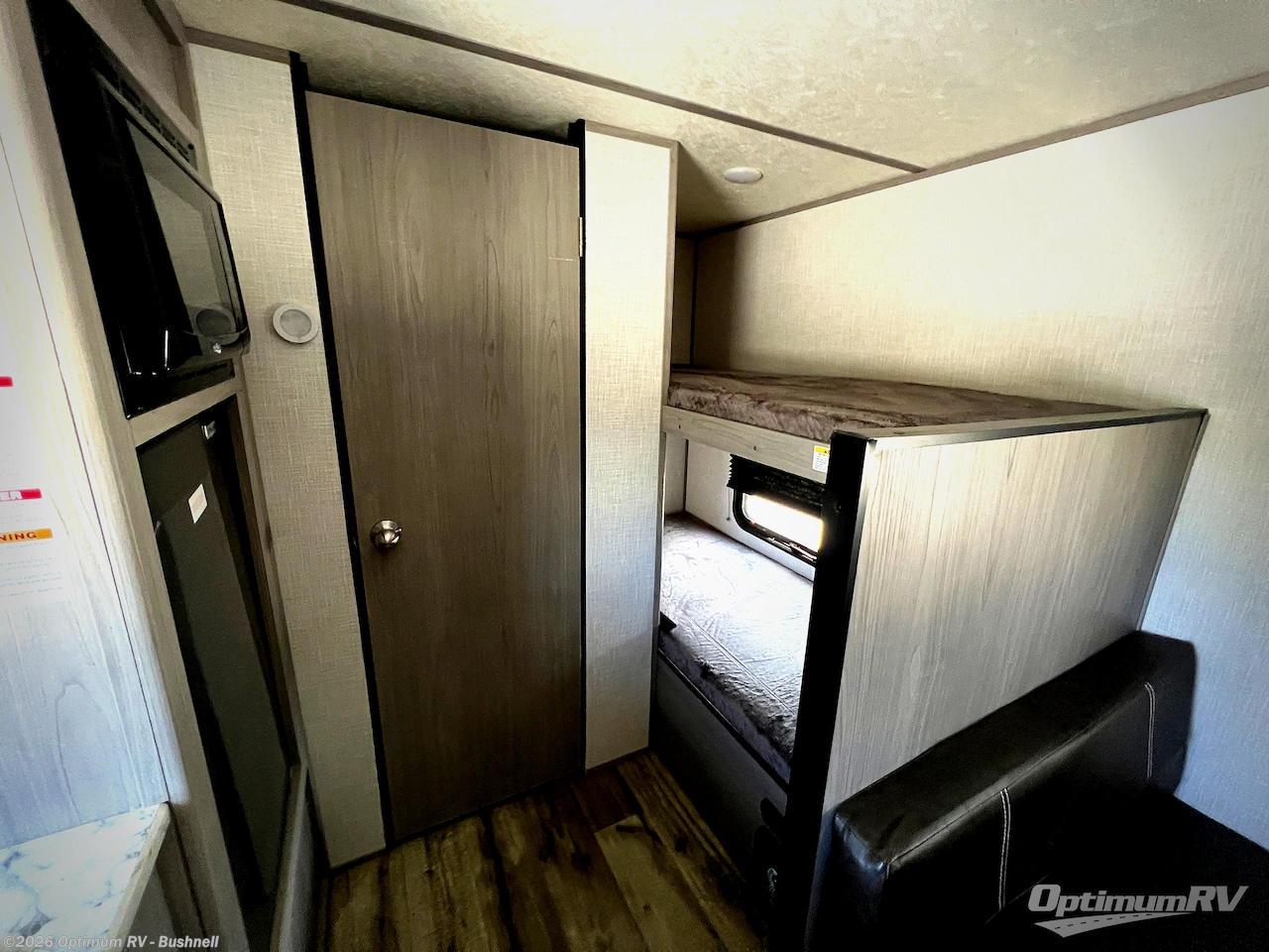 After making dinner on the two burner cooktop or inside the microwave, you can dine at the booth dinette or outside under the 8' power awning if you brought along your camping chairs. Either way you will be comfortable and the dinette may even sleep one person if needed. After playing outdoors all day, everyone can return to get cleaned up in the private toilet and shower room then fall asleep on the queen bed up front or the bunk beds in the rear. And everyone can wake up the next morning to do it over again.