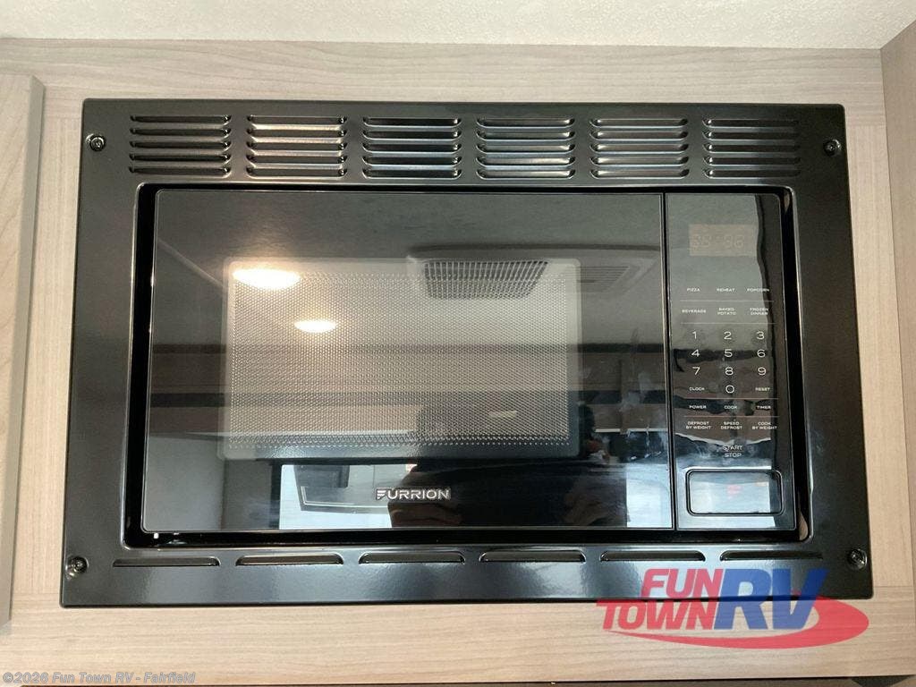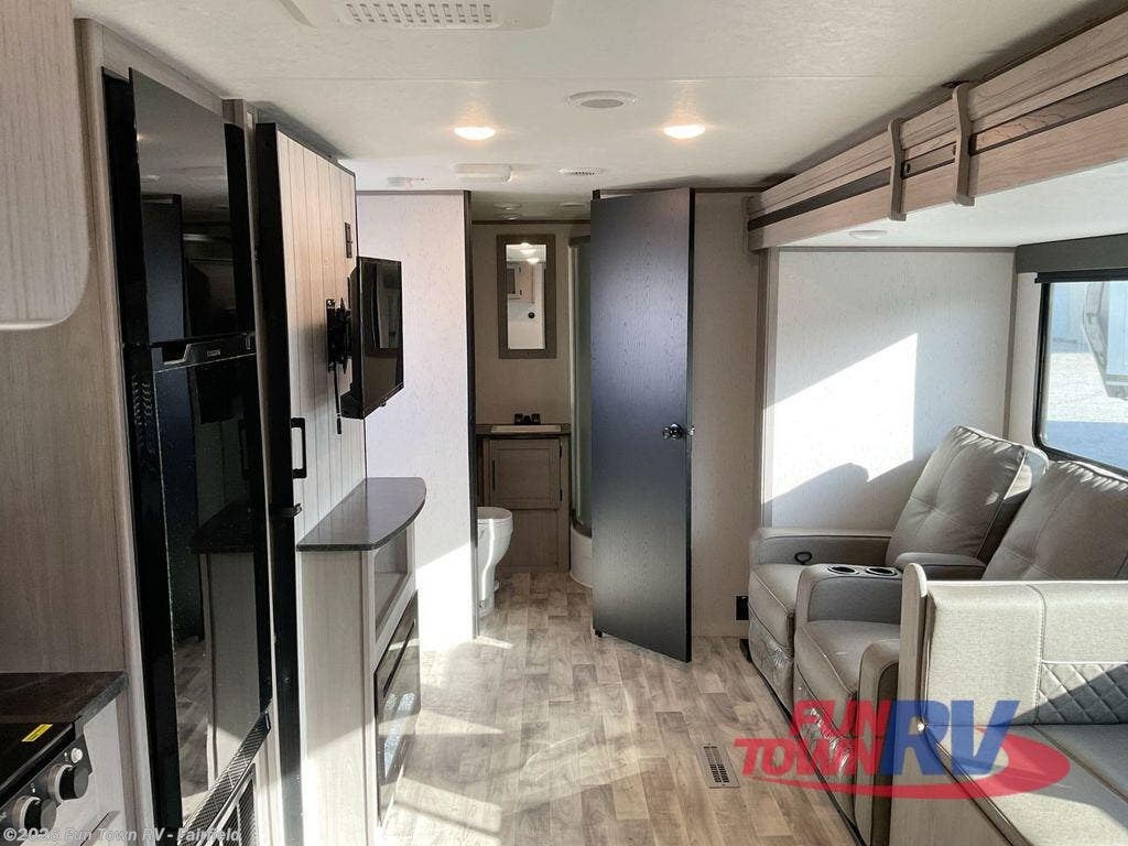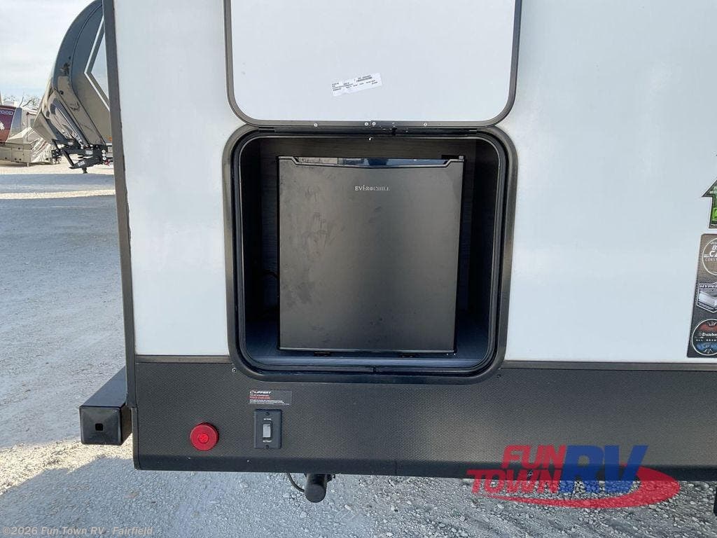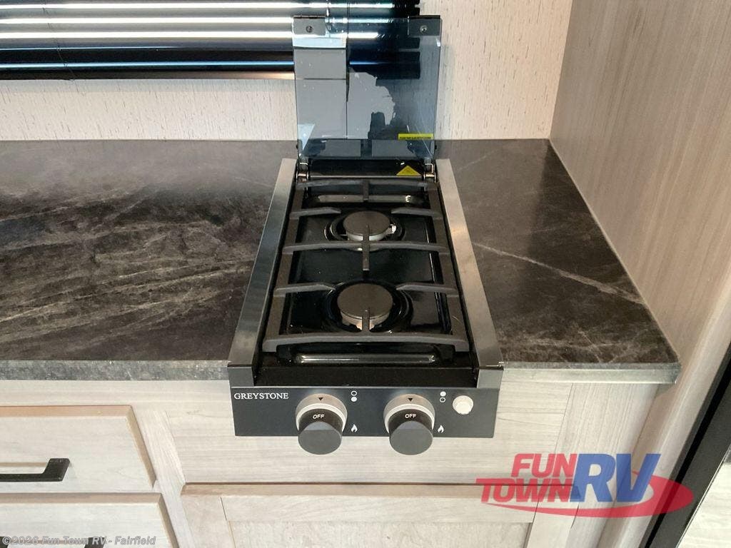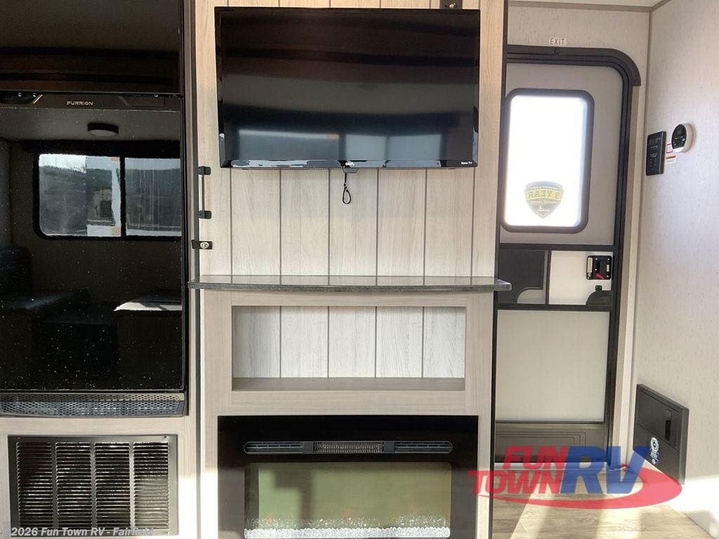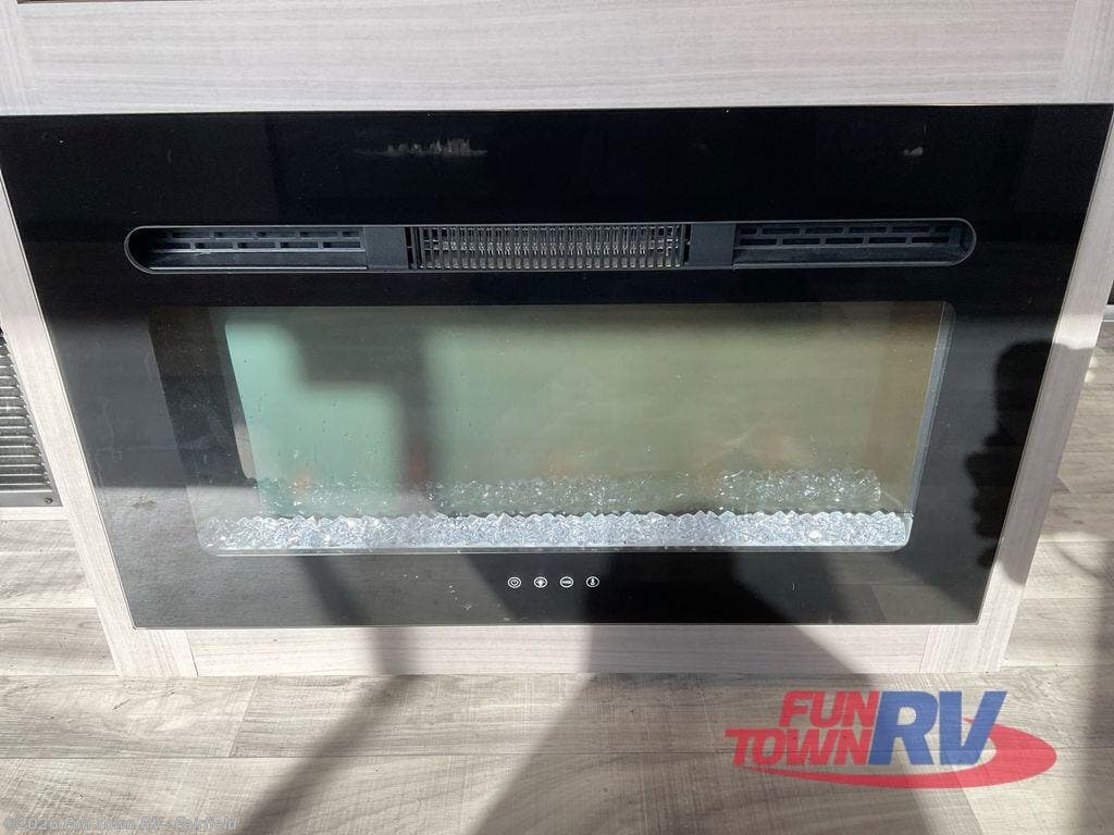This travel trailer is ready to provide you with a home-like environment while you're at the campground. You can prepare meals each day on the three burner cooktop or in the microwave oven, and there is a 10 cu. ft. 12V refrigerator for perishables. Dine at the booth dinette or take your plate outdoors to sit under the 14' power awning with LED lights. There are also theater seats inside if you want to stay close to the fireplace with a good book instead. The full rear bath includes plenty of storage space, and the front private bedroom with a queen bed will feel just like home!