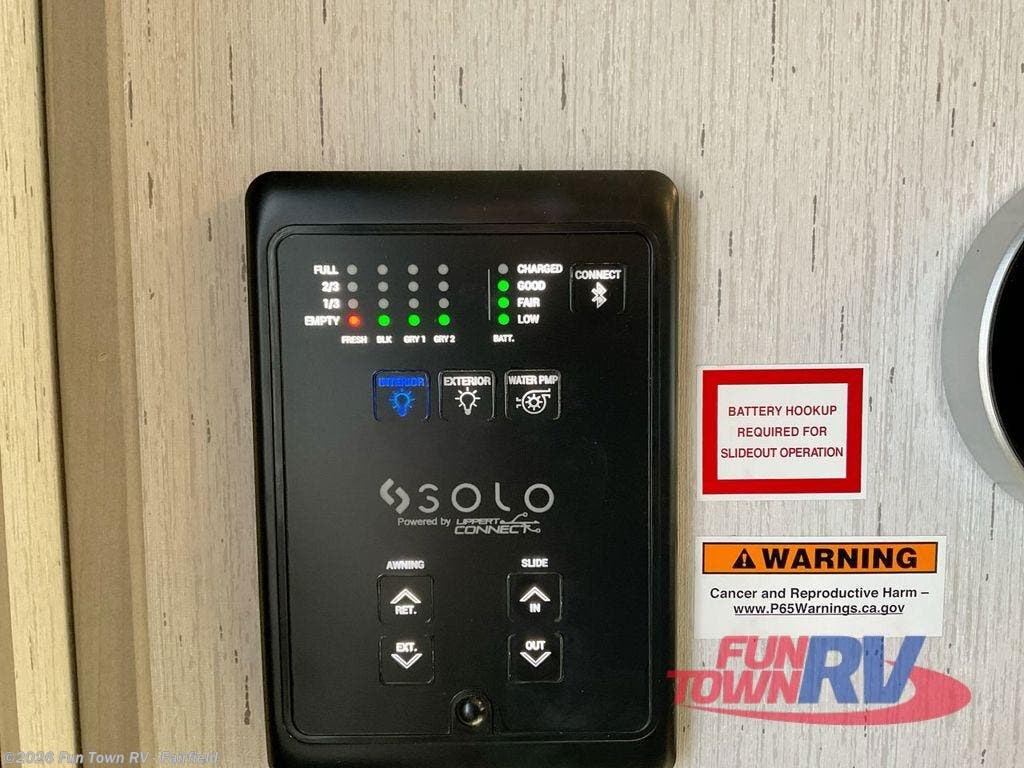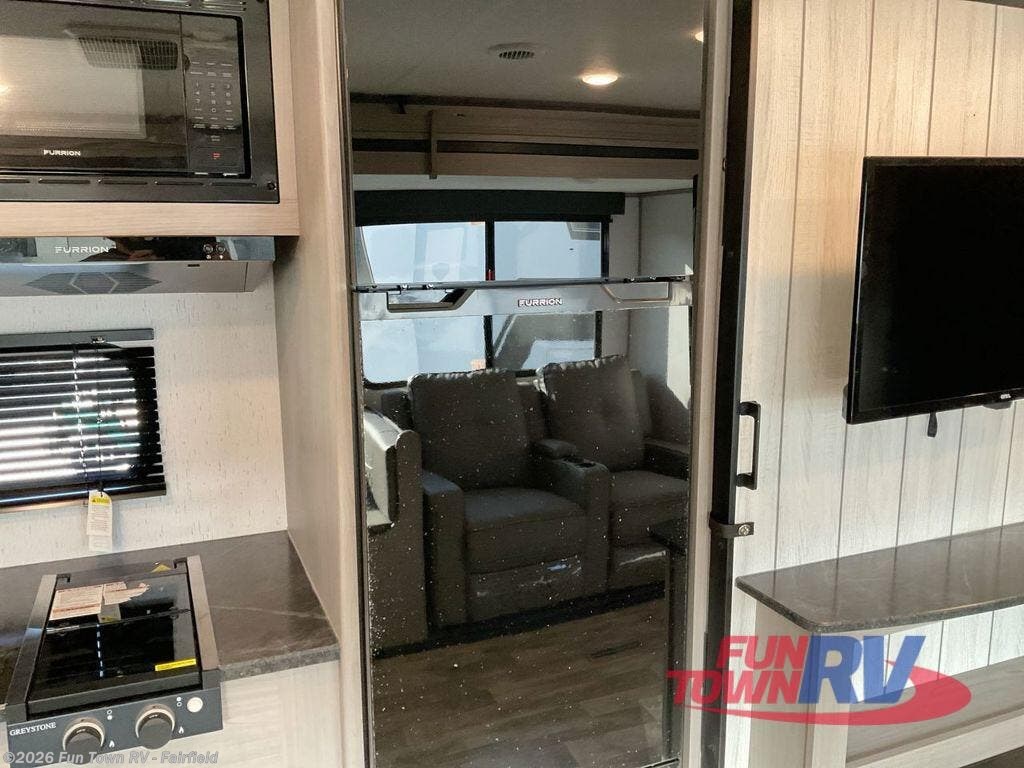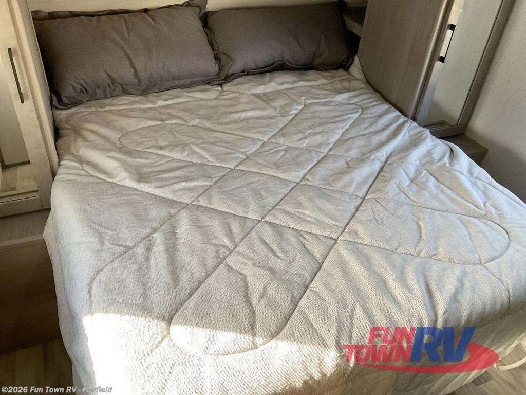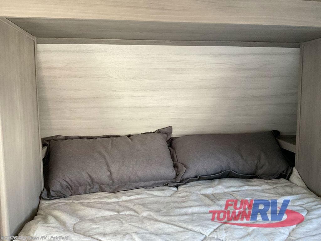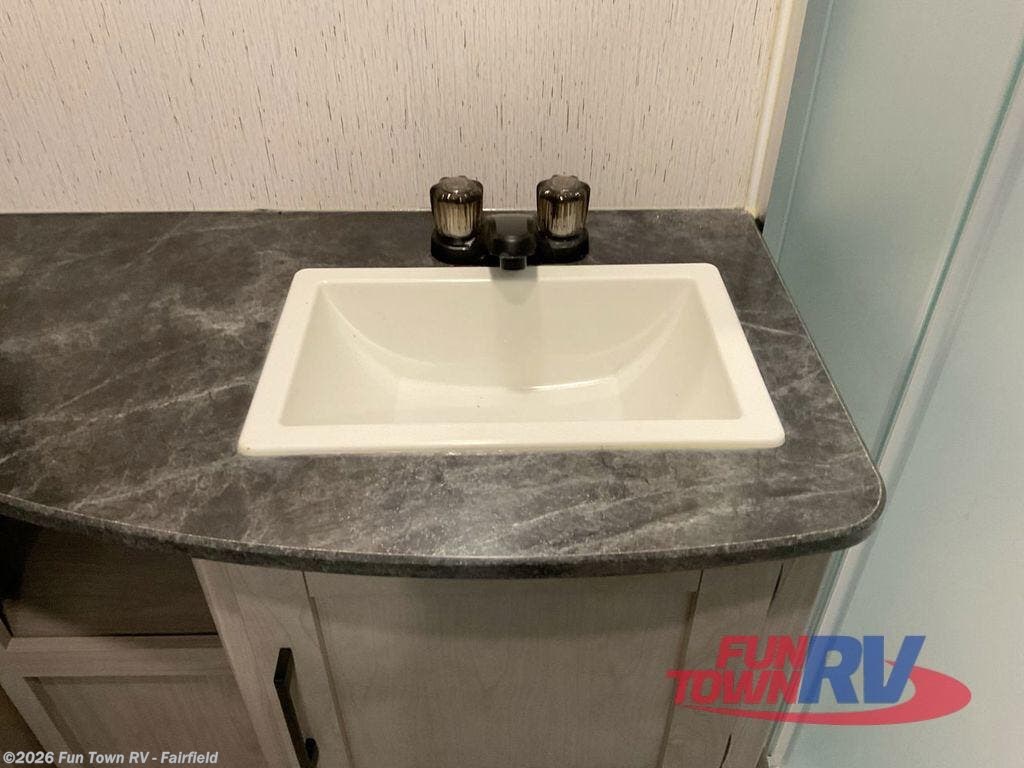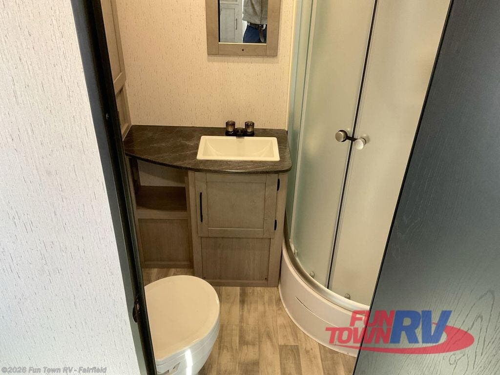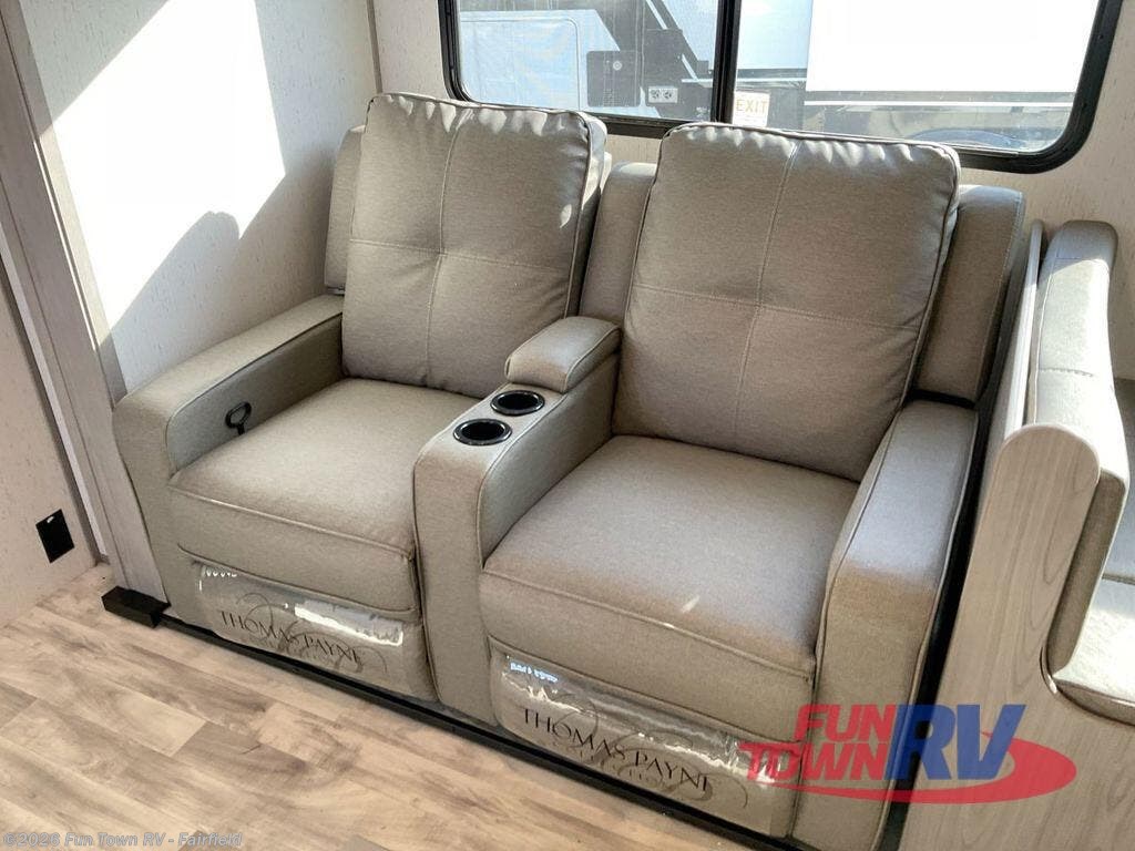 This travel trailer is ready to provide you with a home-like environment while you're at the campground. You can prepare meals each day on the three burner cooktop or in the microwave oven, and there is a 10 cu. ft. 12V refrigerator for perishables. Dine at the booth dinette or take your plate outdoors to sit under the 14' power awning with LED lights. There are also theater seats inside if you want to stay close to the fireplace with a good book instead. The full rear bath includes plenty of storage space, and the front private bedroom with a queen bed will feel just like home!