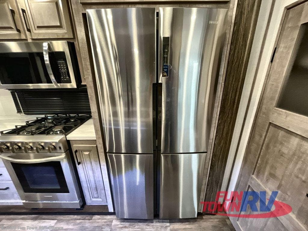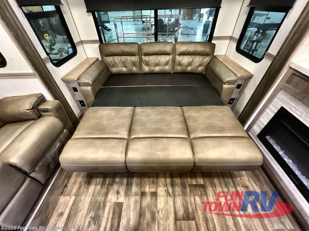 Take your adventures to new heights with this Yukon fifth wheel which features the largest oven in the industry, as well as a large kitchen island which will make meal prep a breeze. The master suite houses a king bed slide and 50" TV, and there is another 50" TV in the main living area at the entertainment center with a fireplace below. Next to the pantry door, you will find a coffee bar station just inside the entry door. Here you can have your coffee easily accessible whether you are inside or out. A free-standing dinette is a great place to sit while you enjoy a meal, and the large pantry will hold your favorite snacks. Spend some time relaxing on either the theater seat for two, or the rear sofa that can be converted to added sleeping space if needed.
