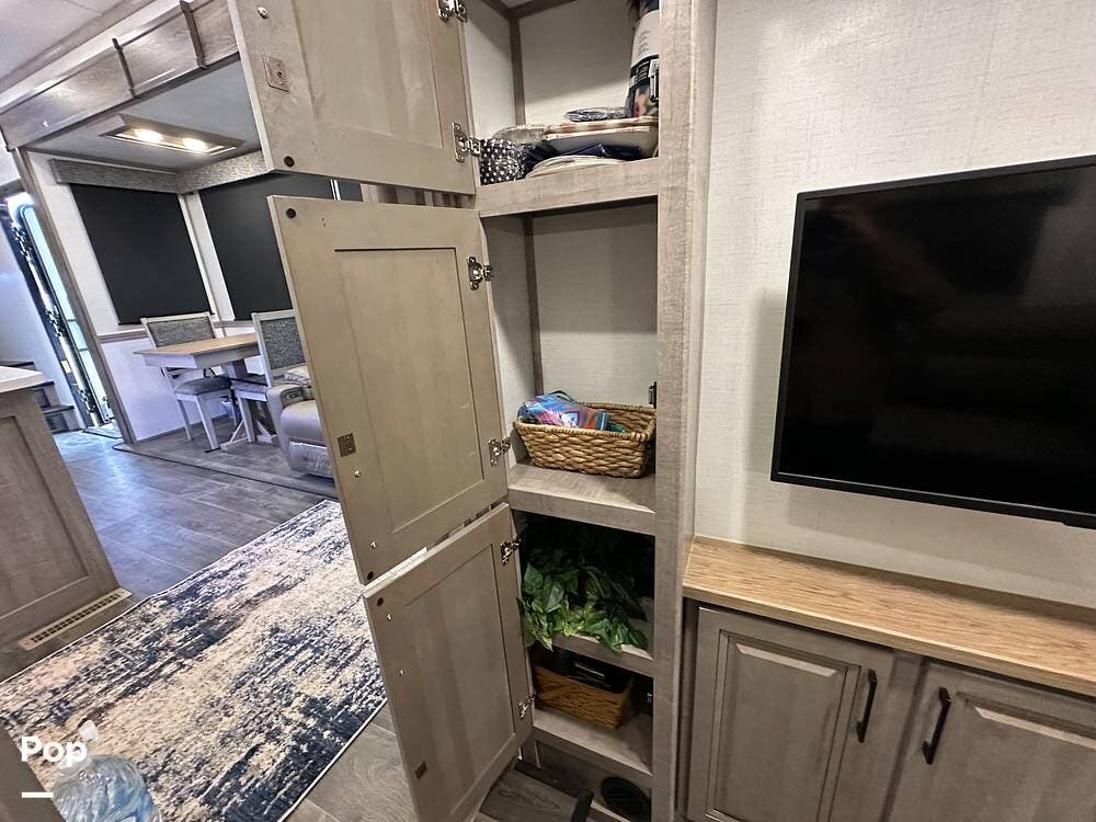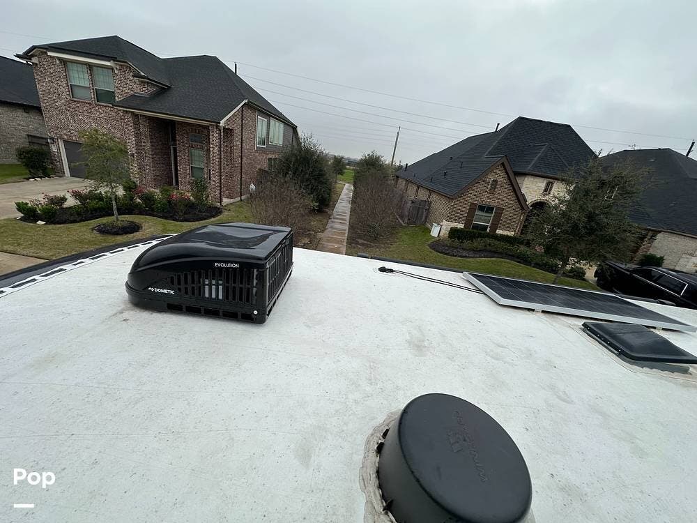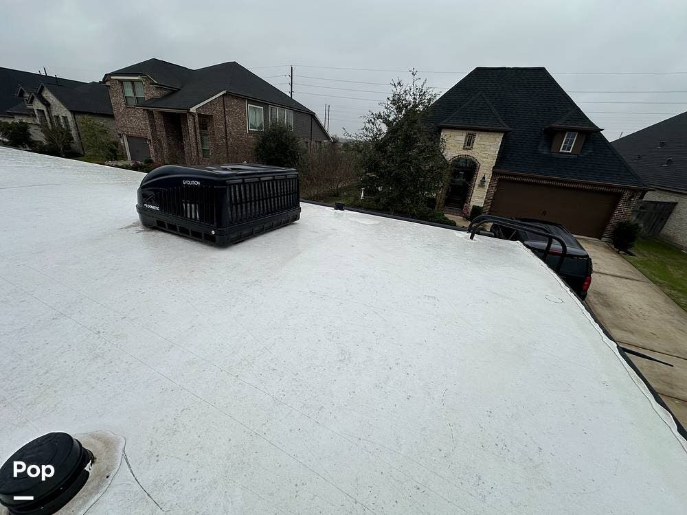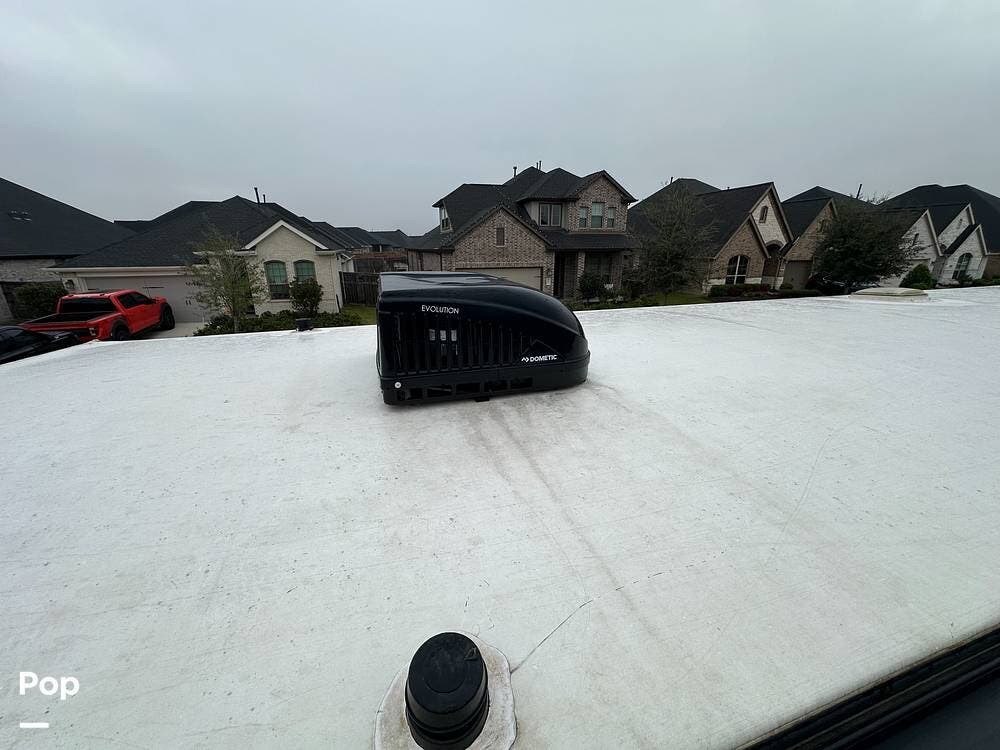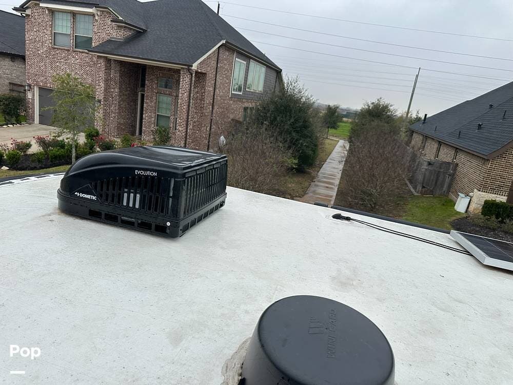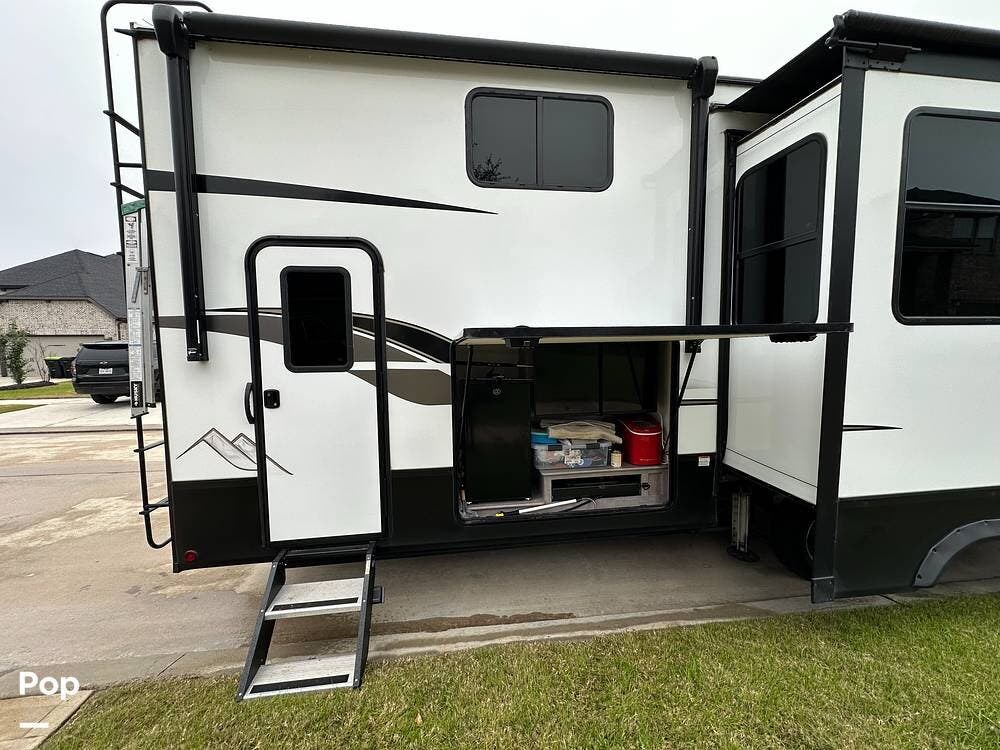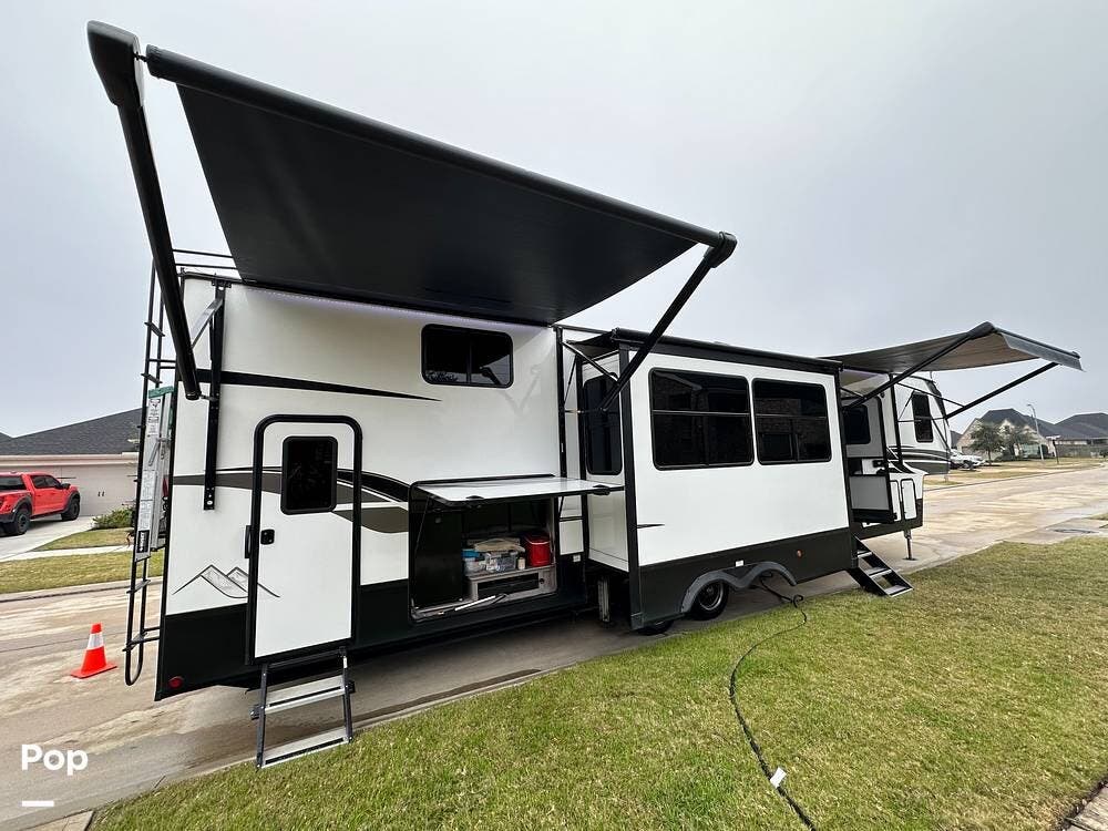 Outside, it has three A/Cs to keep you comfortable in all weather conditions, large storage areas with slide-outs for easy access to items, a roof ladder, and two awnings. All slide-outs have toppers.
