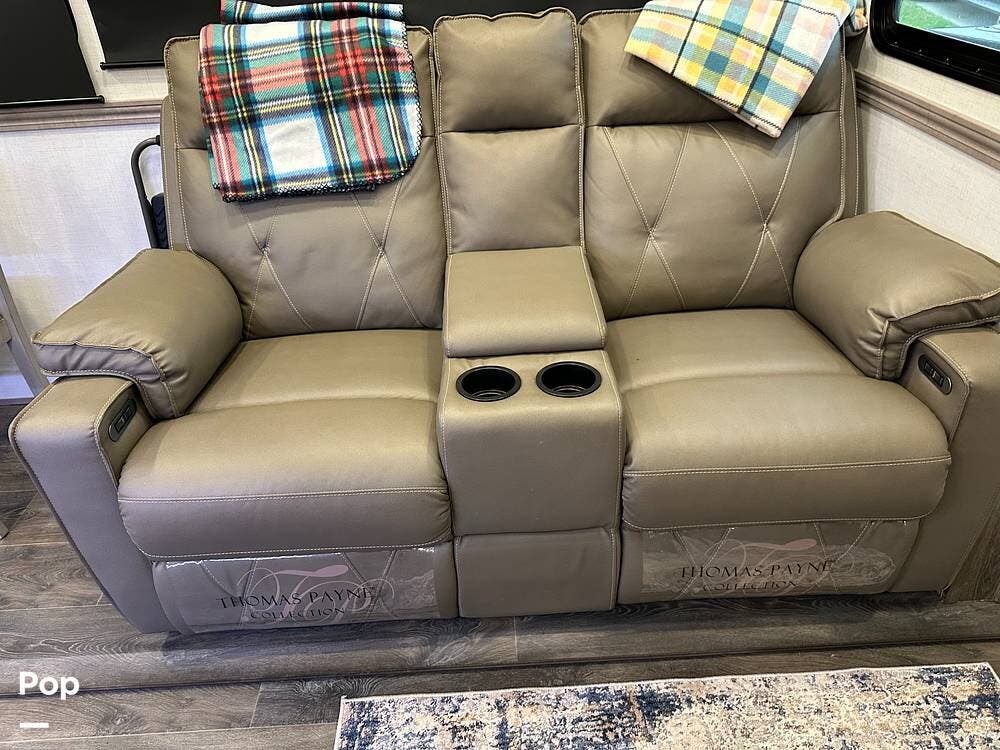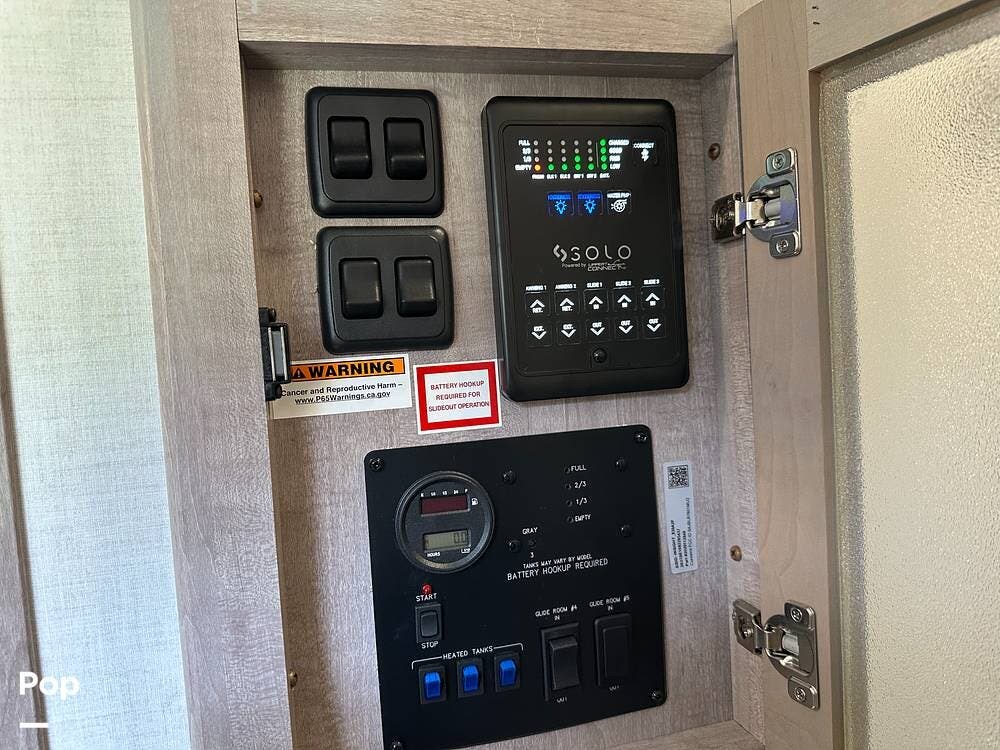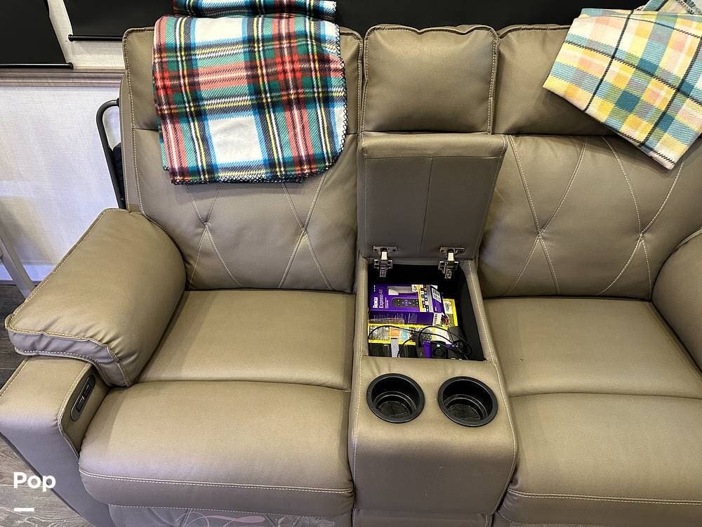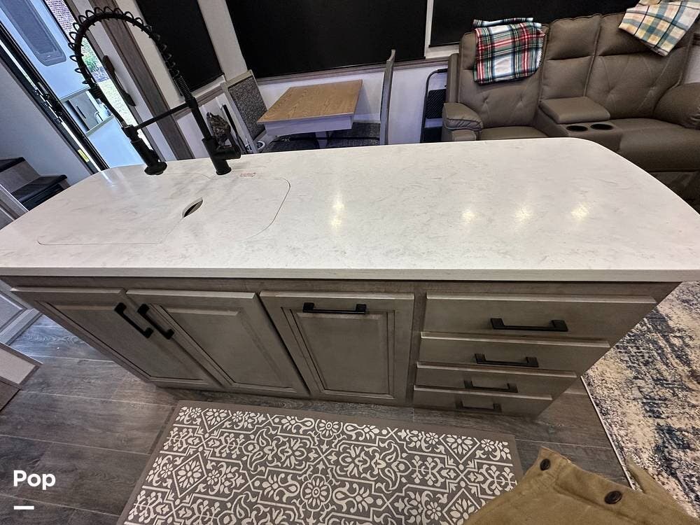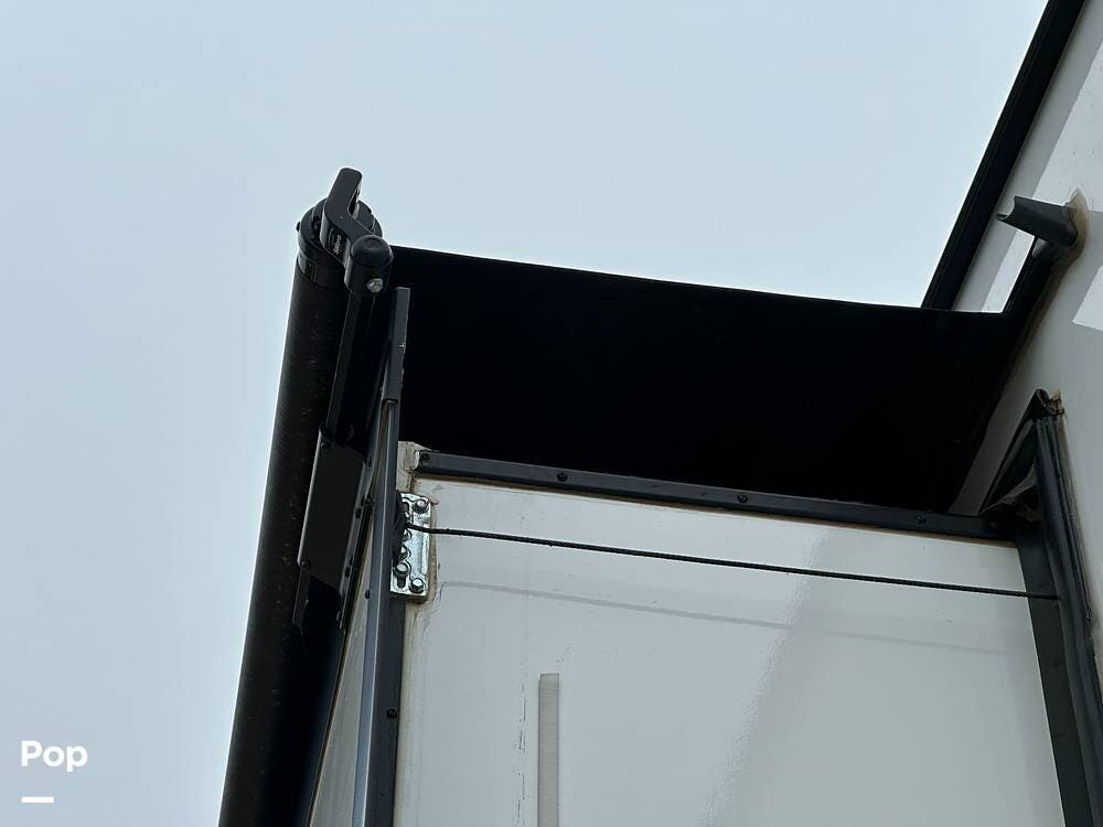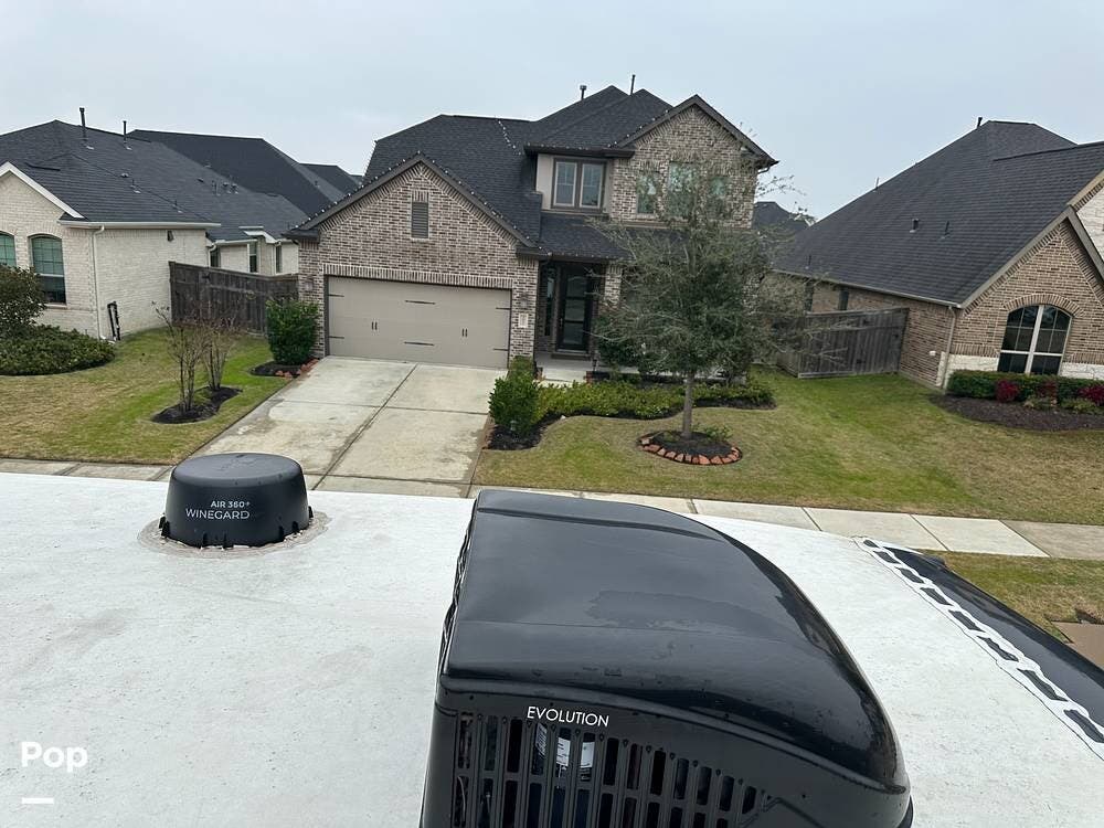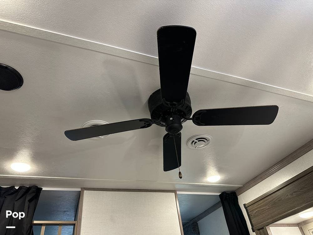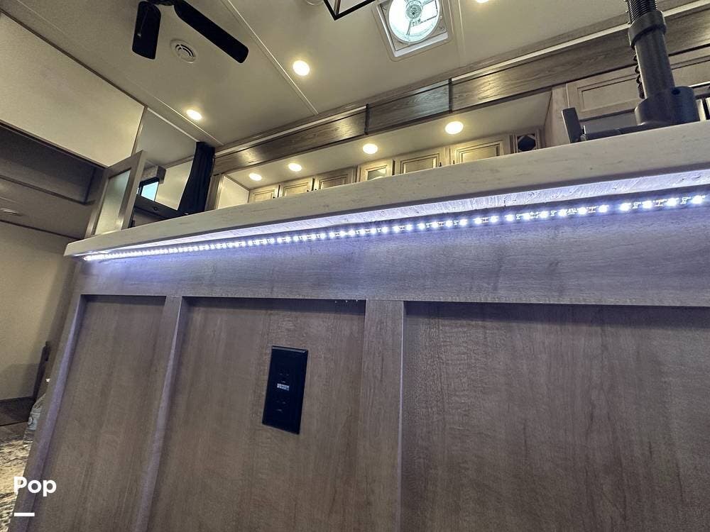 Outside, it has three A/Cs to keep you comfortable in all weather conditions, large storage areas with slide-outs for easy access to items, a roof ladder, and two awnings. All slide-outs have toppers.