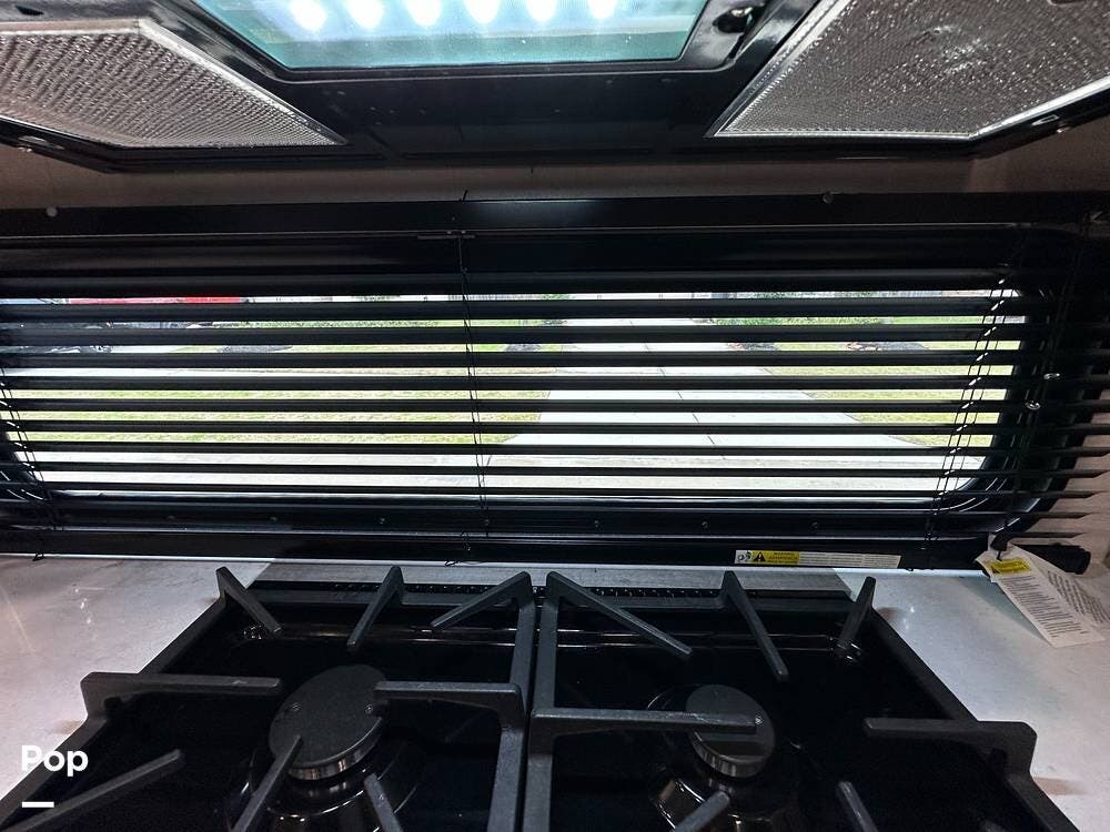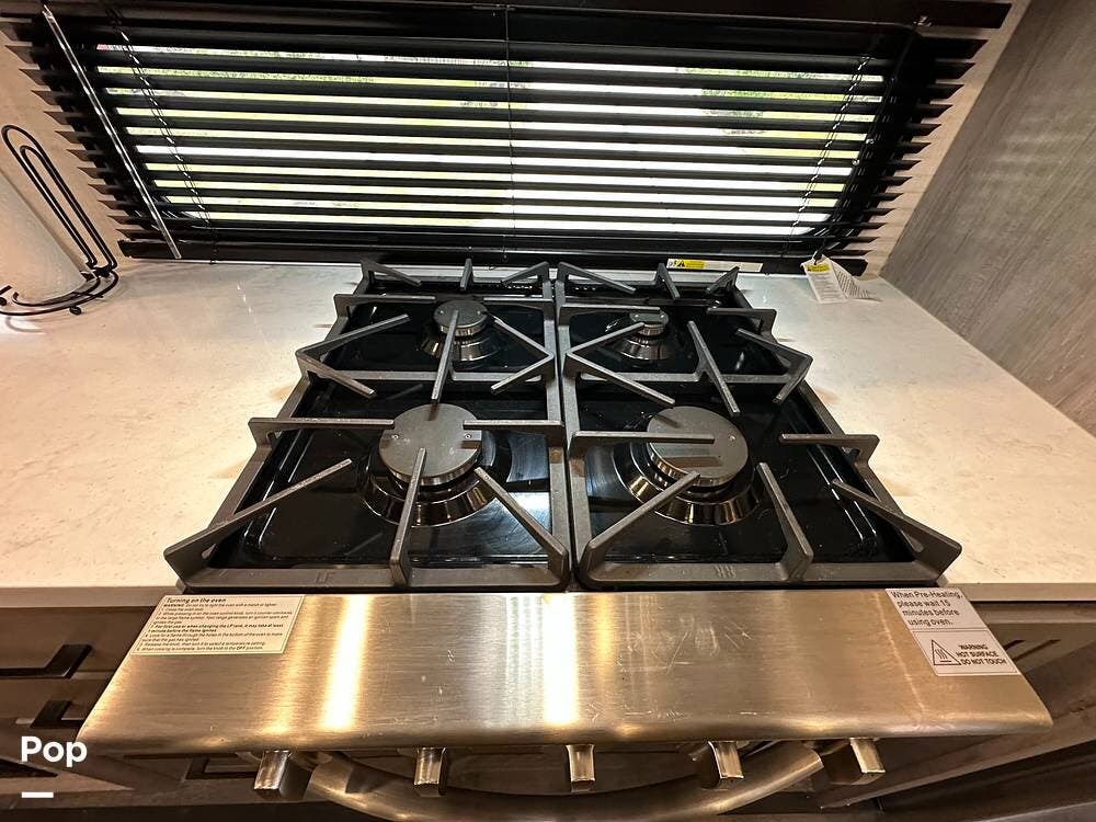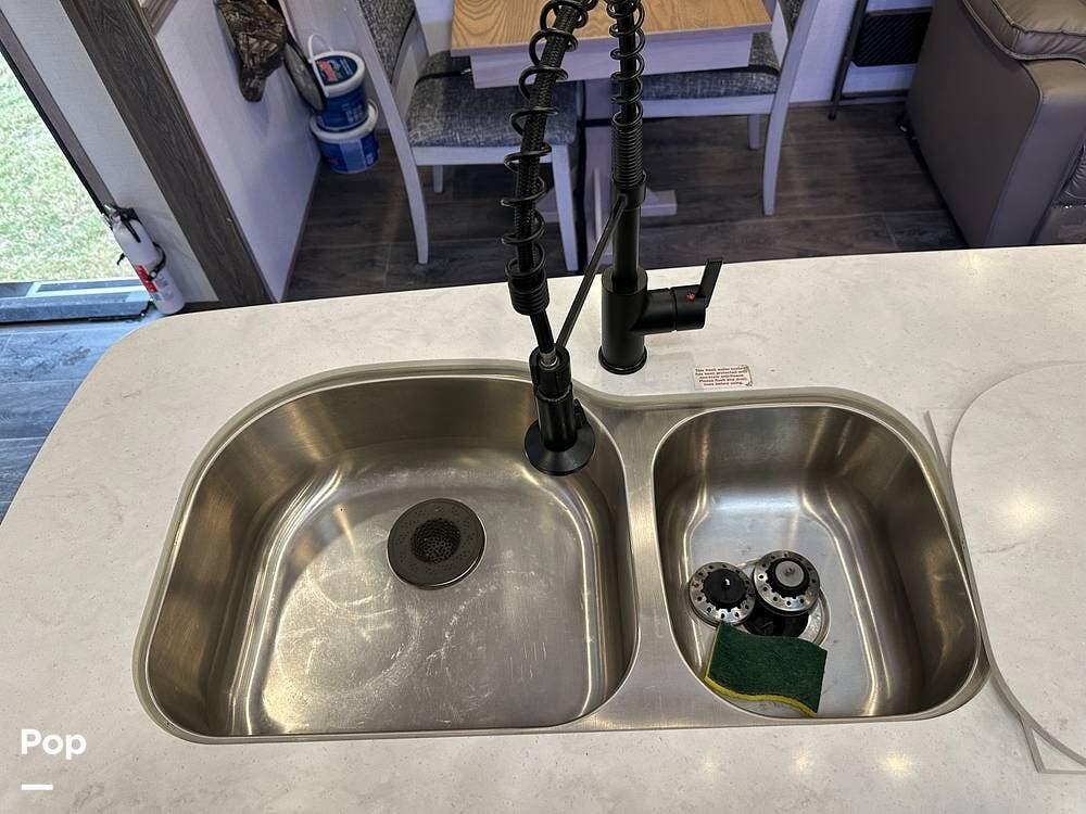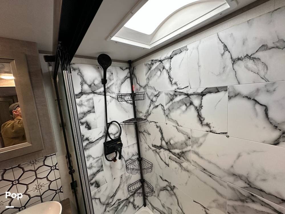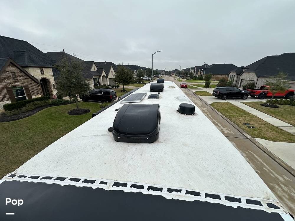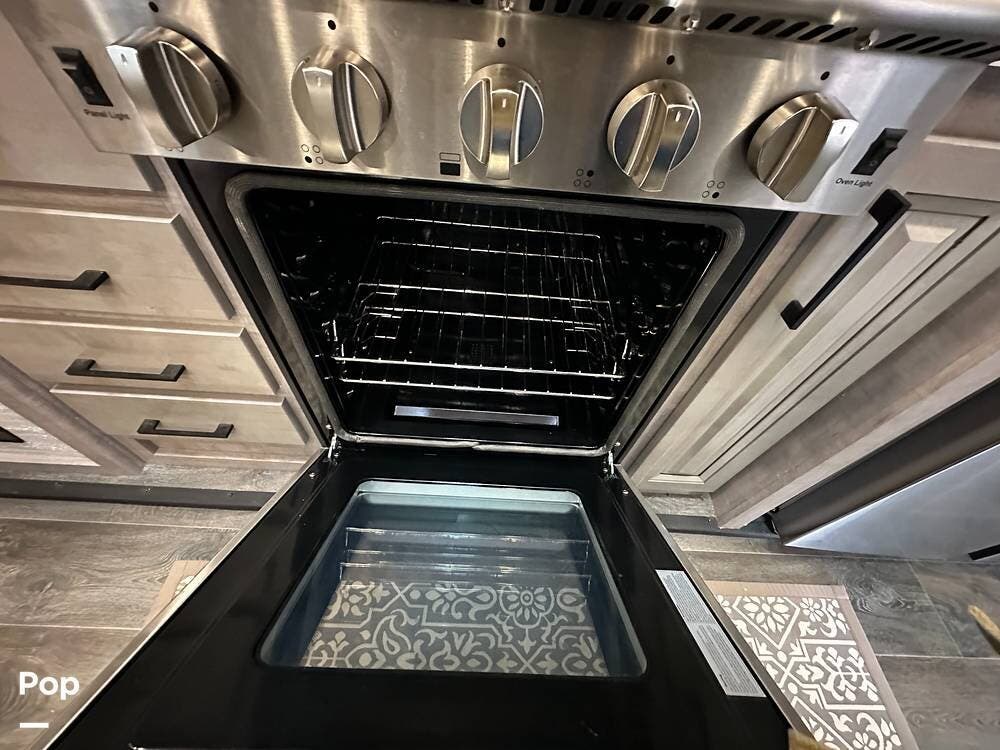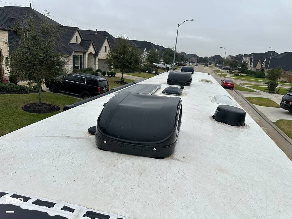 Outside, it has three A/Cs to keep you comfortable in all weather conditions, large storage areas with slide-outs for easy access to items, a roof ladder, and two awnings. All slide-outs have toppers.