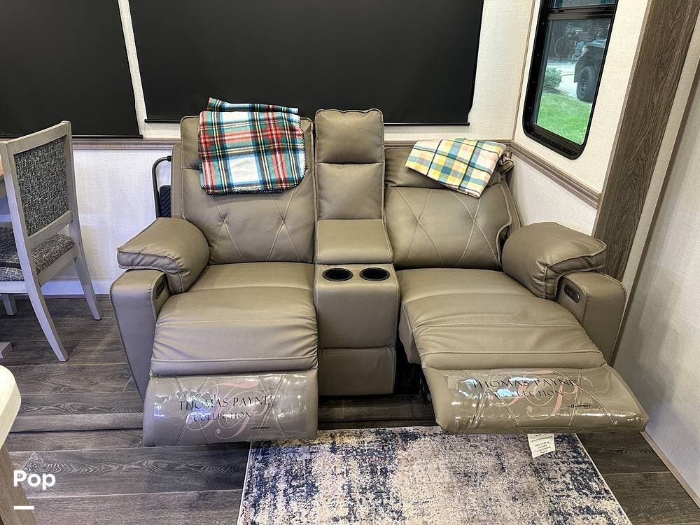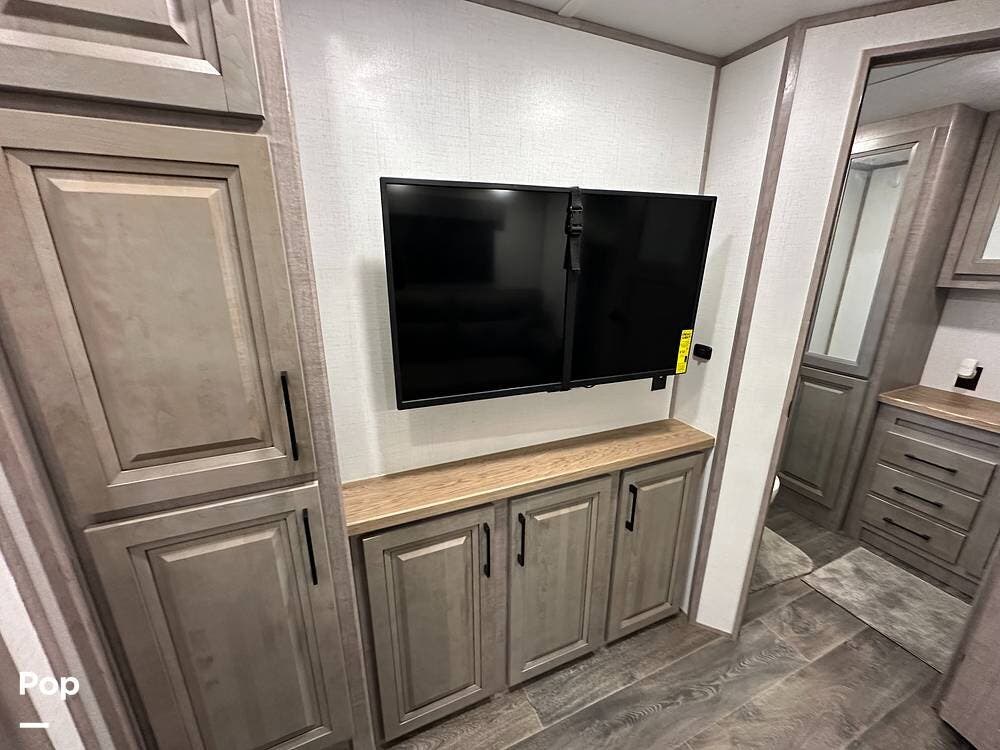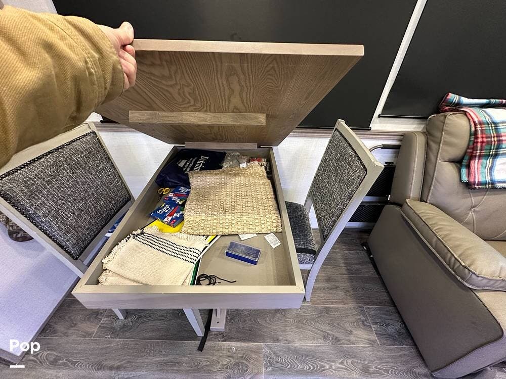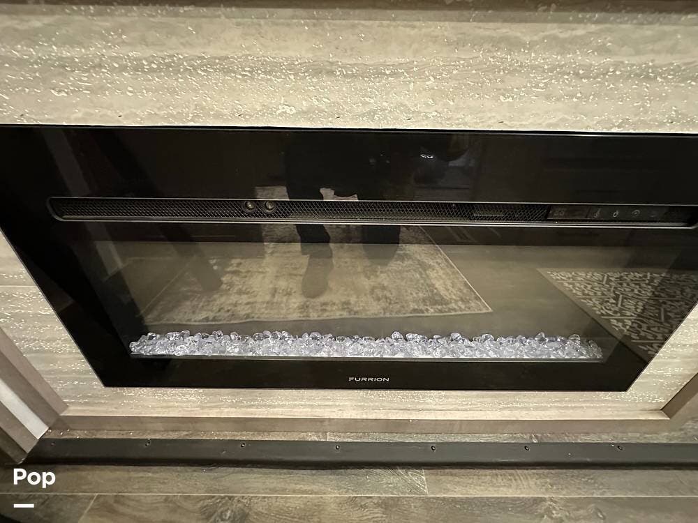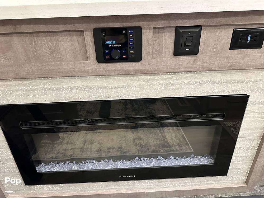 The best part is that the living area has two theater seats and a dining room table with chairs. There is also a large telescoping TV with Surround Sound speakers over a fireplace!