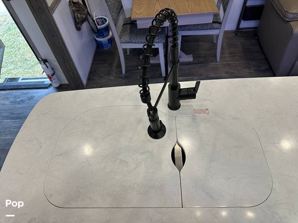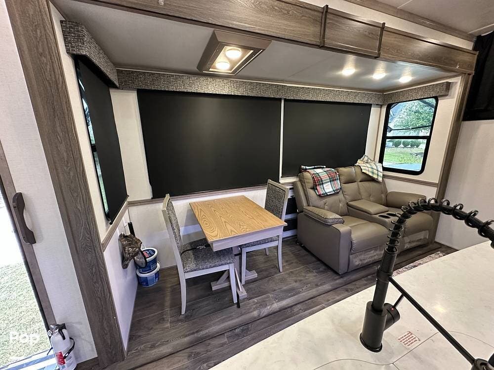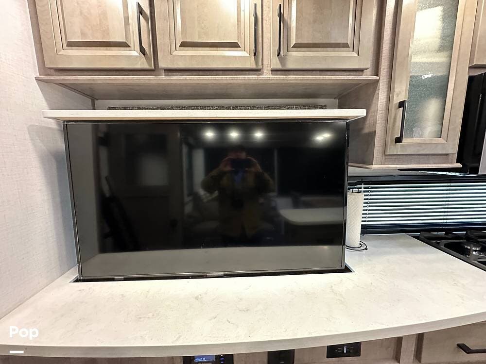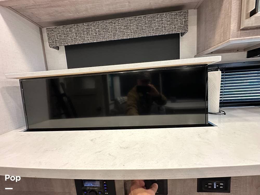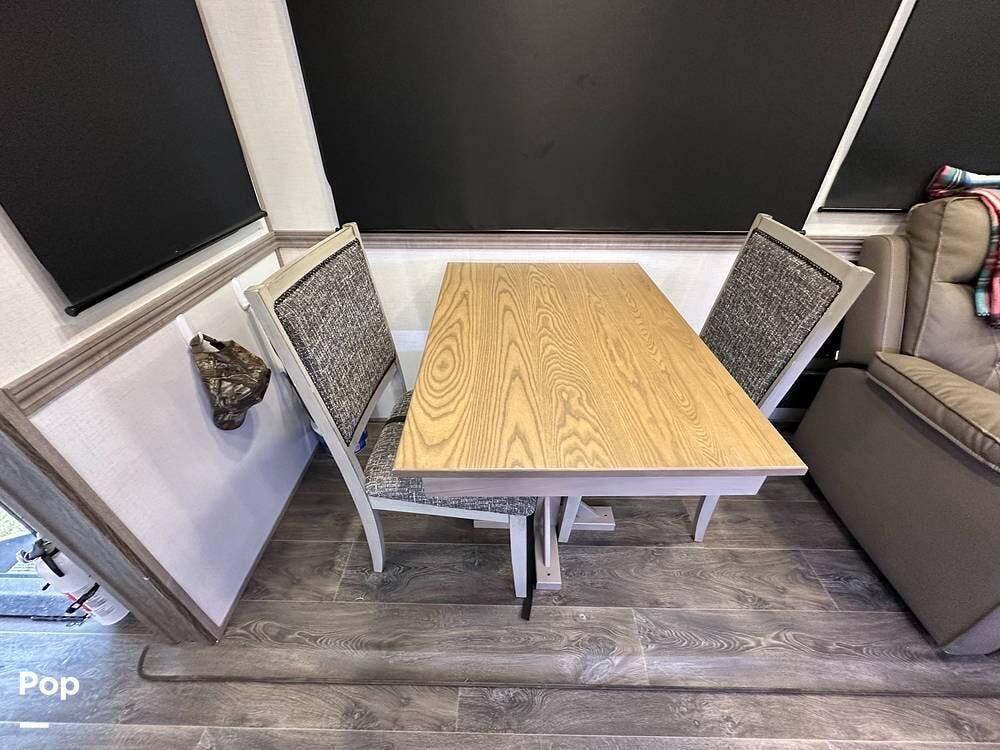 The best part is that the living area has two theater seats and a dining room table with chairs. There is also a large telescoping TV with Surround Sound speakers over a fireplace!