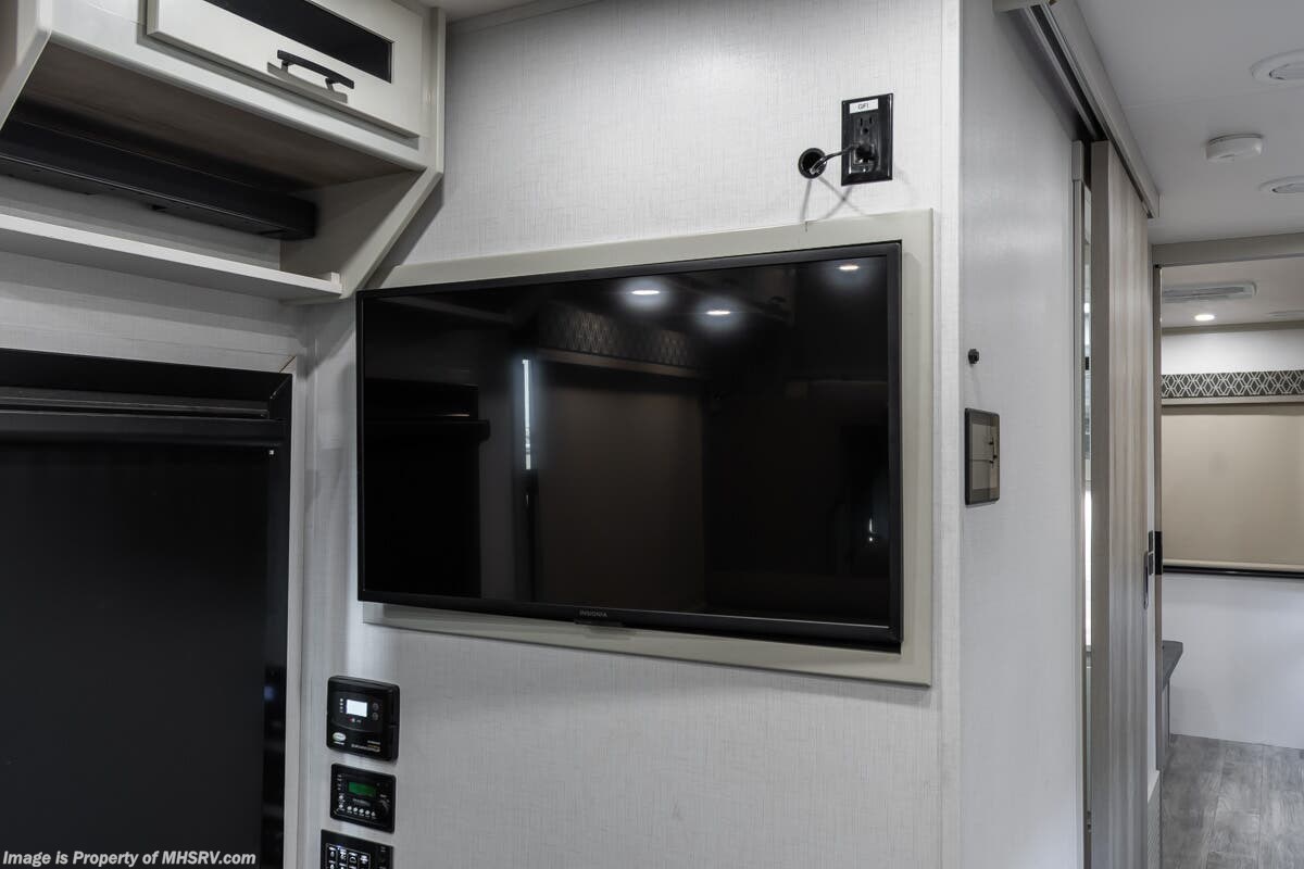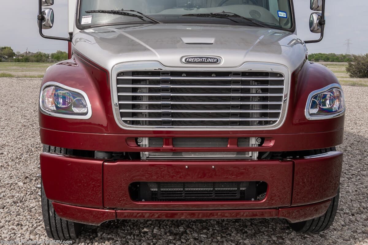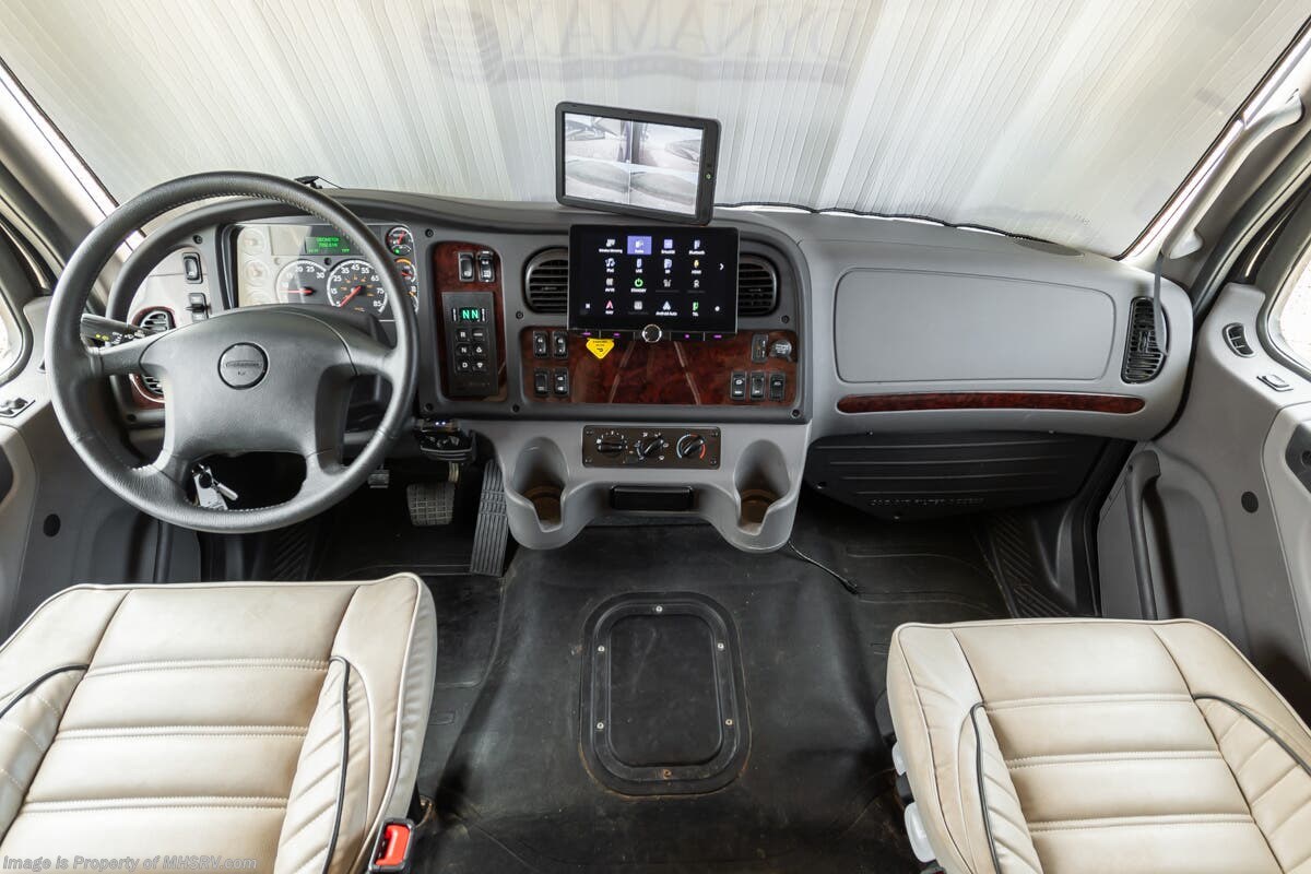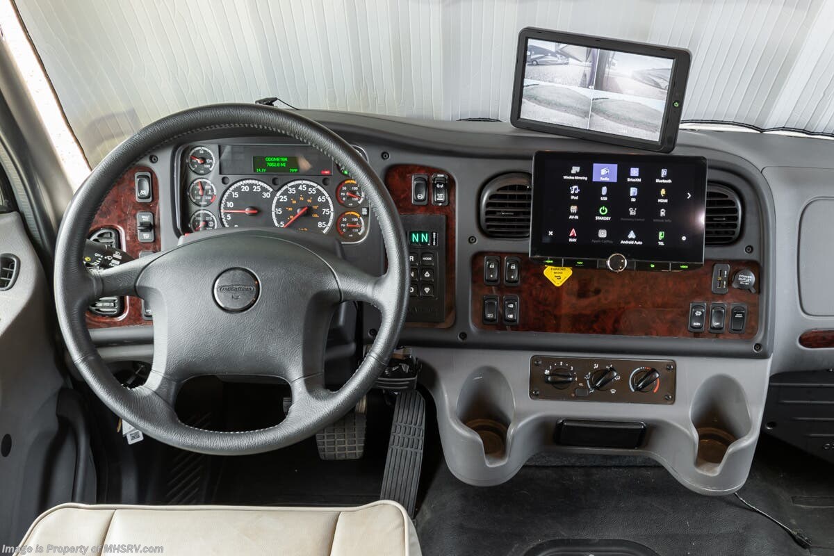More About This RV This RV features equalizer hydraulic leveling, aluminum wheels, full body paint, dual A/C's, 4 Camera system, diesel generator, satellite dish, Cummins 360HP diesel engine, Freightliner chassis, tilt/telescoping steering wheel, secondary engine brake, tire monitoring system, mobile eye, trip tek, GPS, cruise control, power door locks, patio awning, LED running lights, exterior shower, power electrical reel, exterior TV, clear paint mask, fiberglass roof, solar, inverter, leather seating, 7 foot ceiling, multi-plex control panel, convection microwave, residential refrigerator with ice maker, 3 burner gas range, solid surface counter, king bed, overhead loft and much more