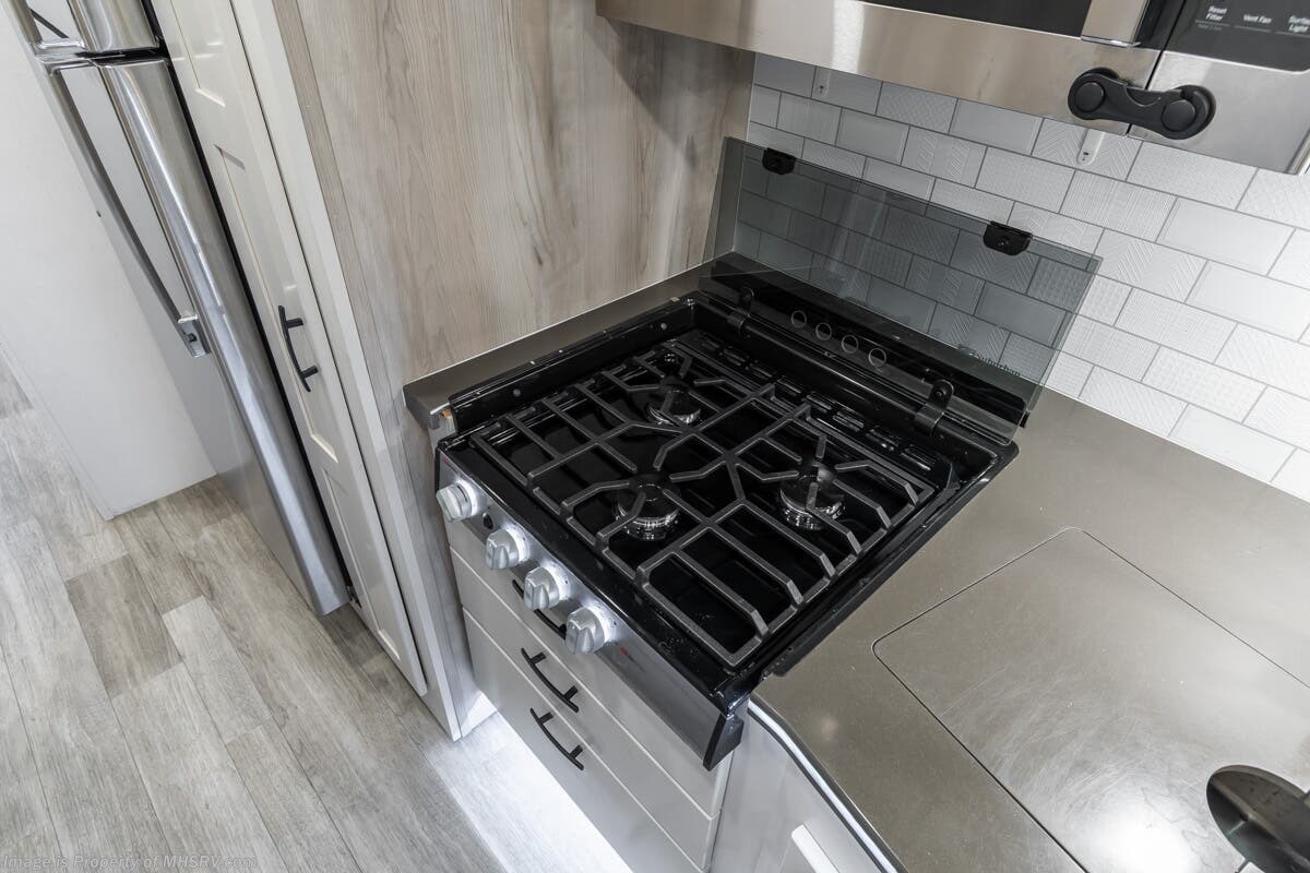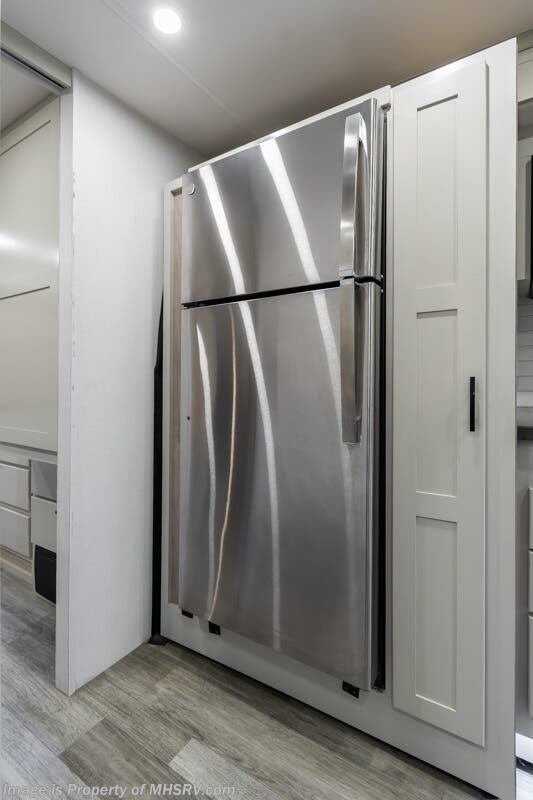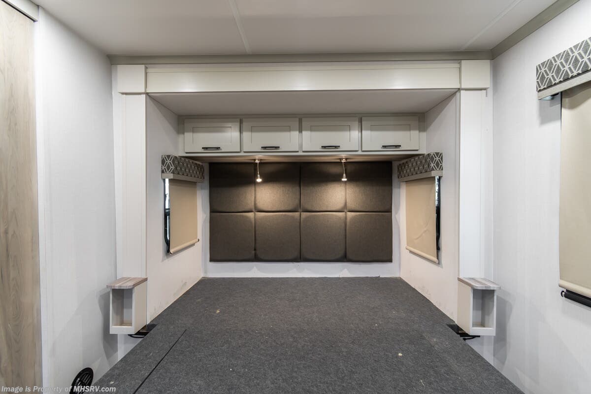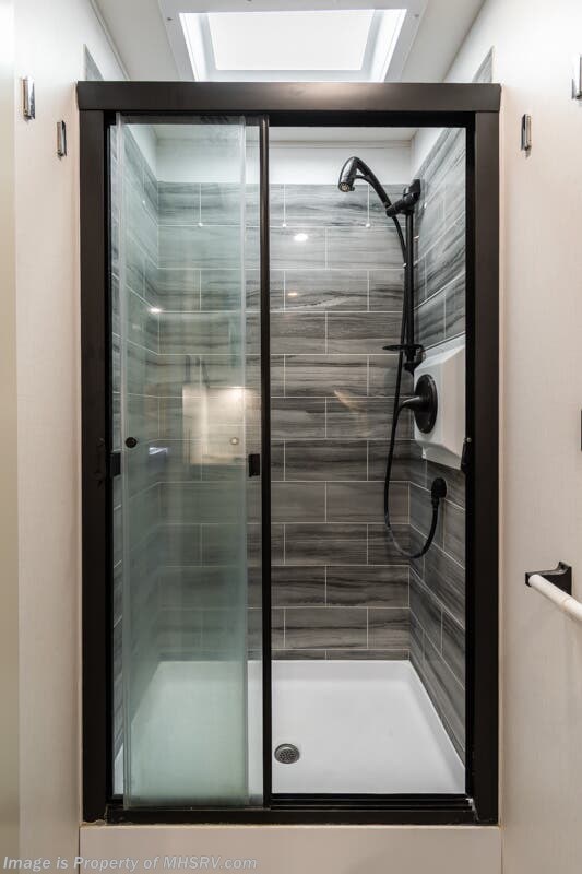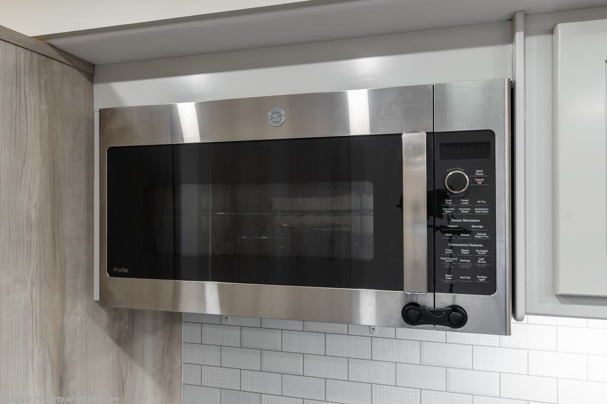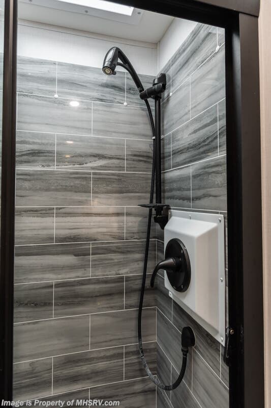 More About This RV This RV features equalizer hydraulic leveling, aluminum wheels, full body paint, dual A/C's, 4 Camera system, diesel generator, satellite dish, Cummins 360HP diesel engine, Freightliner chassis, tilt/telescoping steering wheel, secondary engine brake, tire monitoring system, mobile eye, trip tek, GPS, cruise control, power door locks, patio awning, LED running lights, exterior shower, power electrical reel, exterior TV, clear paint mask, fiberglass roof, solar, inverter, leather seating, 7 foot ceiling, multi-plex control panel, convection microwave, residential refrigerator with ice maker, 3 burner gas range, solid surface counter, king bed, overhead loft and much more